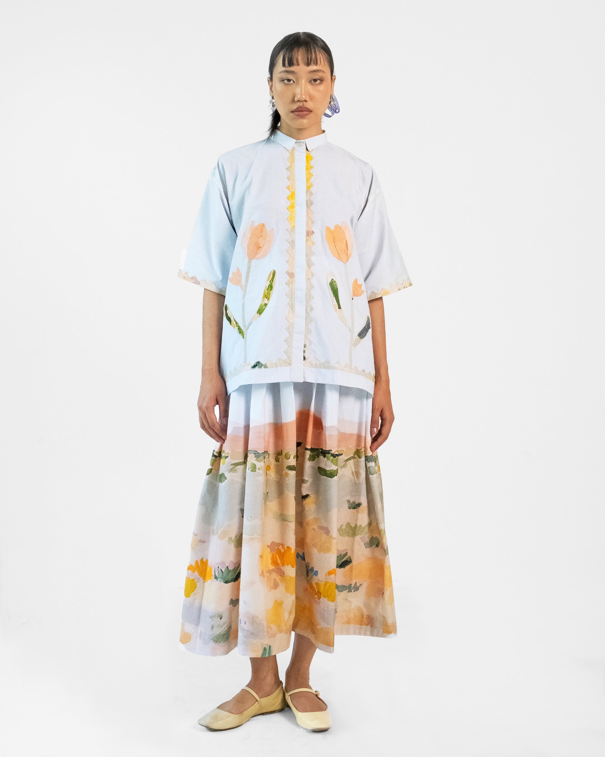 Applique Skirt & Top made from premium cottons, adorned with subtle prints depicting sky and the dessert. The shirt features intricate floral applique details in contrast print fabric patches