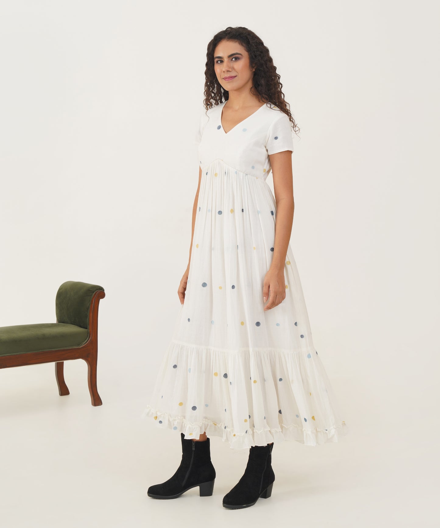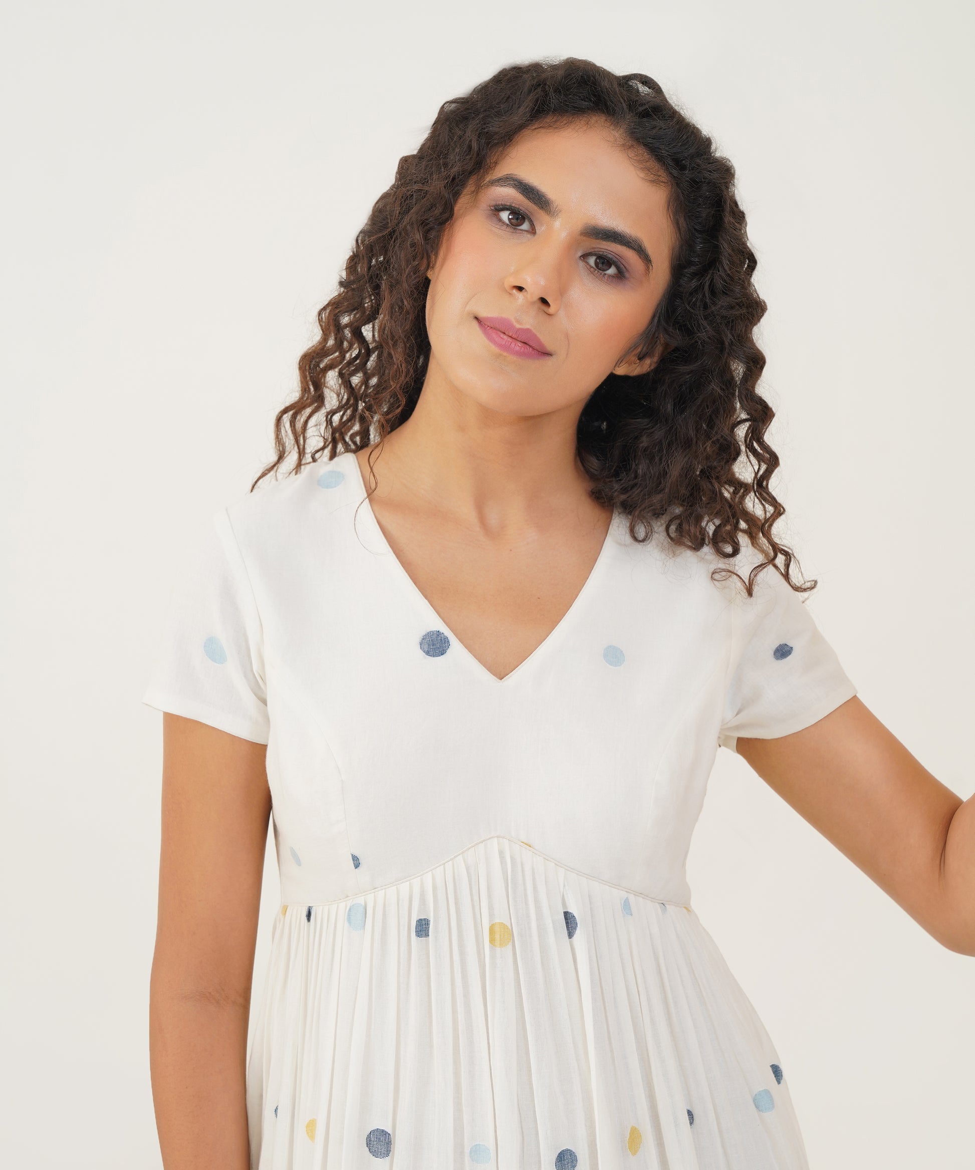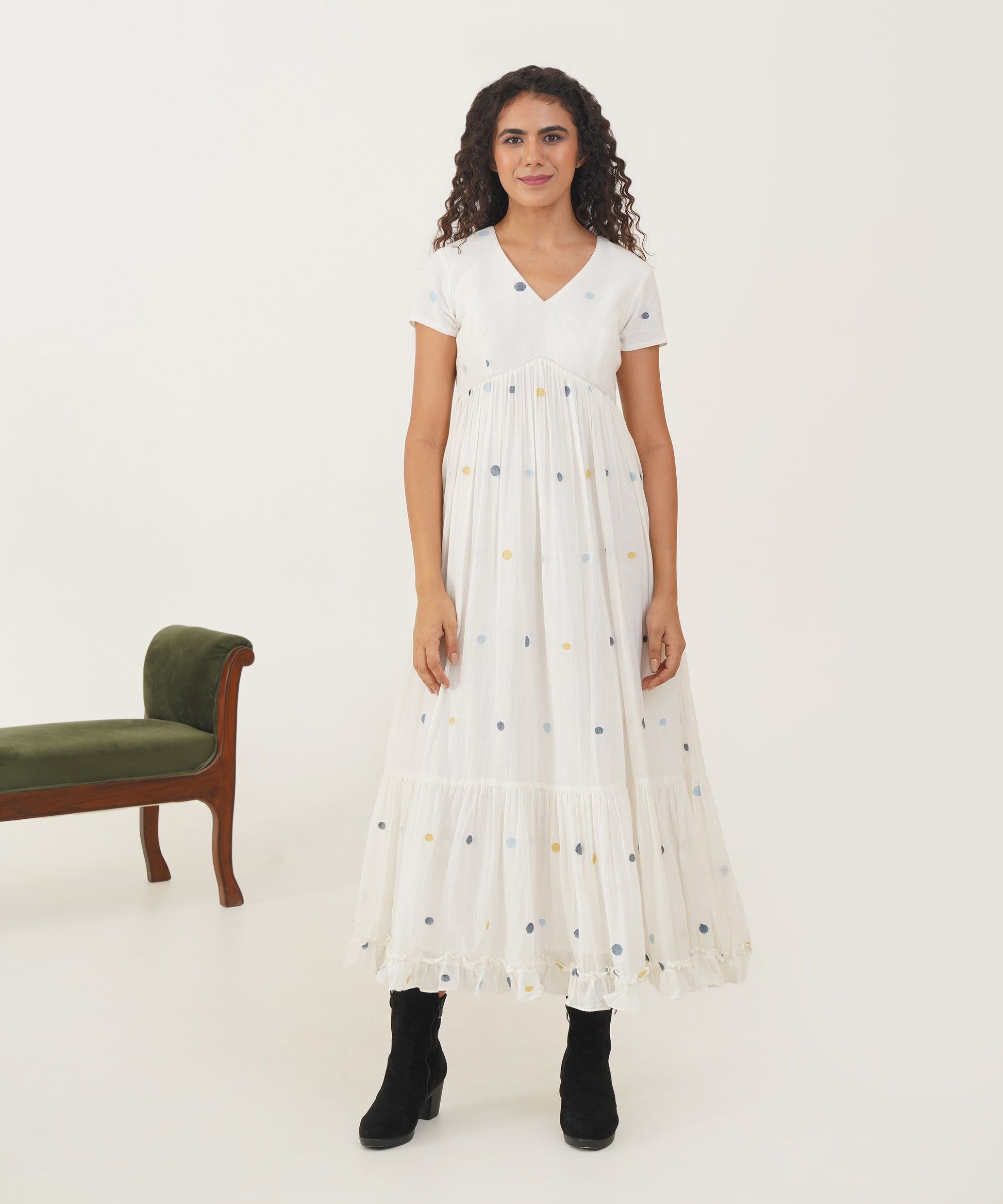 Discover the allure of refined sophistication with our elegant Jamdani dress. Designed with a graceful V-neckline and delicate cap sleeves, this dress exudes timeless charm. The gentle gathers create a flattering silhouette, while the frill detailing at the hem adds a touch of whimsical grace. The back zipper fastening ensures a perfect fit and seamless finish, making this dress a versatile choice for any occasion.