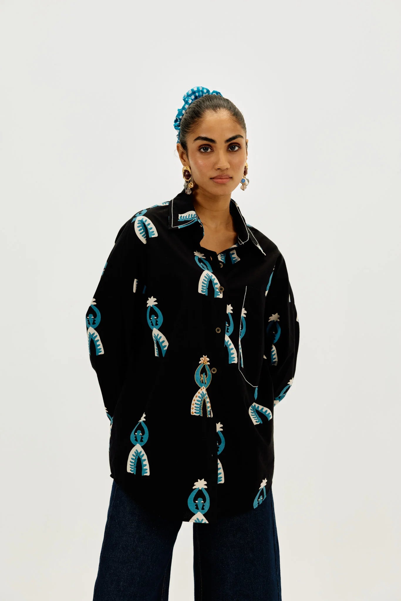 A closet classic, our Africana shirt is elevated with our screen-printed tribal doll motif. Designed in a relaxed silhouette with contrast topstitch detailing, this shirt brings drama to your basics. Style it tucked, untucked, or tied at the waist—it just works.