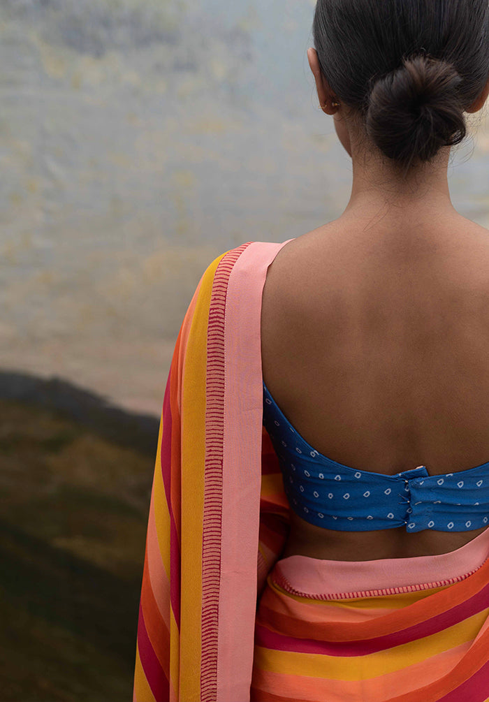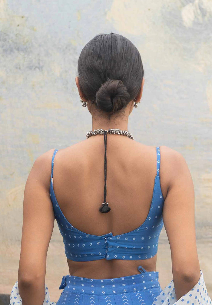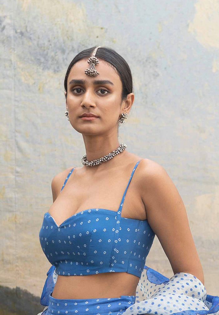 “Afsa” pure silk chanderi bralet features an all over bandhini in white on a bright blue base.