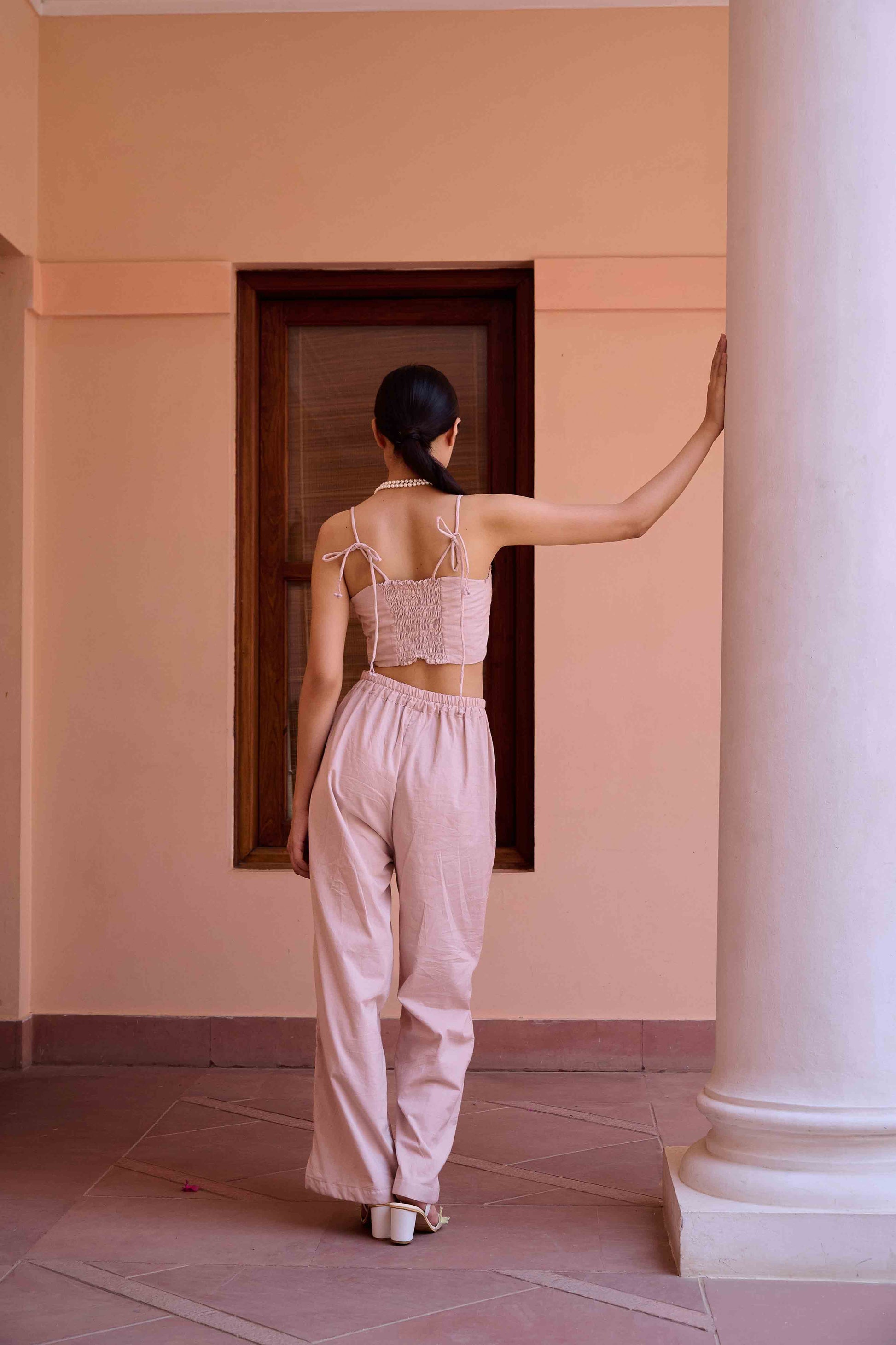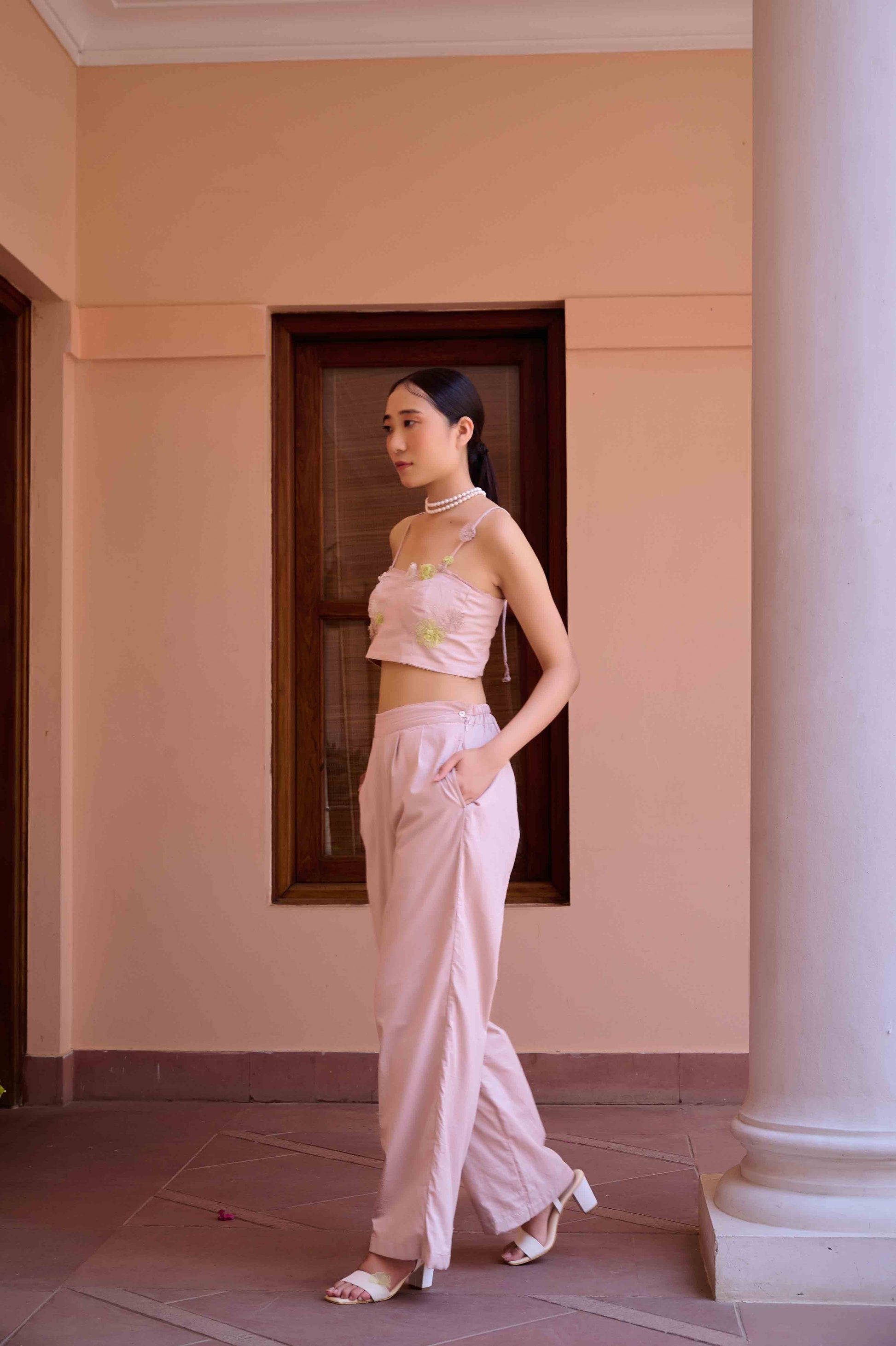 Elevate your wardrobe with our Corset Strap Top featuring intricate organza appliqué and a flattering smocked back. This top effortlessly blends feminine charm with contemporary style, offering a structured silhouette that accentuates your figure elegantly. Paired with our Relax HIGH WAISTED Flared Pants, designed with a convenient side zip for a seamless fit, this ensemble exudes effortless sophistication and versatility.