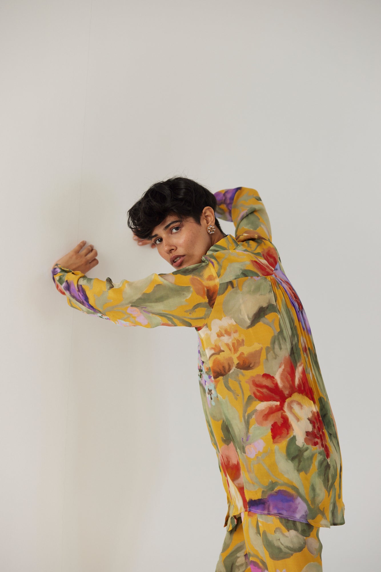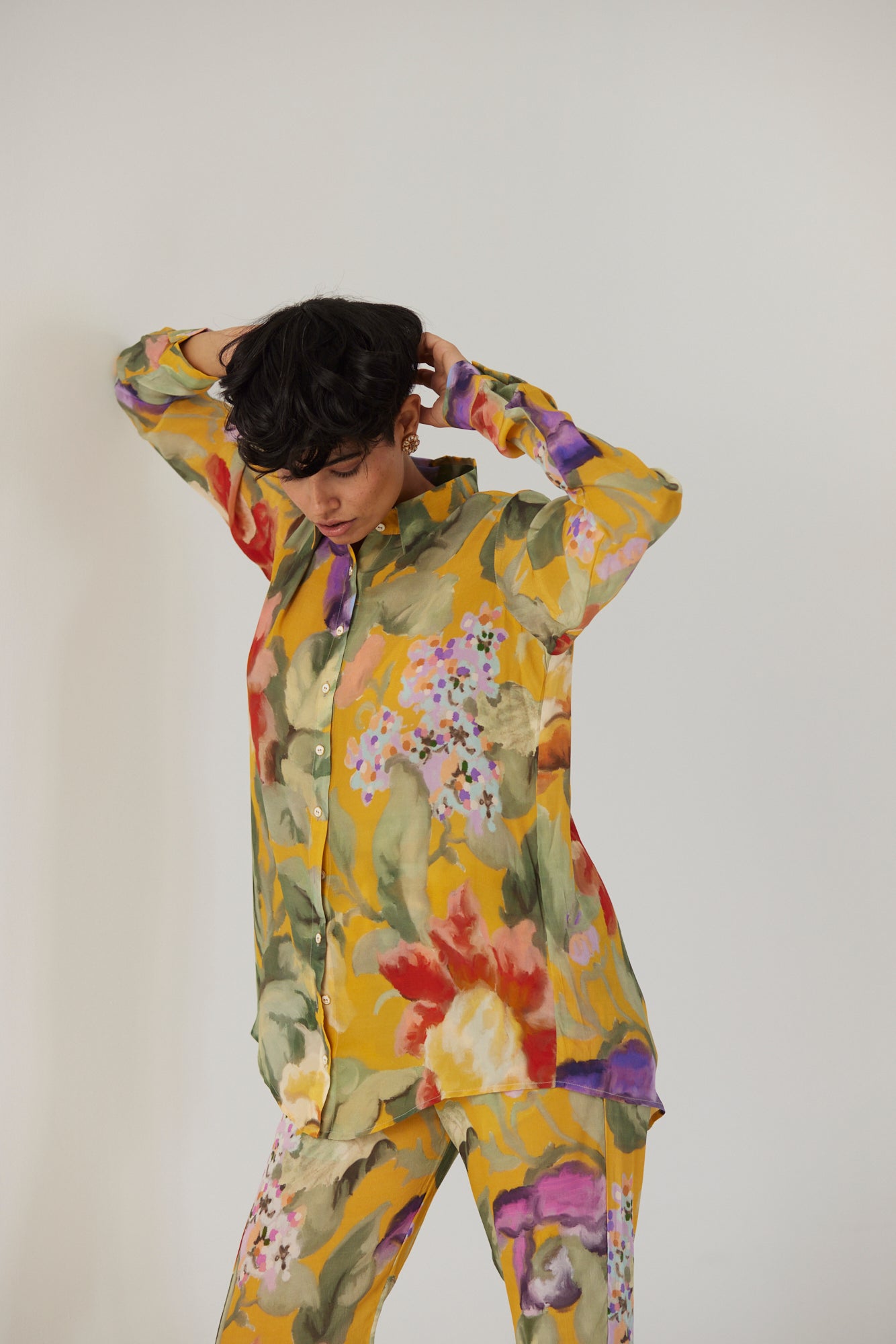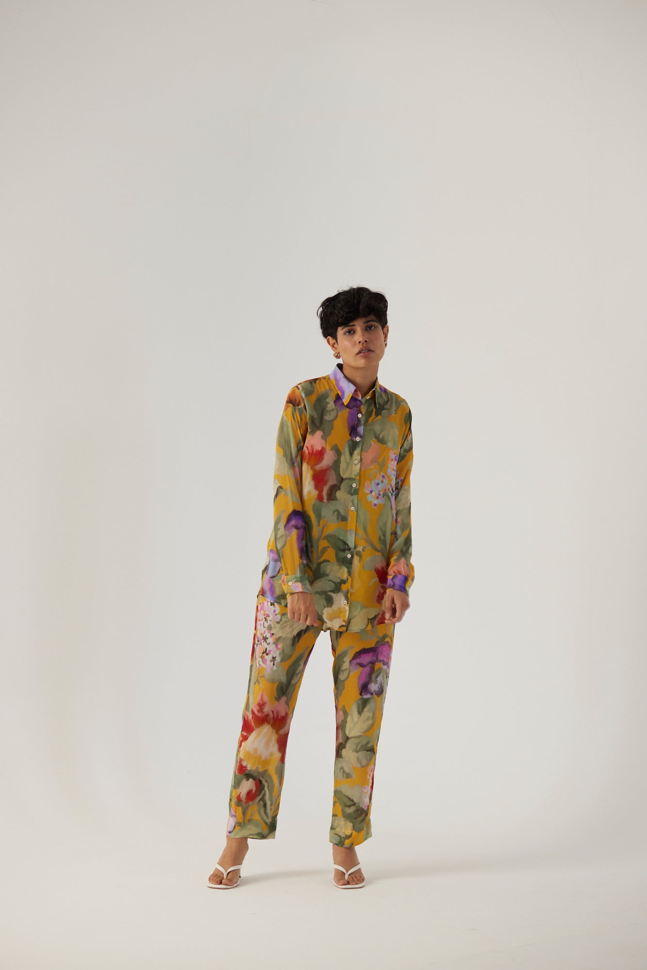 The print features hand drawn botanical motifs in a yellow base. This set is crafted in the Juliet print carefully printed on crepe featuring a set of shirt and pants.