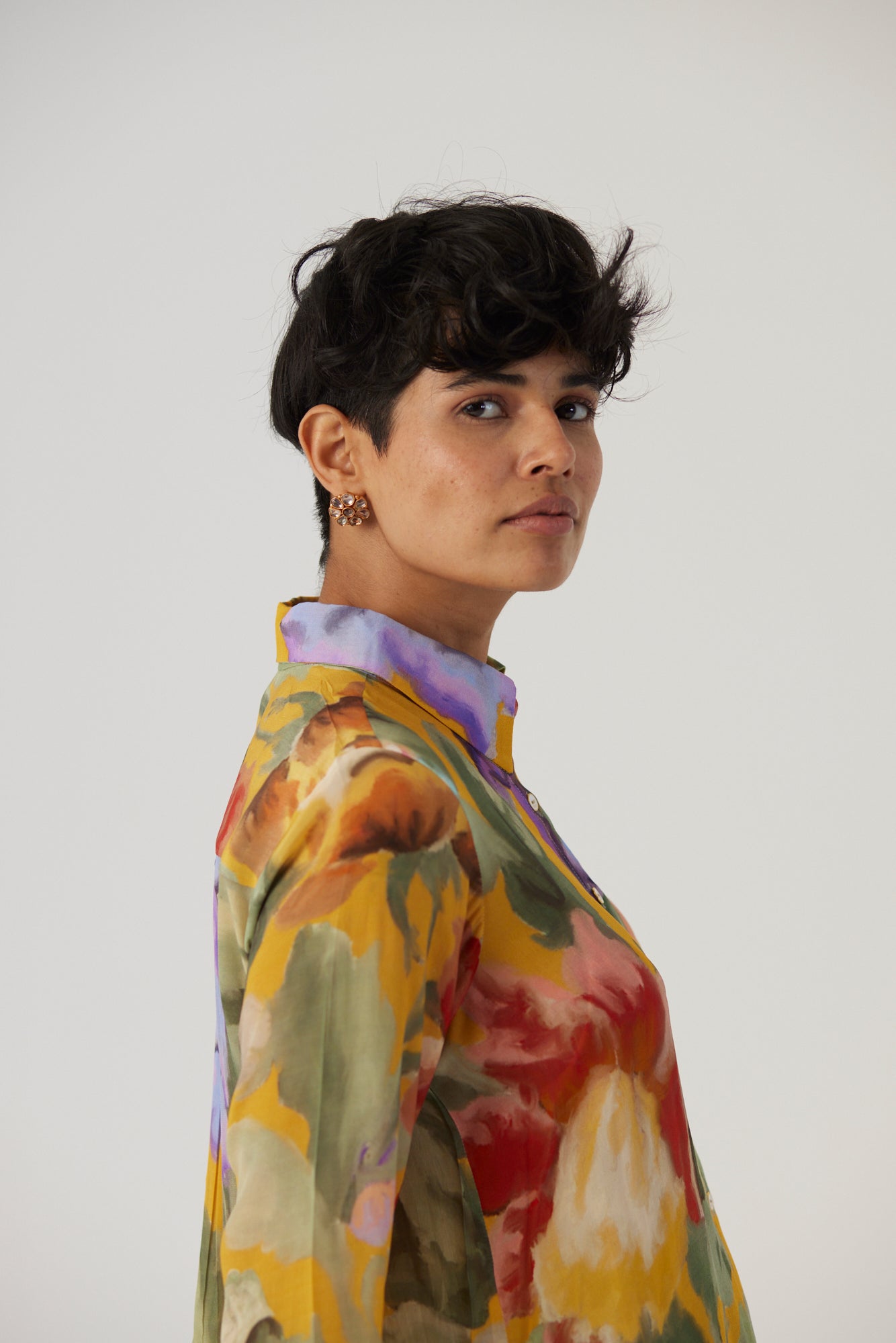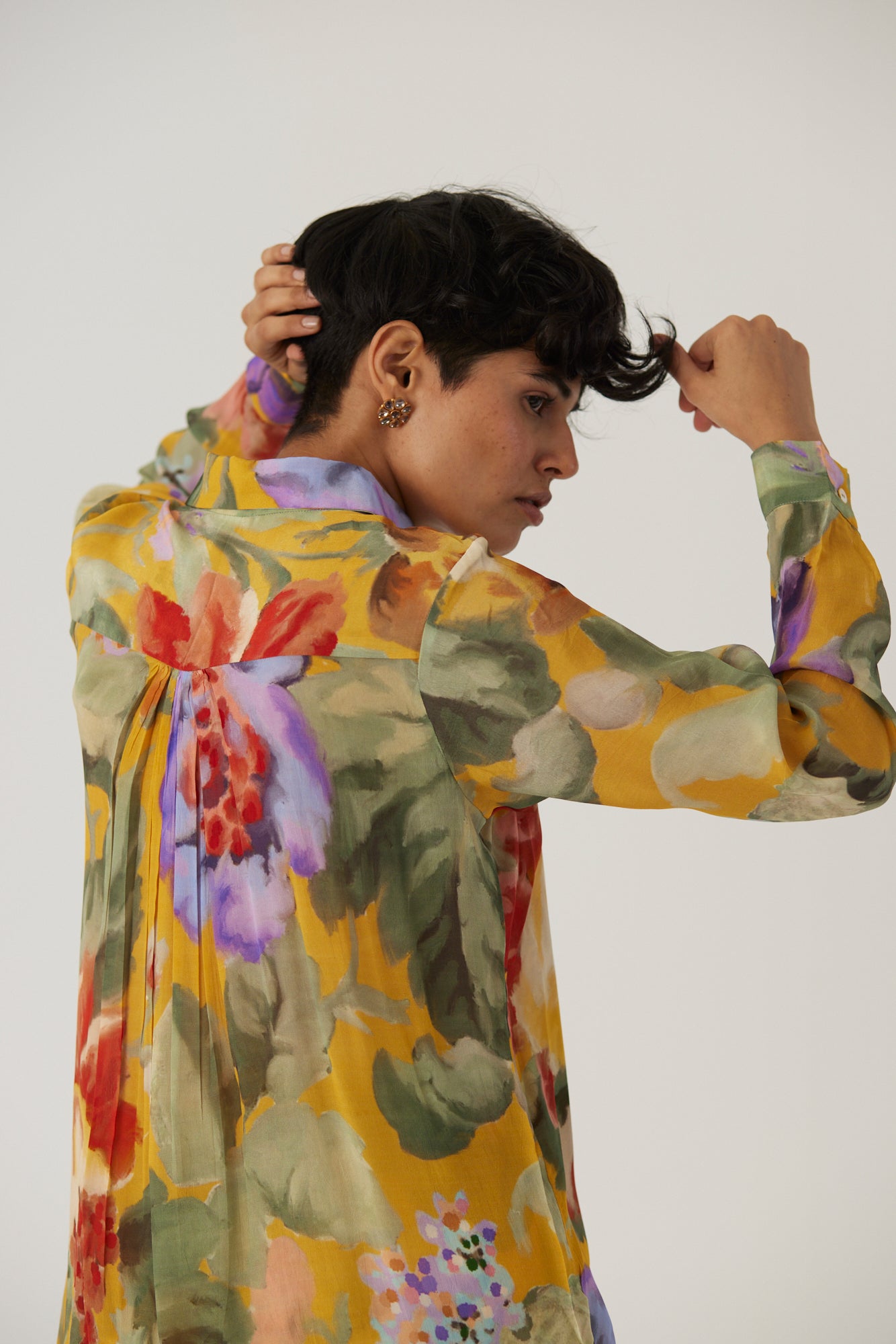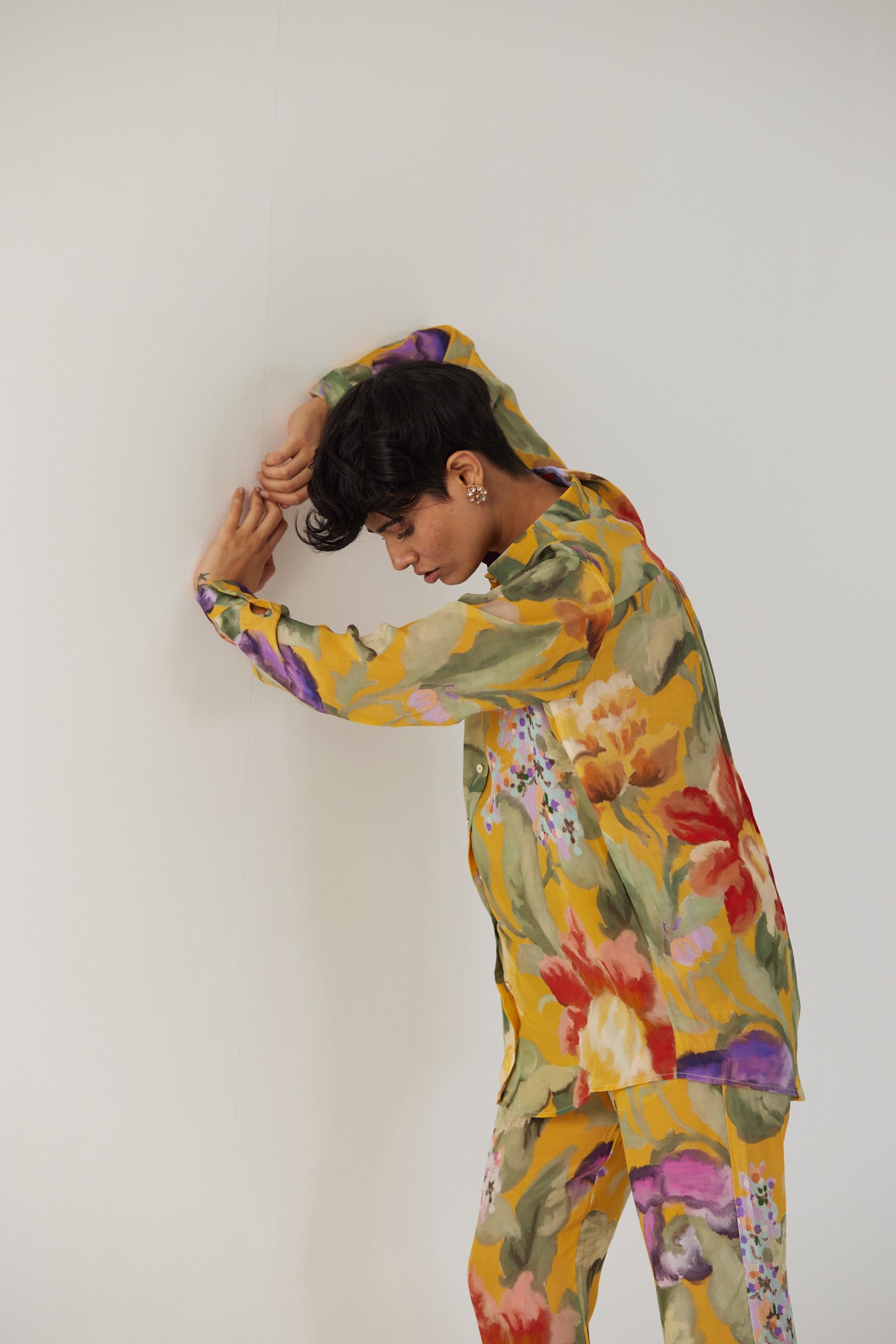 The print features hand drawn botanical motifs in a yellow base. This set is crafted in the Juliet print carefully printed on crepe featuring a set of shirt and pants.