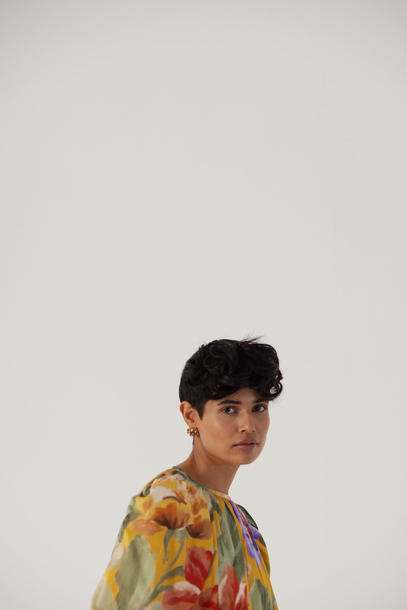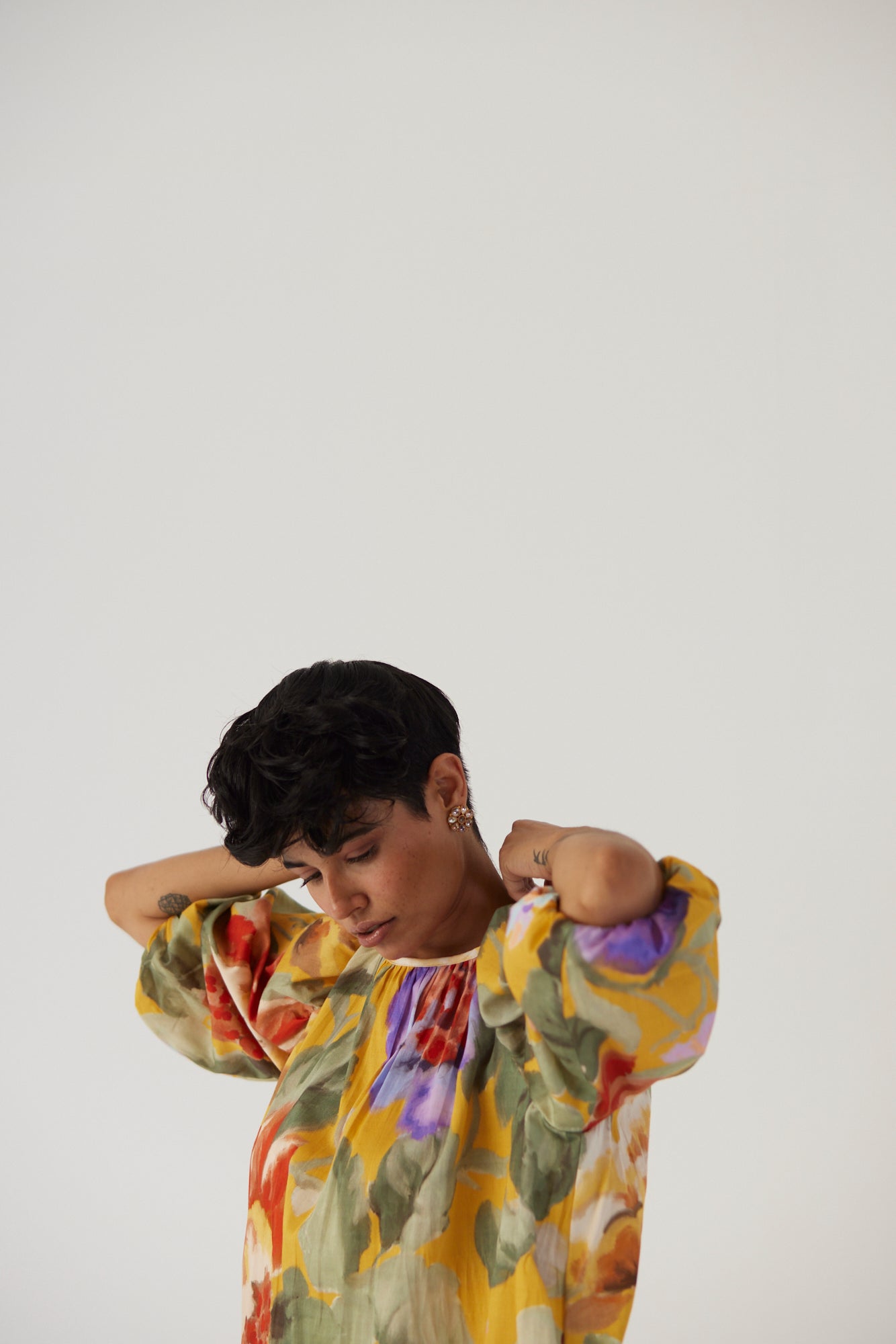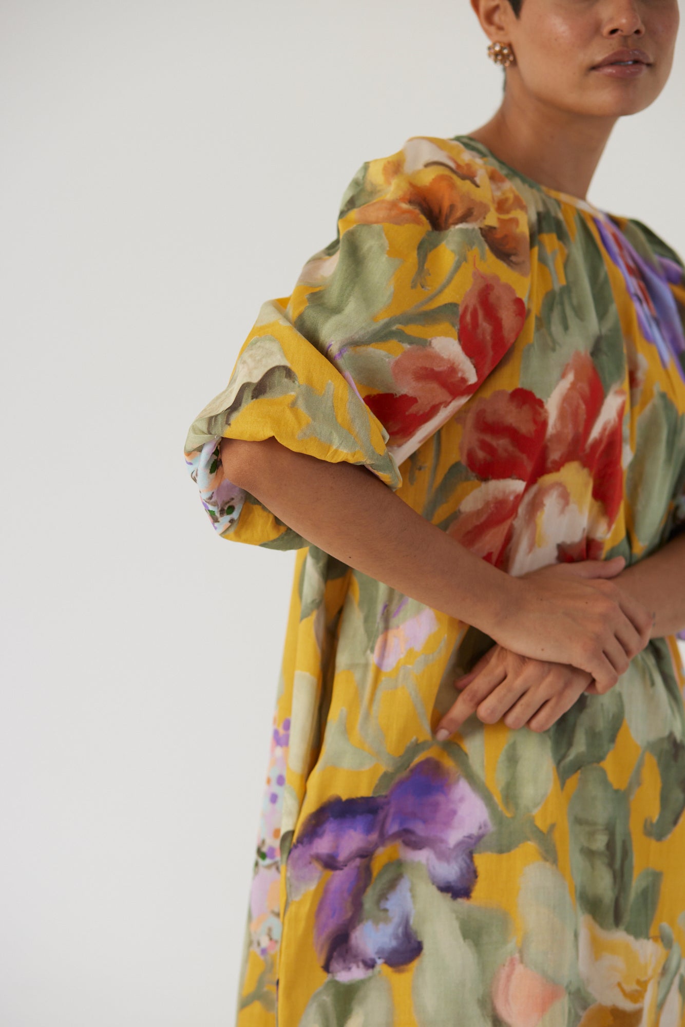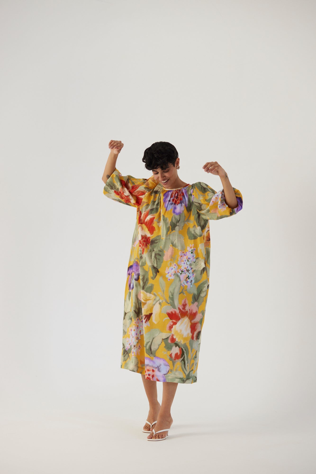 The print features massive hand-painted leaves of distinct shapes and designs on a yellow base. This dress is crafted in the Alora yellow print carefully printed on Cotton Satin. It is a midi length dress with puff sleeves.