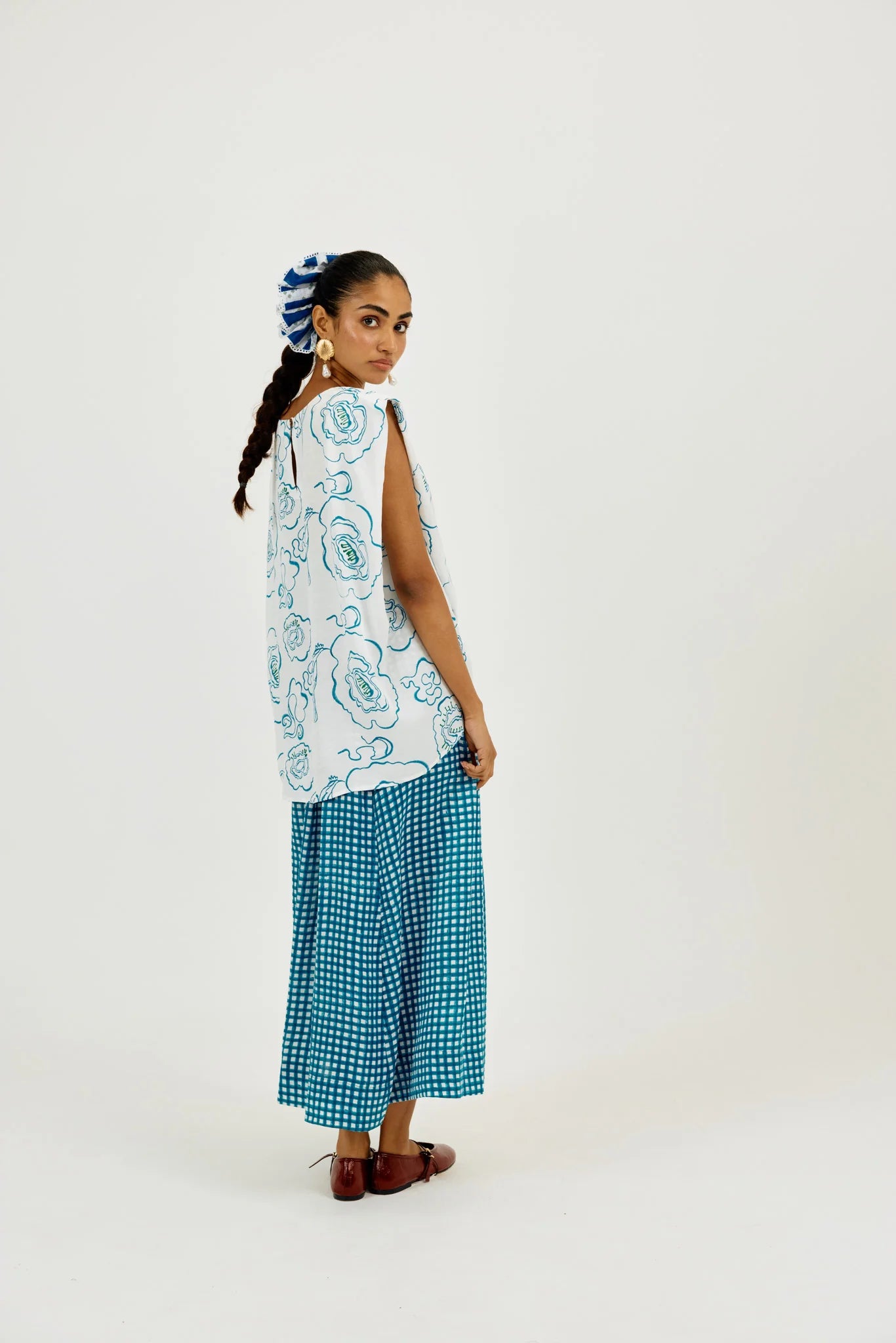 Channel effortless summer chic with our hand-block printed top. Crafted in lightweight linen satin, this relaxed silhouette features abstract florals drawn in-house and is cinched with a soft elastic for a flattering shape. Hand embroidery details add a touch of whimsy, while the wide neckline and cap sleeves keep it airy and elevated.