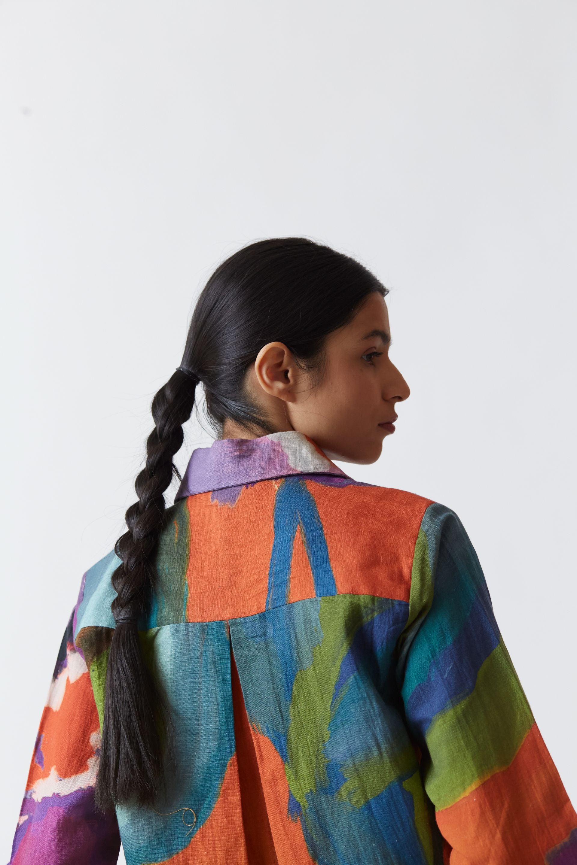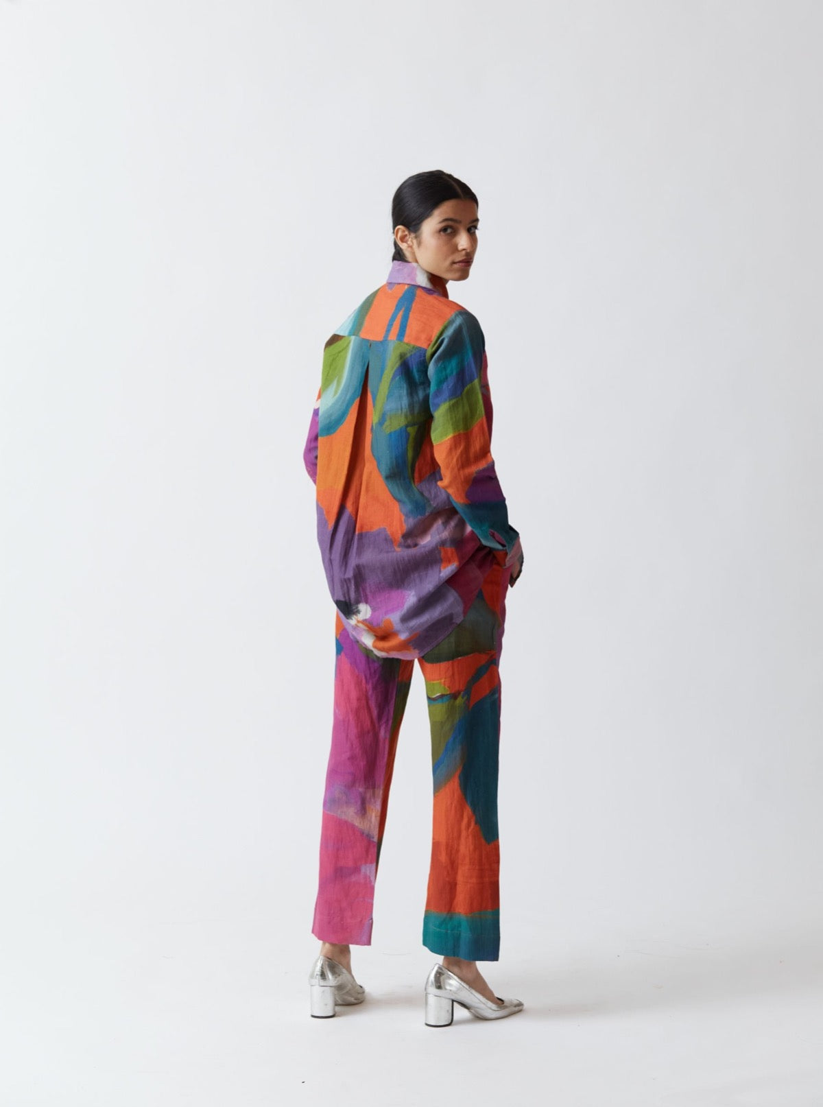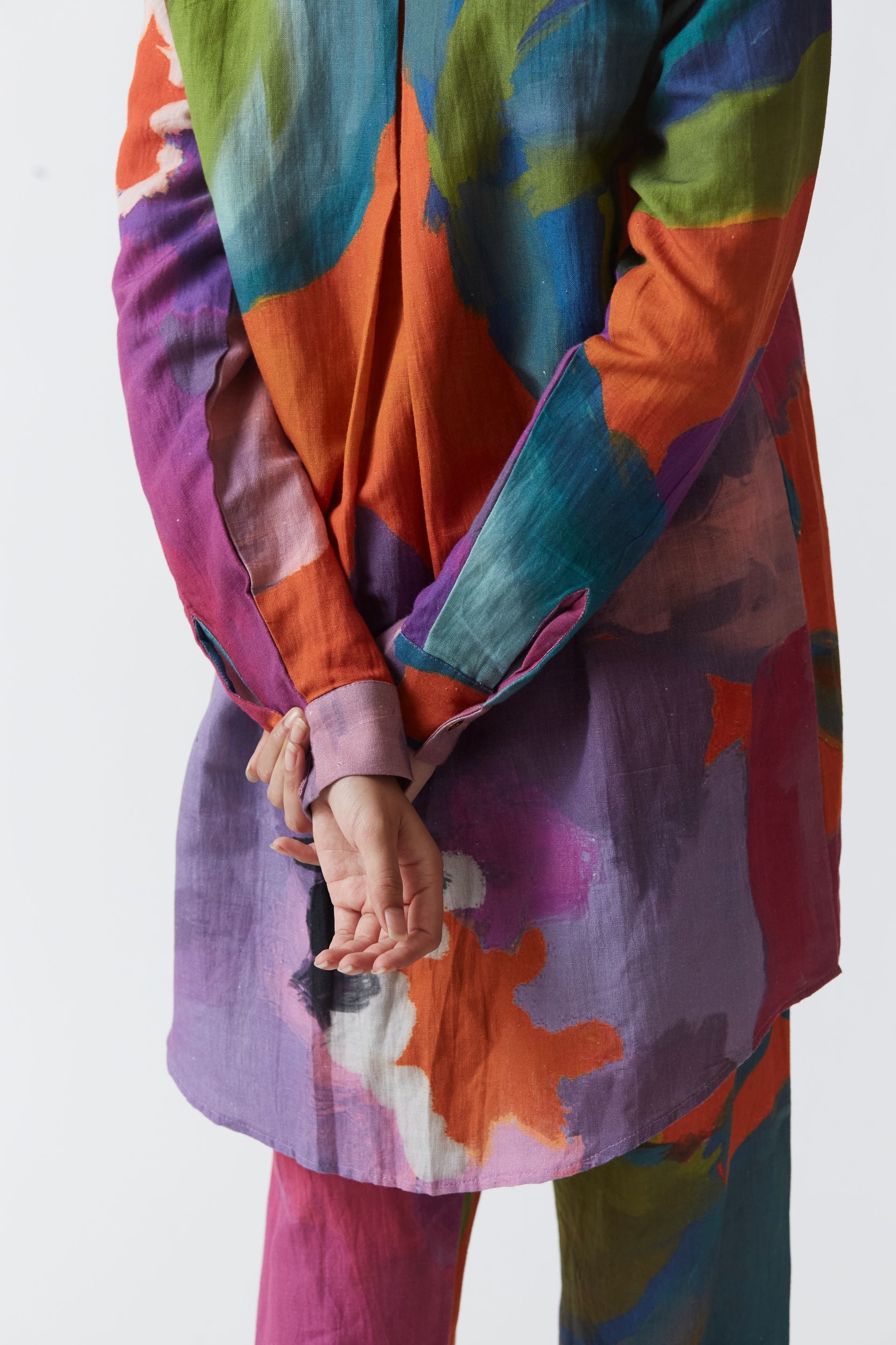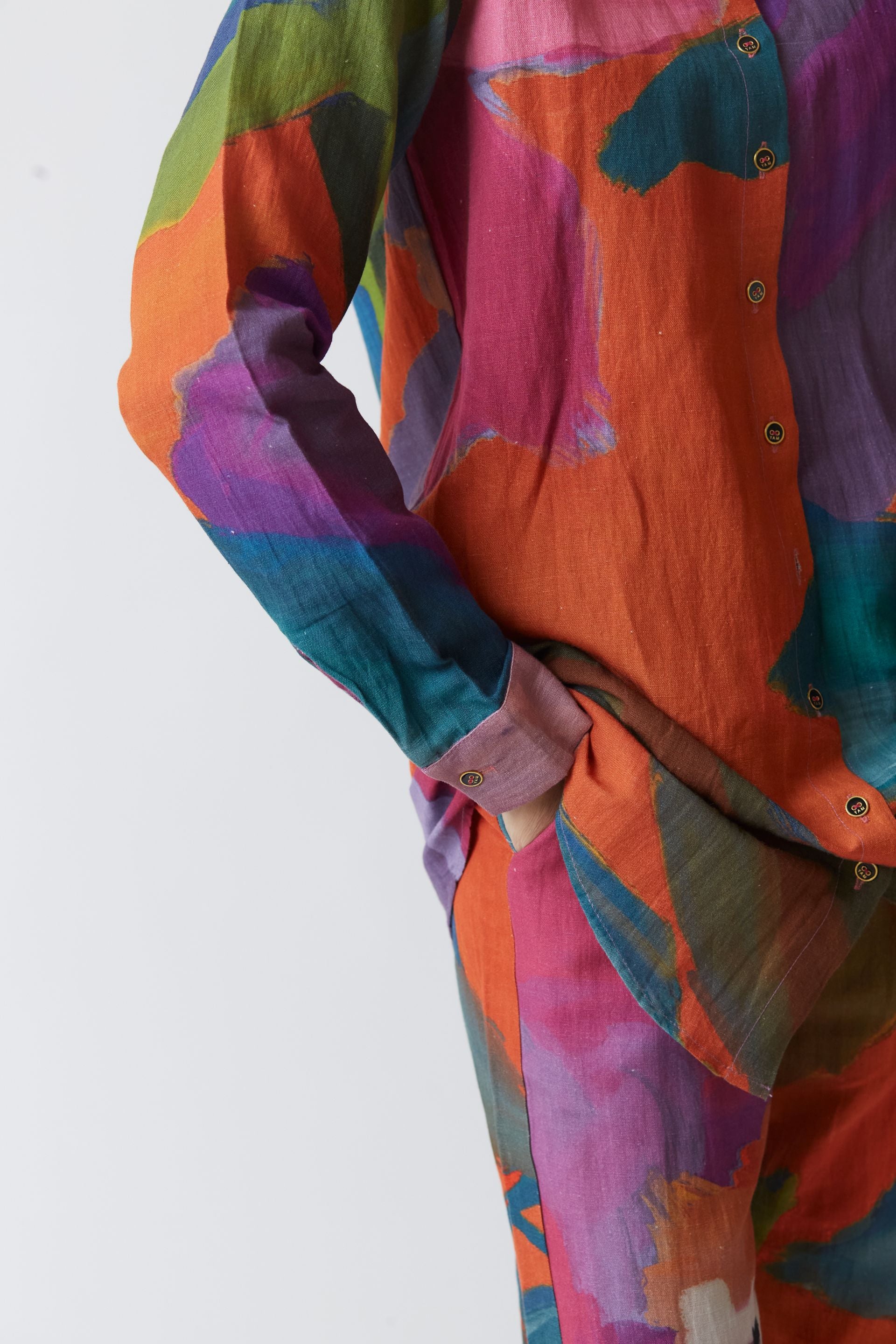 The print in bright orange and rani pink hues features handpainted and