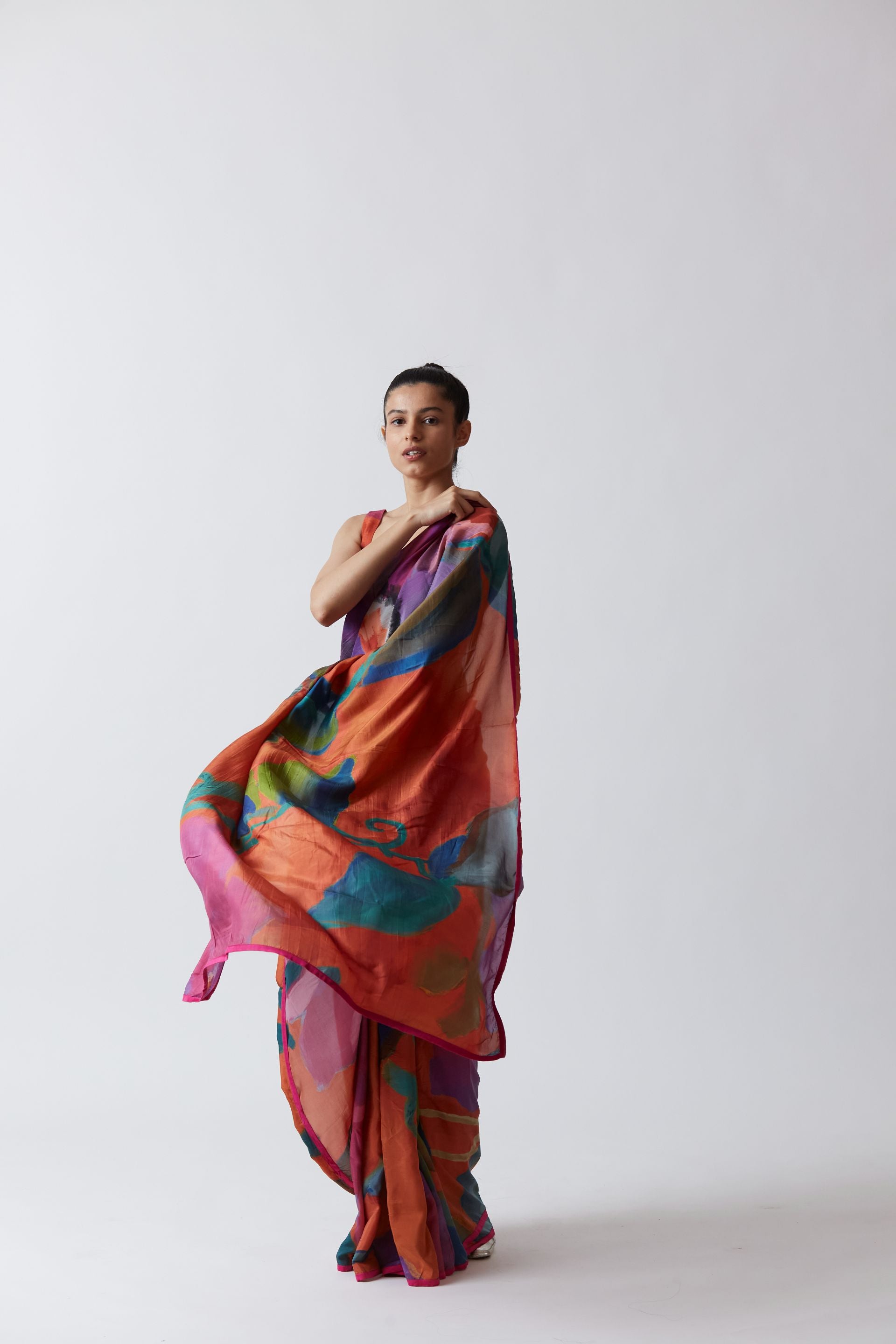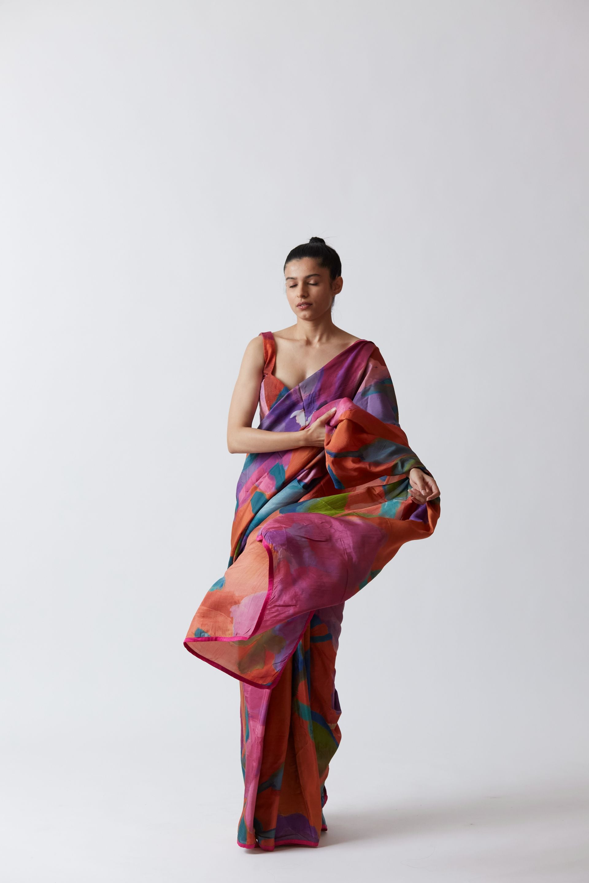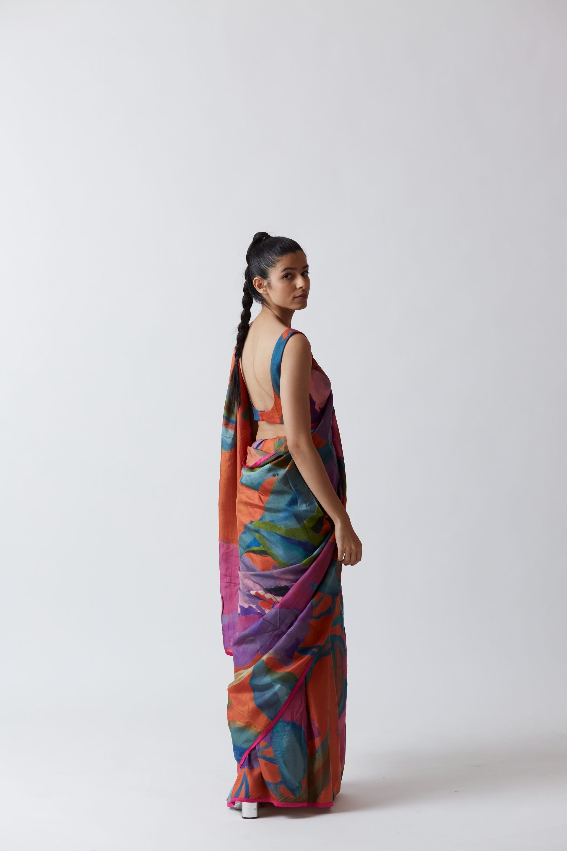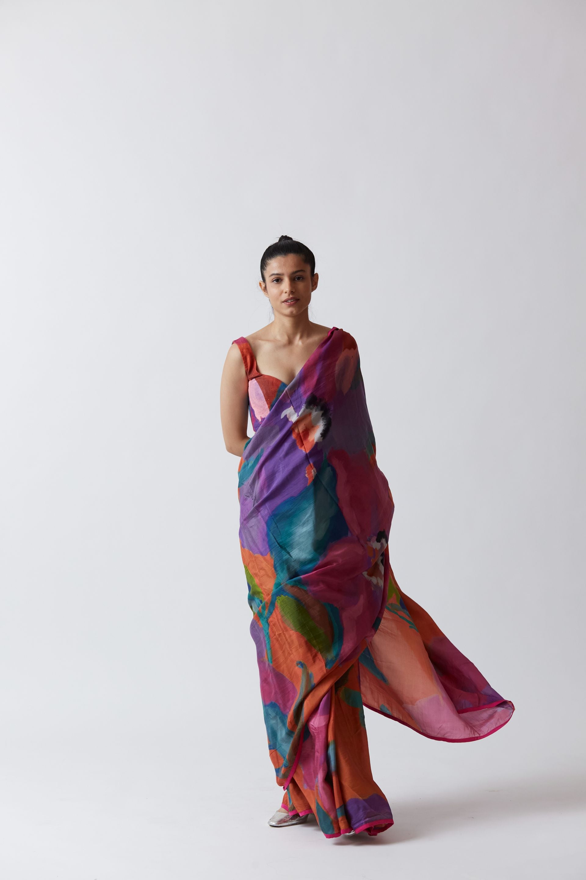 The saree is crafted in the amethyst print carefully printed on Pure silk.
