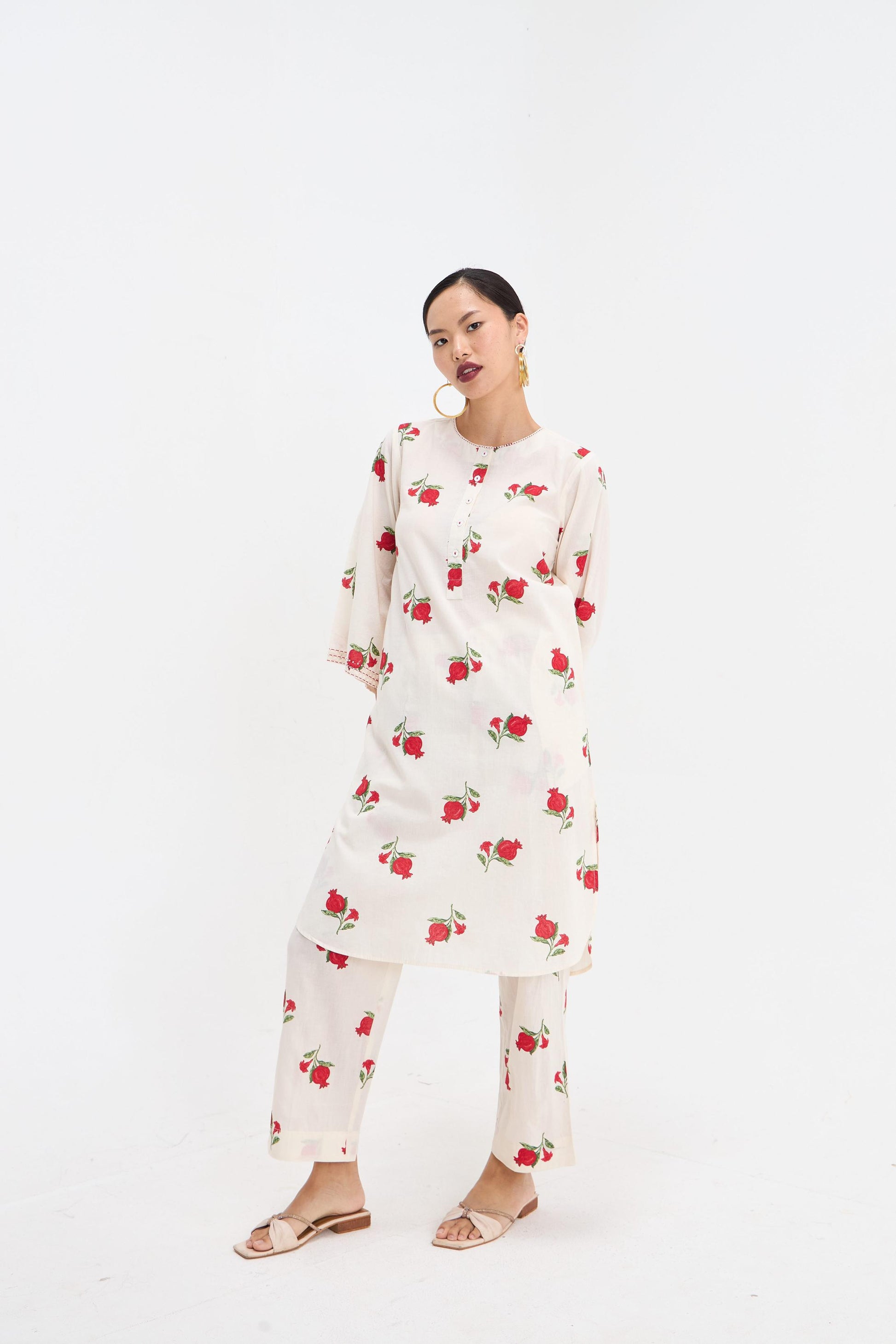 This straight-cut kurta featuring delicate bead and thread work. Adorned with vibrant screen-printed anaar motifs, this ensemble blends playful charm with understated sophistication, perfect for a fresh and unique look.