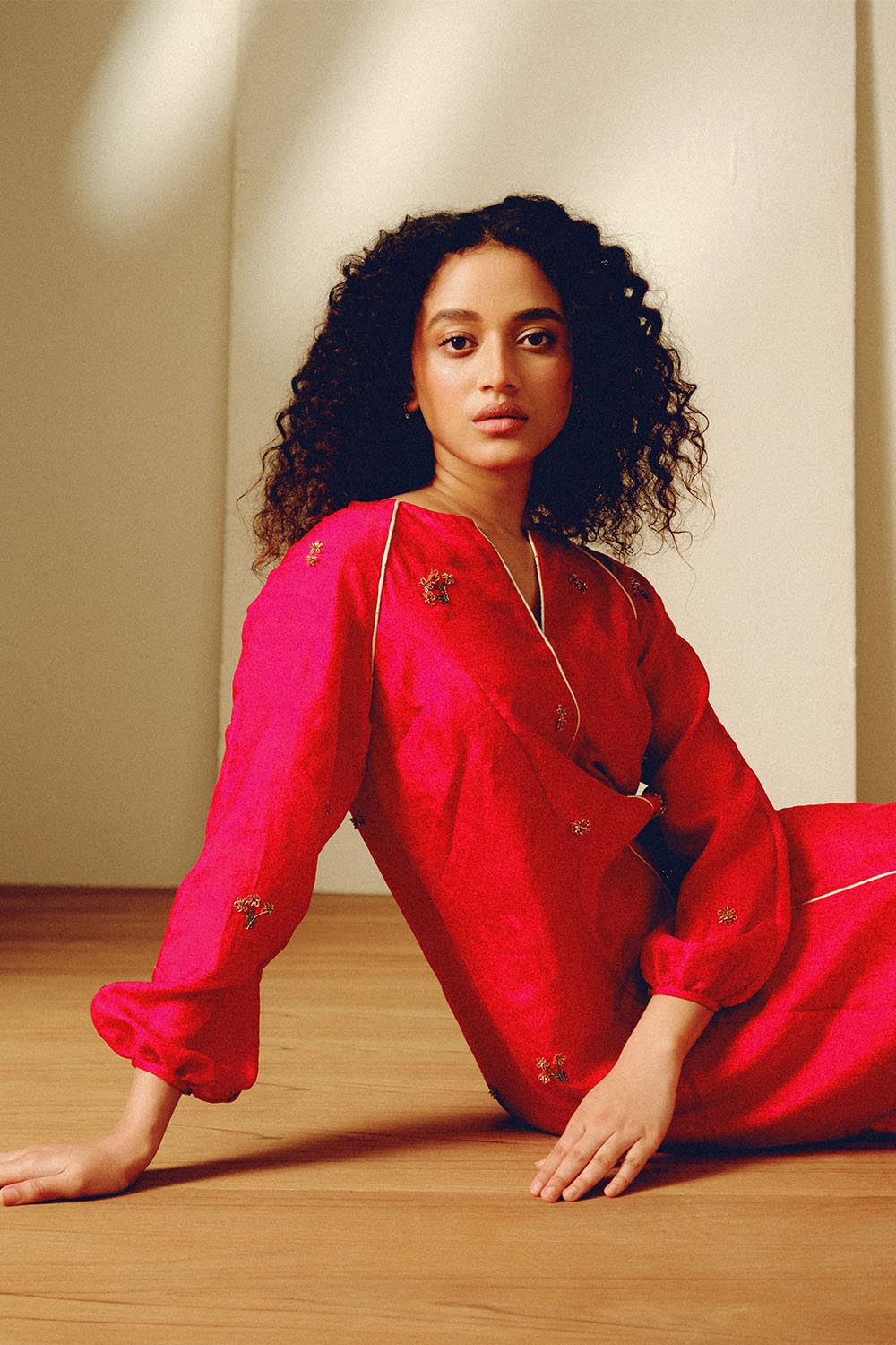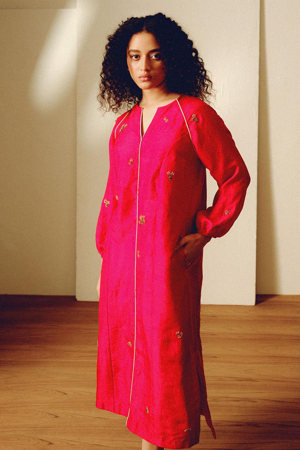 Handwoven mulberry silk classic raglan sleeve midi dress with hand embroidered beaded motifs and contrast cord piping.