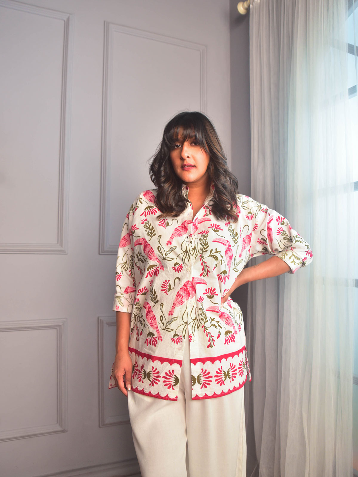 Oversized and breathable, our shirts are made for all-day comfort. Cut in our exclusive green and pink floral bird hand-screen-printed cotton an over sized shirt with matching buttons down the center.