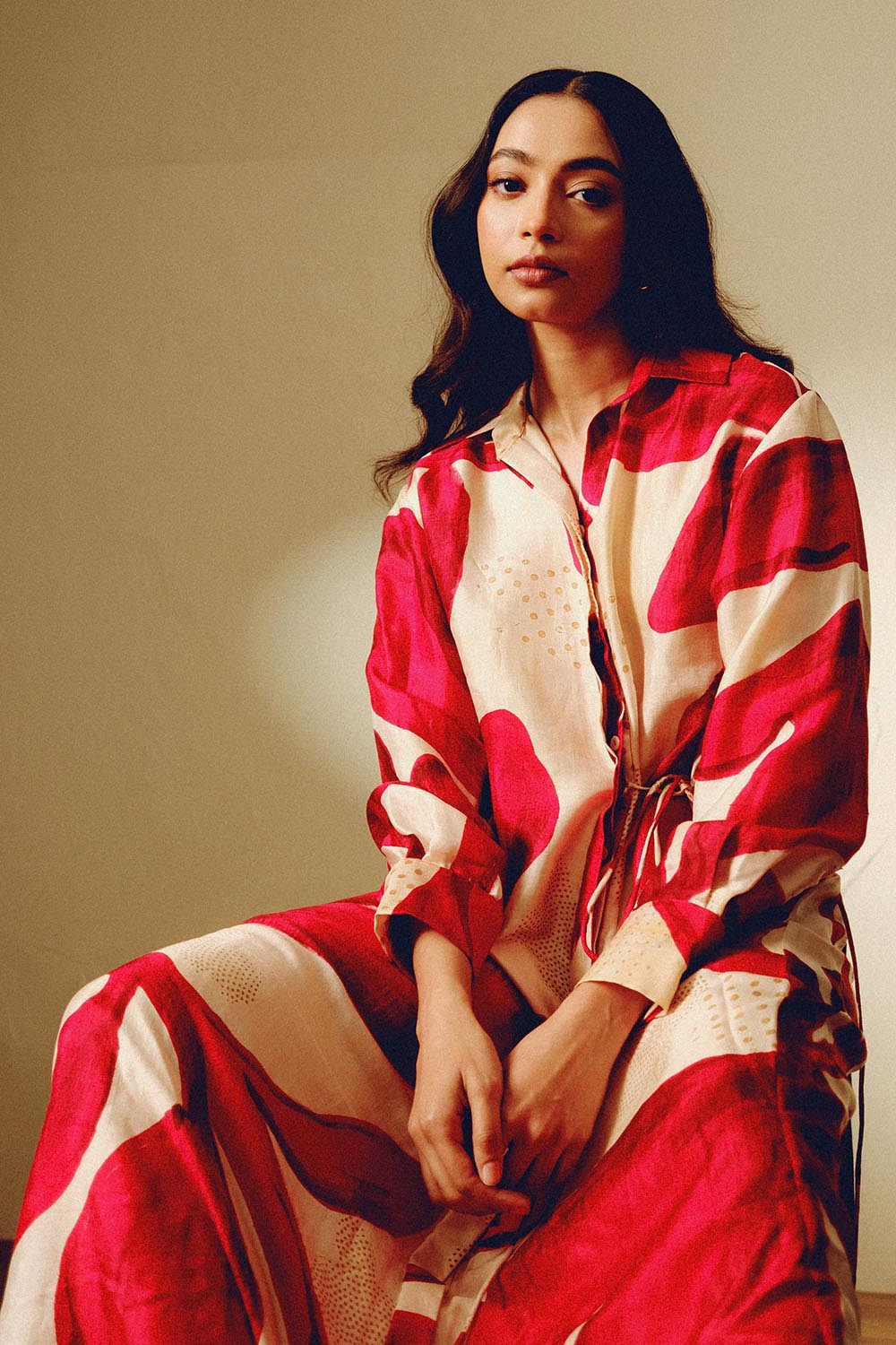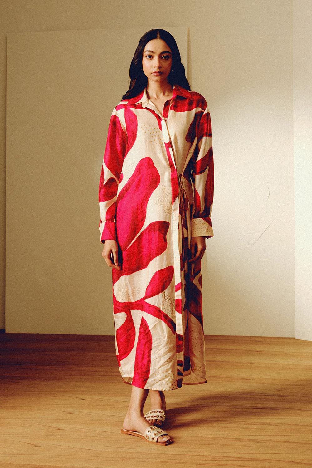 Handwoven and hand-painted mulberry silk midi shirt dress with an off centre tie up cord detail. Dress Length-50