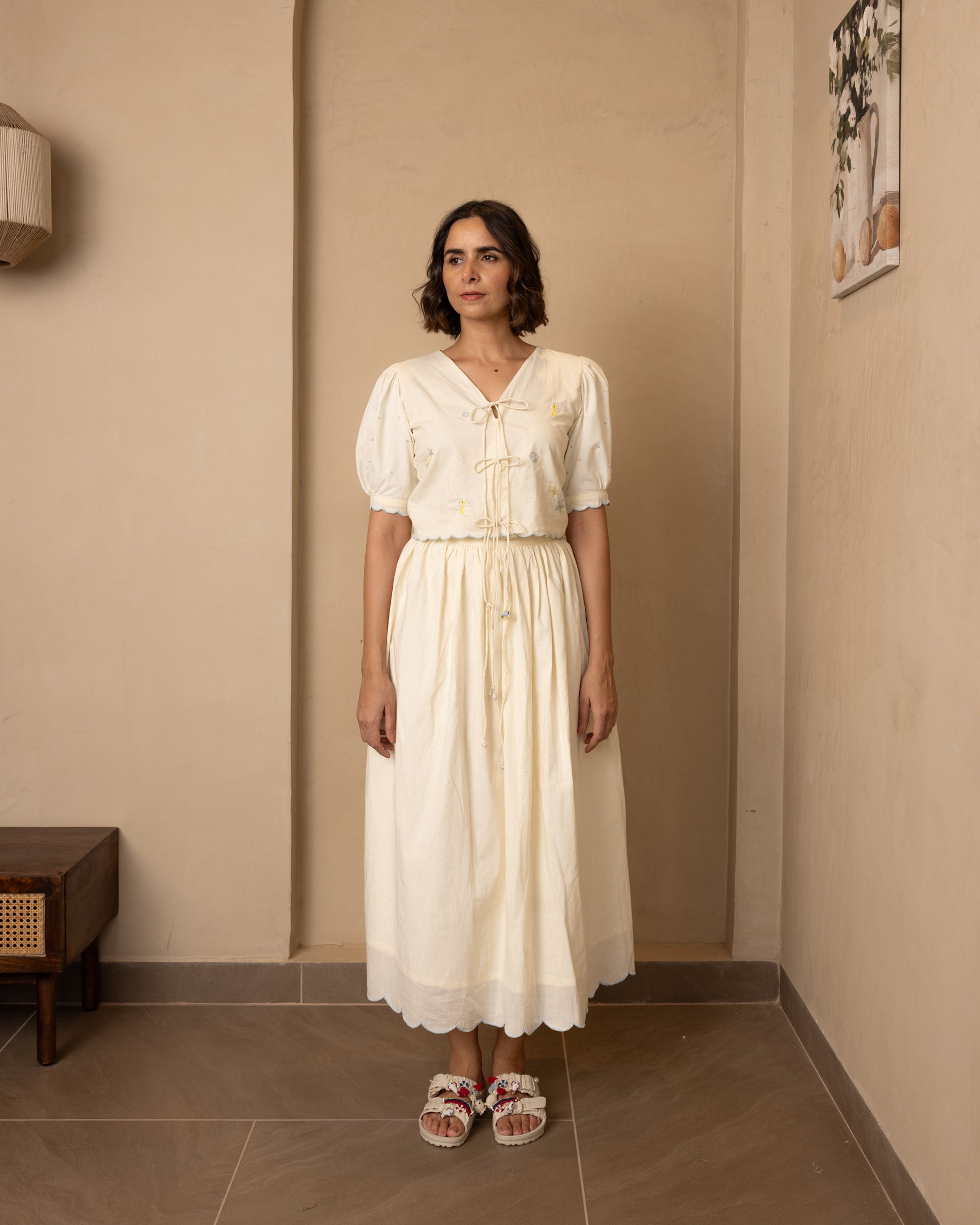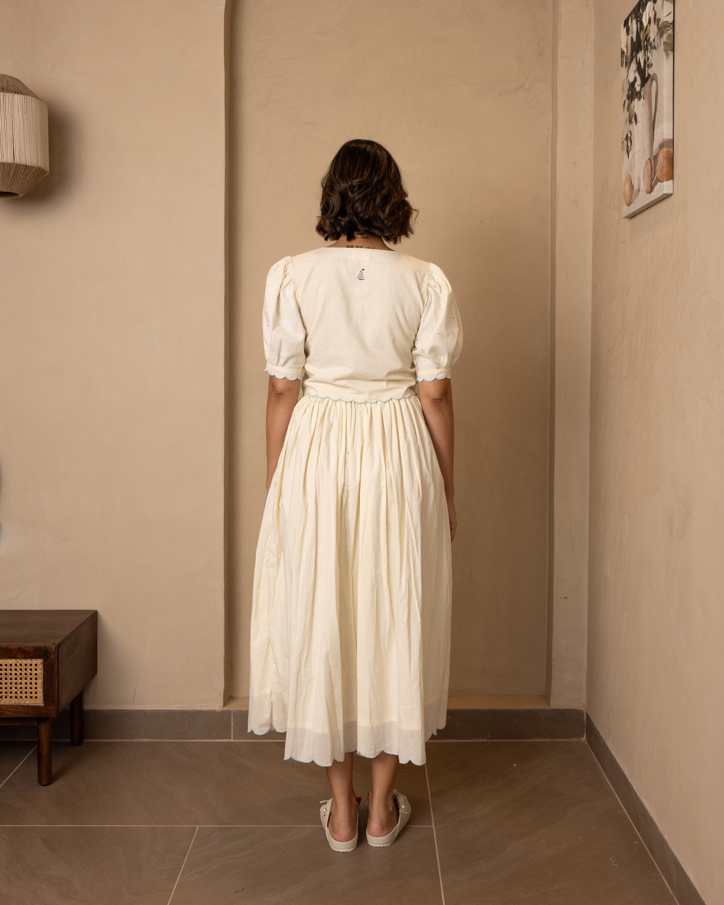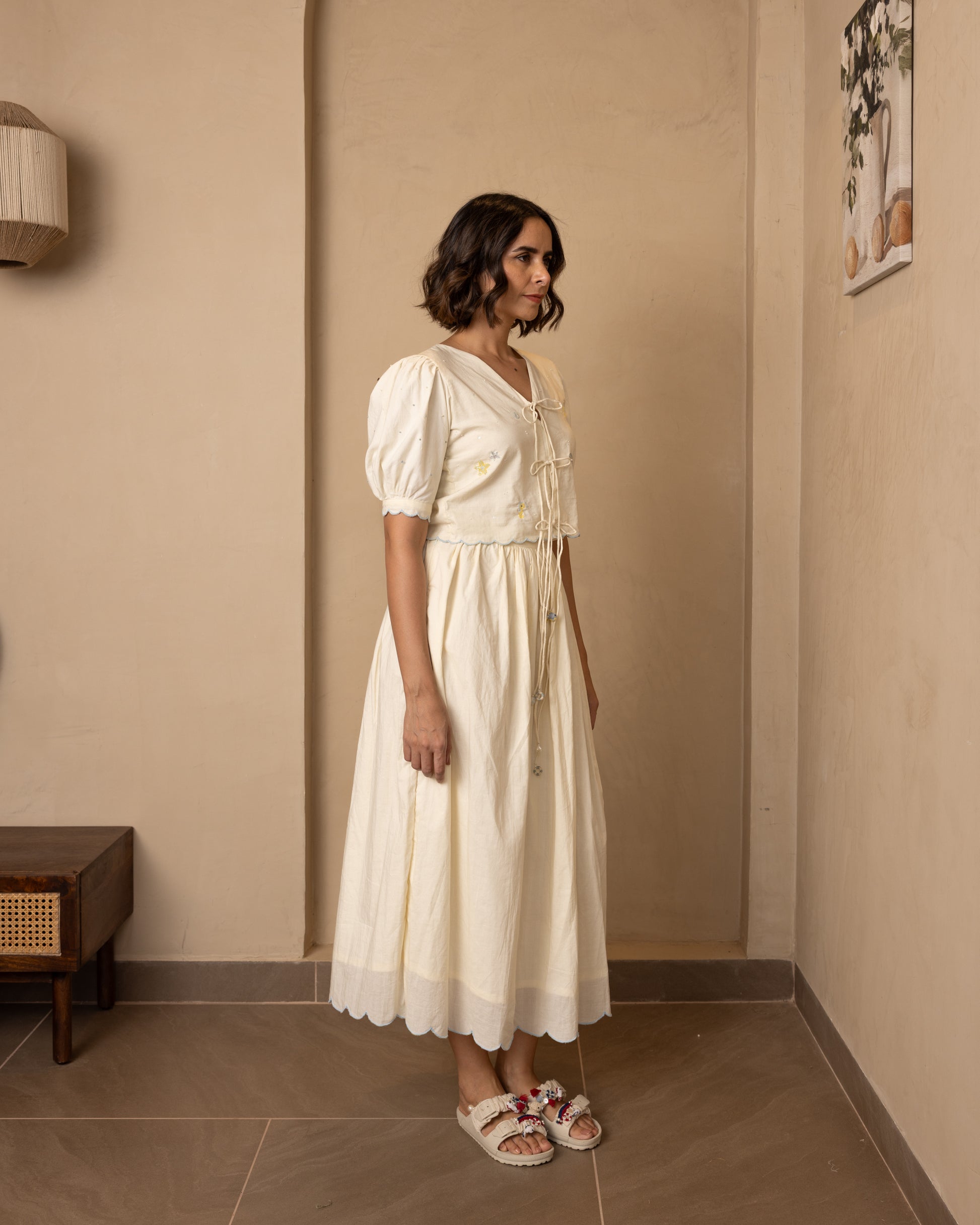Intricate shoulder-to-sleeve lace detailing adds a touch of femininity and grace, while embroidered buttons along the neckline offer a polished finish. A standout feature of this dress is the tassel detailing on the back yoke line, adding whimsical charm and a unique focal point to the ensemble