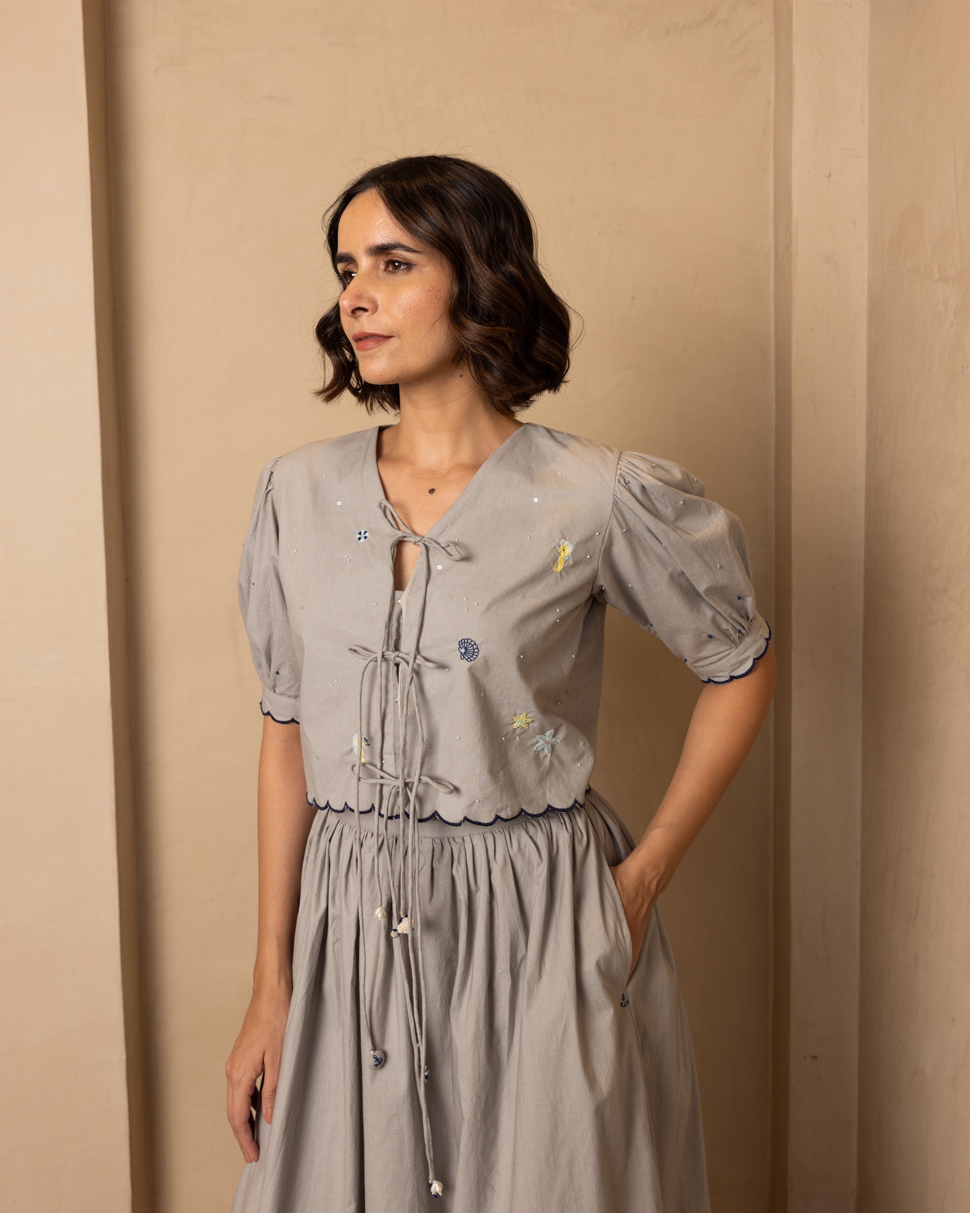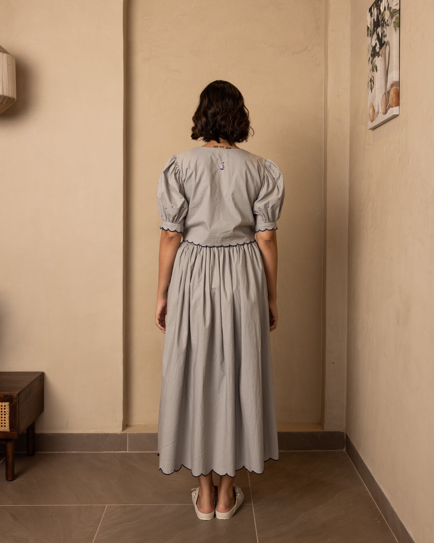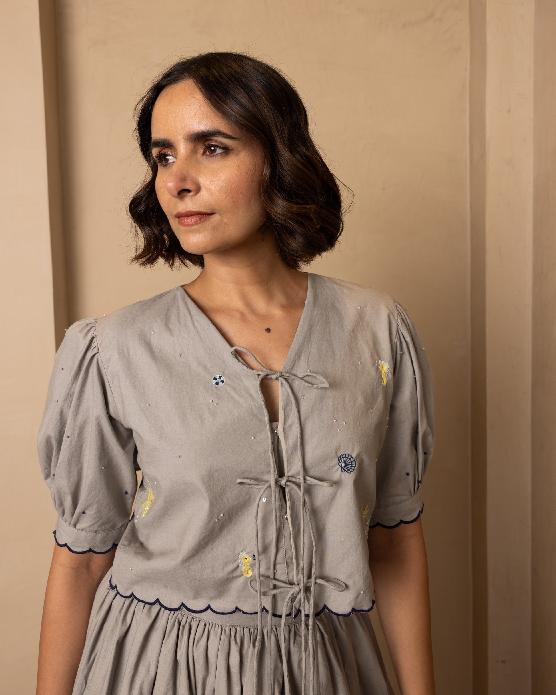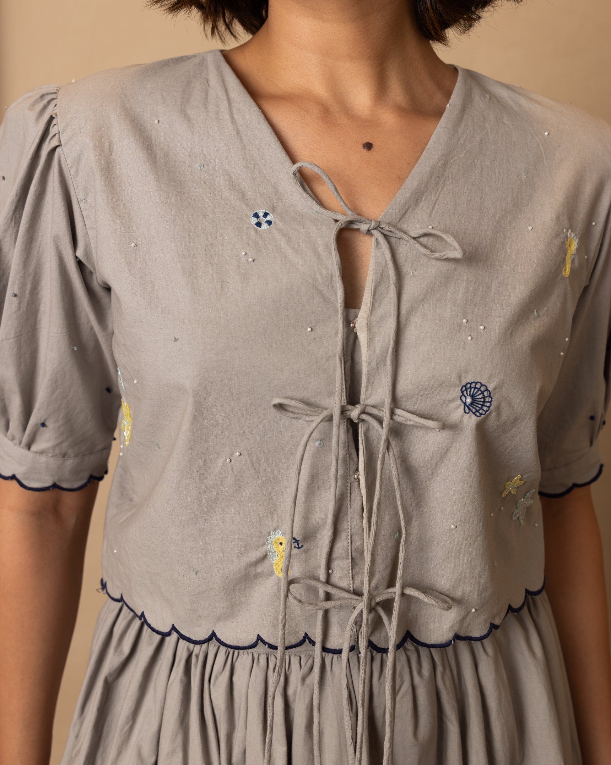 Intricate shoulder-to-sleeve lace detailing adds a touch of femininity and grace, while embroidered buttons along the neckline offer a polished finish. A standout feature of this dress is the tassel detailing on the back yoke line, adding whimsical charm and a unique focal point to the ensemble