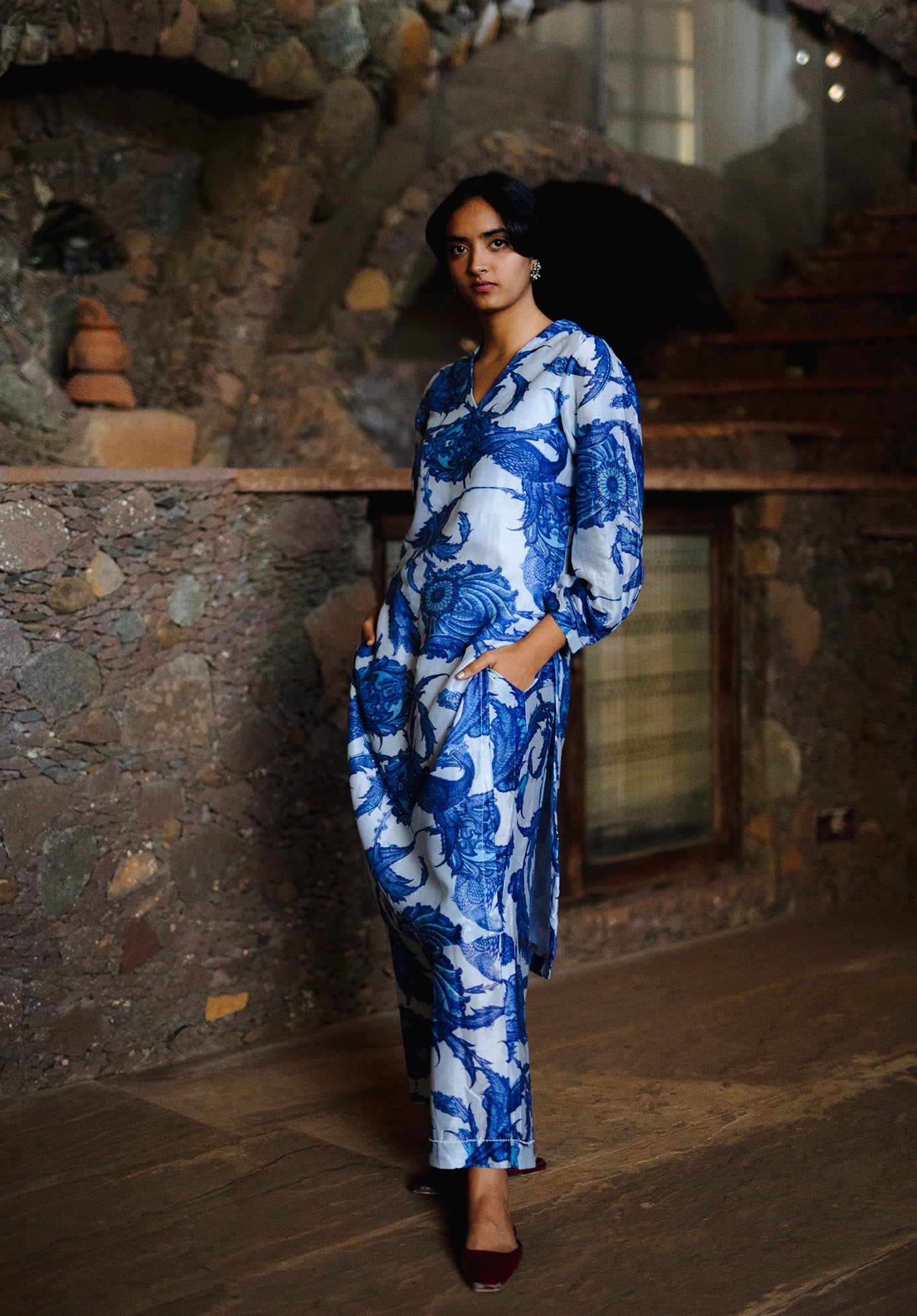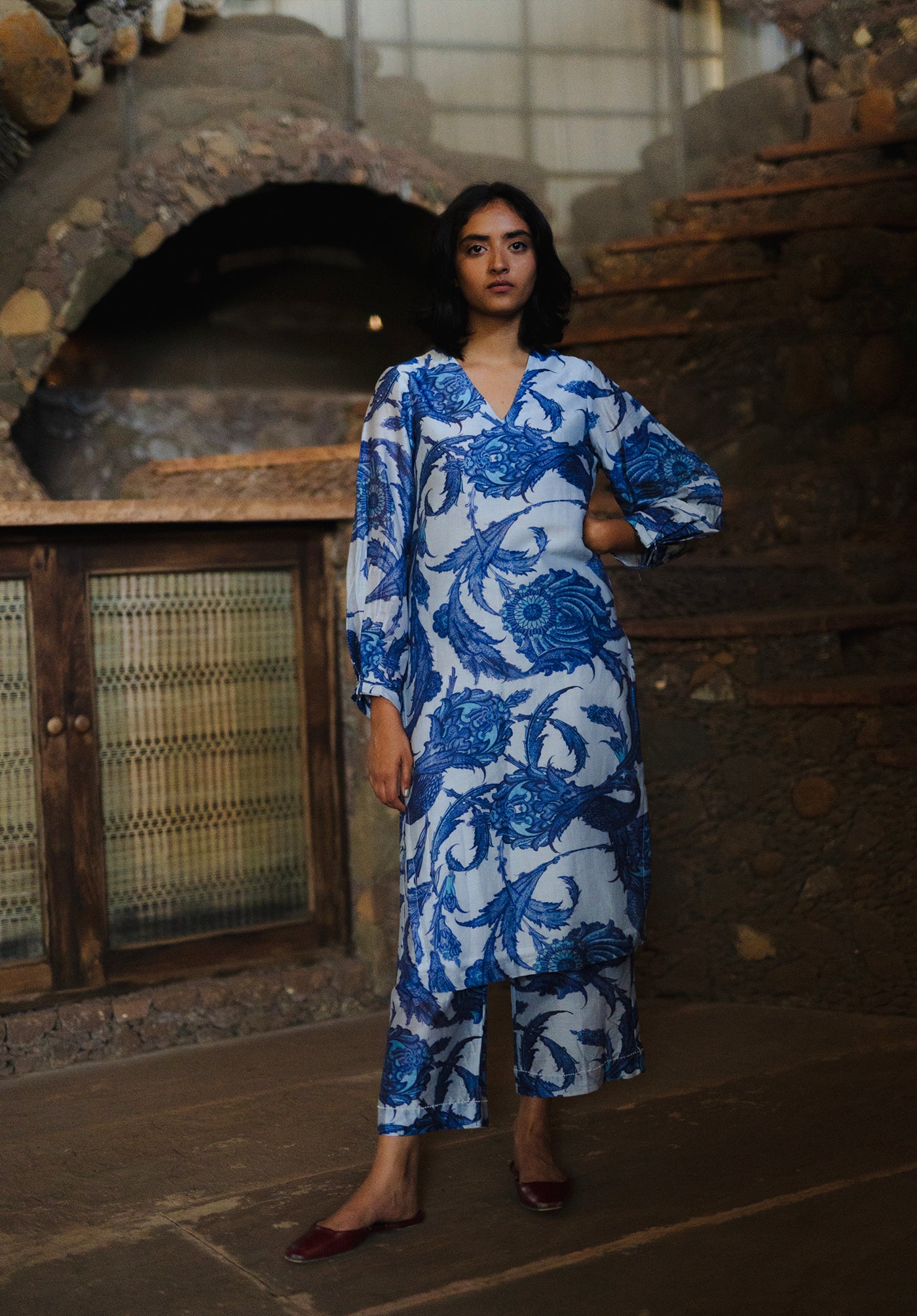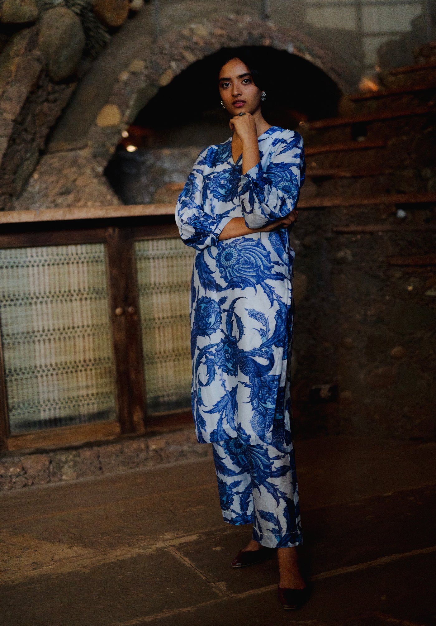 The Athena set features a co-ordinate kurta pant set in Chanderi printed in a beautiful blue and white print inspired from the Iznik tiles of Istanbul temples.