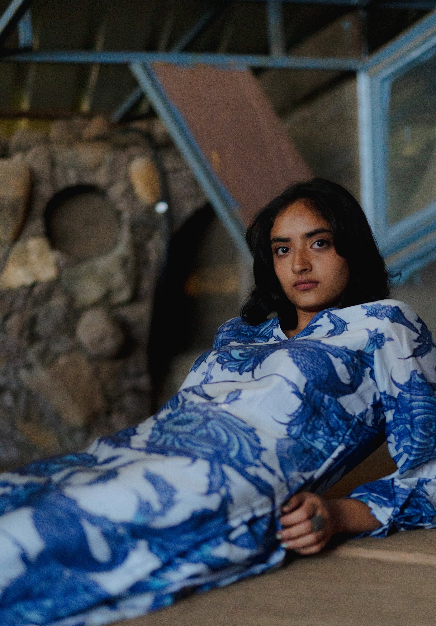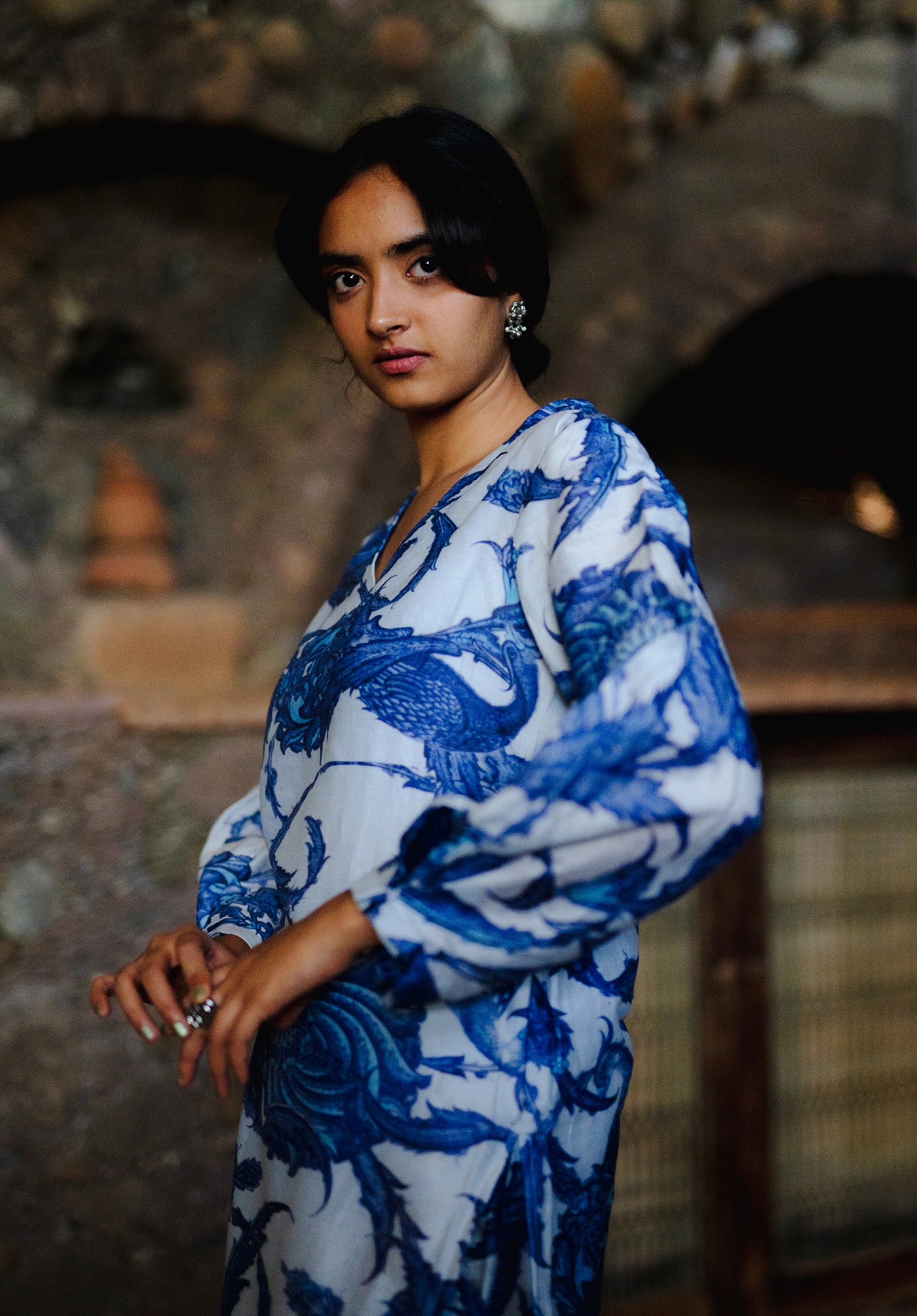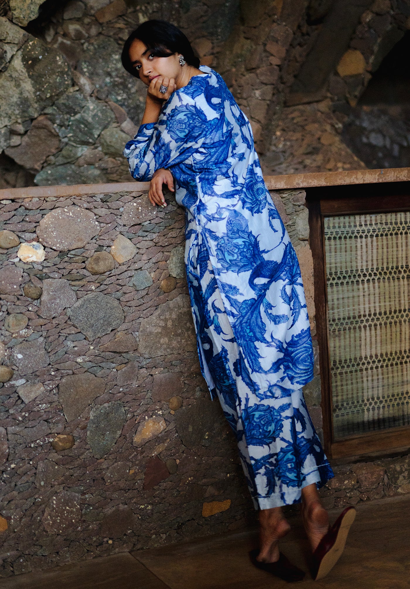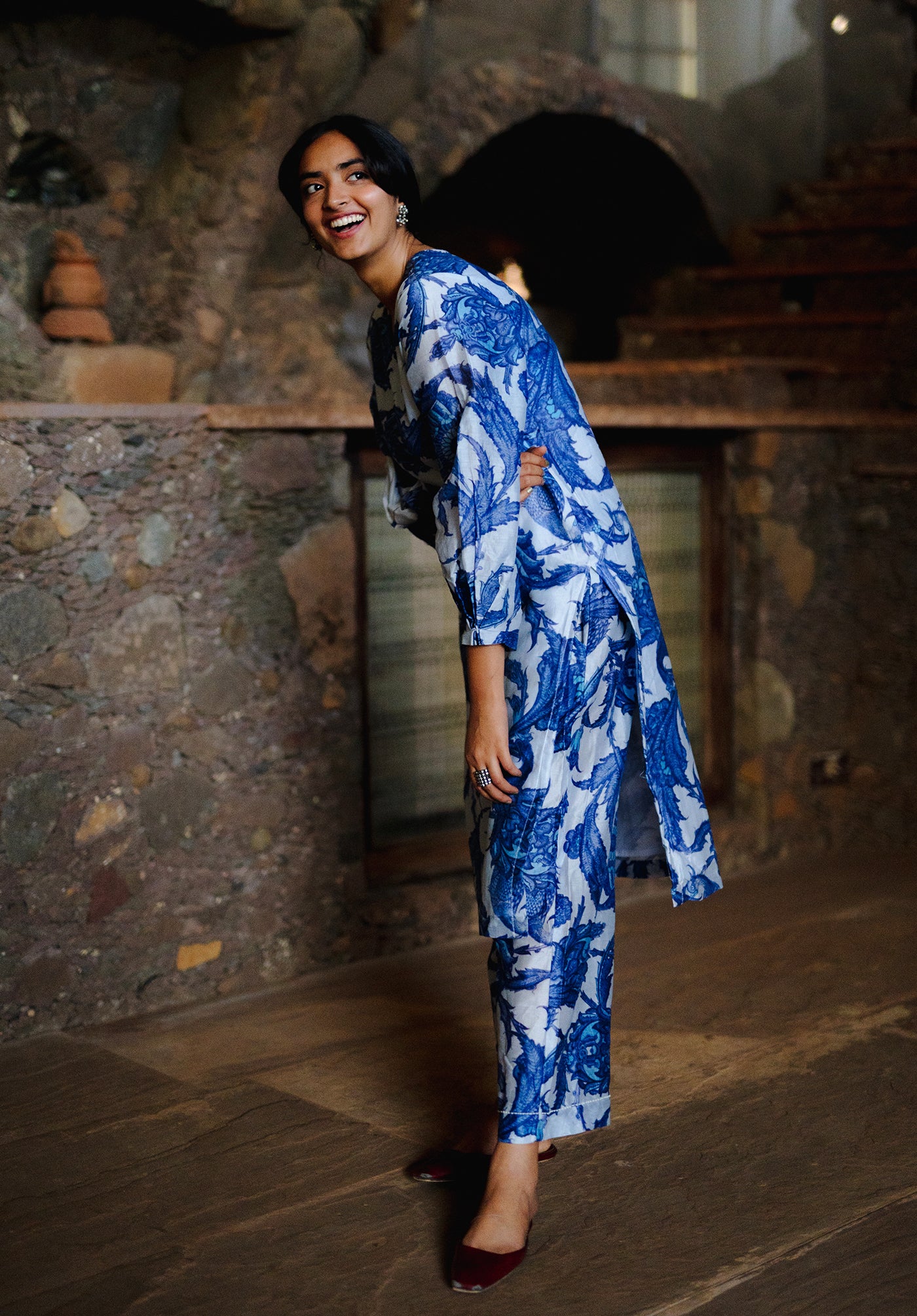 The Athena set features a co-ordinate kurta pant set in Chanderi printed in a beautiful blue and white print inspired from the Iznik tiles of Istanbul temples.