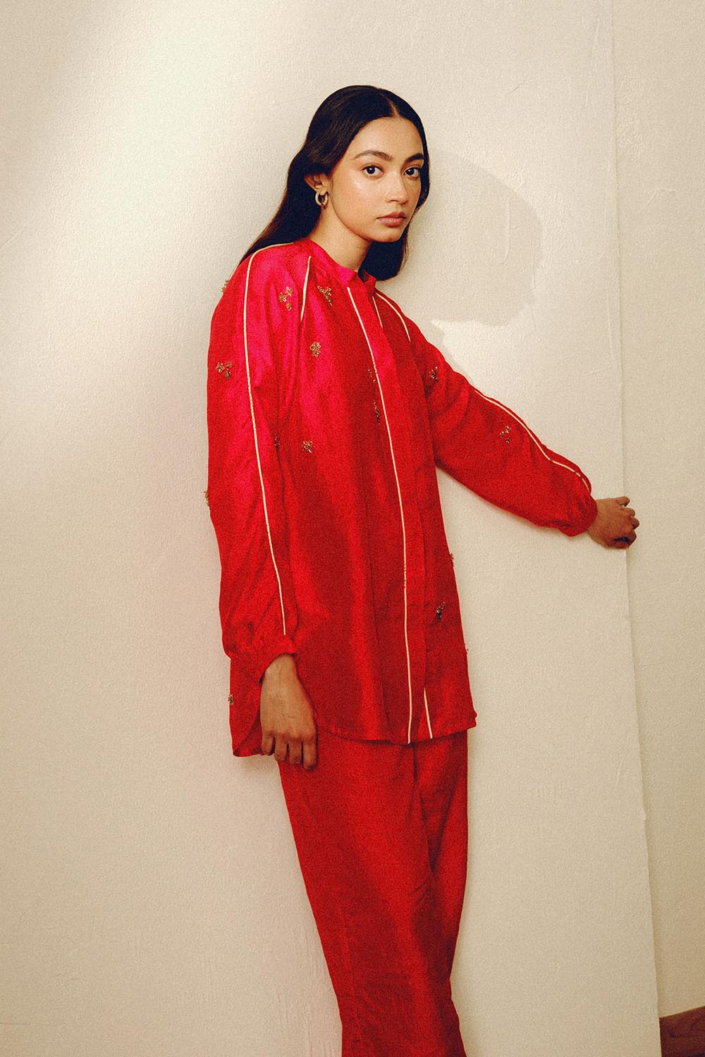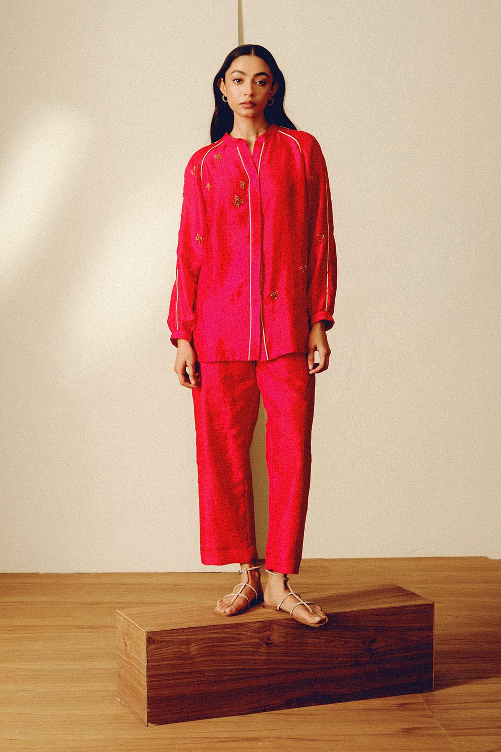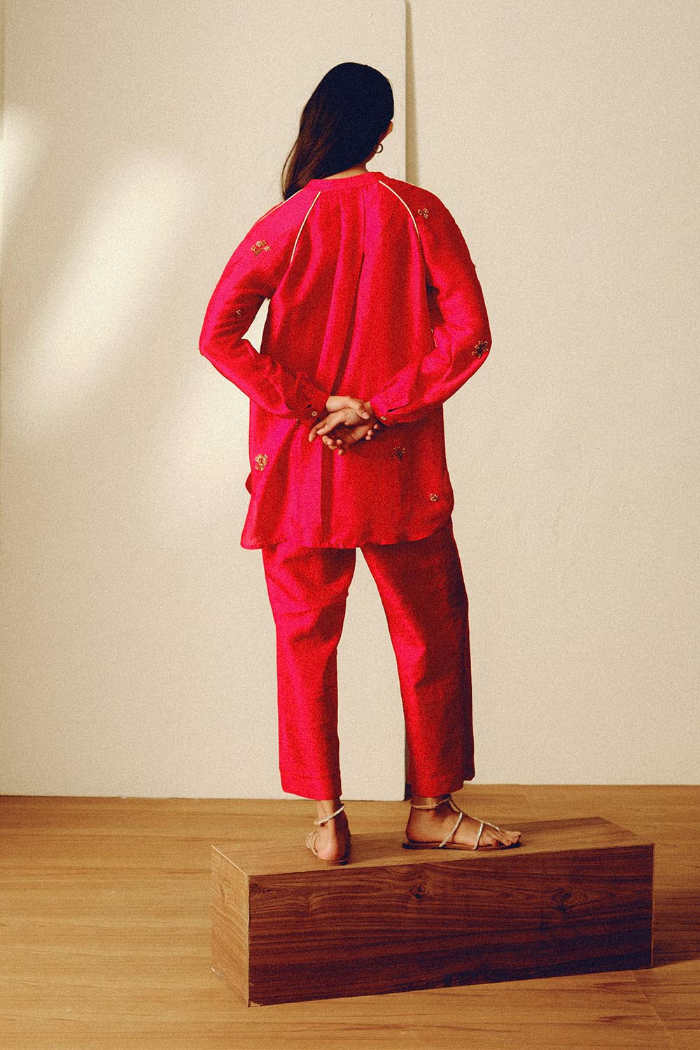 Handwoven mulberry silk ,classic raglan sleeve shirt with hand embroidered beaded motifs and contrast cord piping. The shirt is styled with solid matching narrow pants