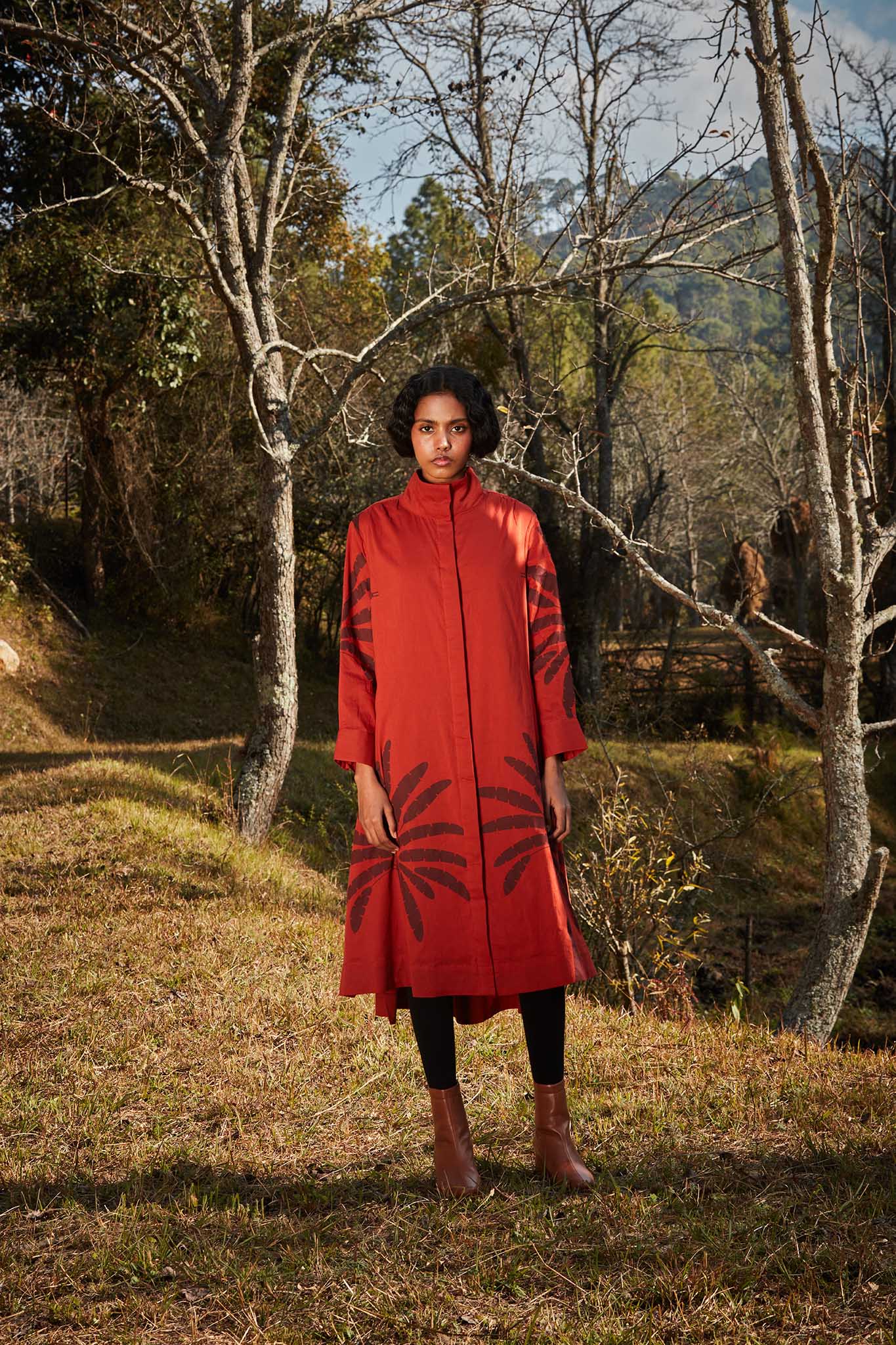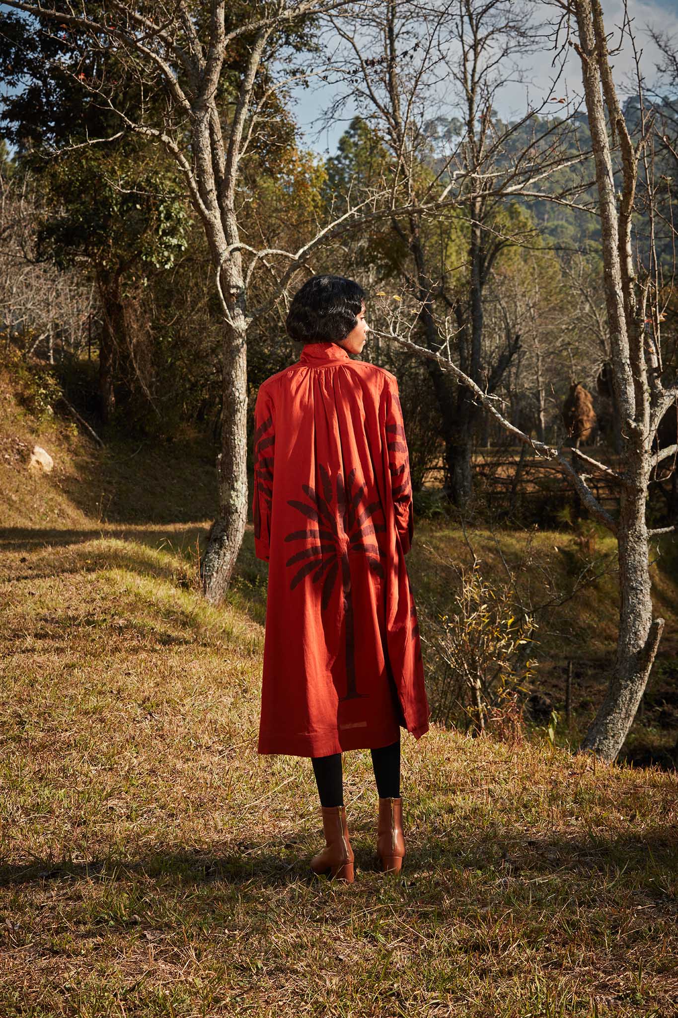 A rustic red signature Khara Kapas dress featuring a high neck, front button opening, and full sleeves for a chic look. This versatile piece is perfect for layering with our Rustic Reverie reversible jacket to create an effortlessly stylish ensemble.
