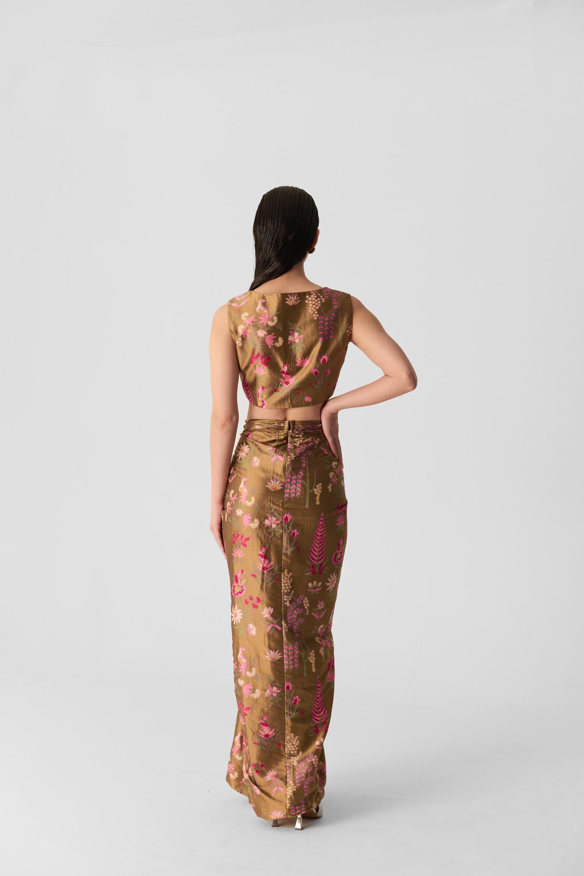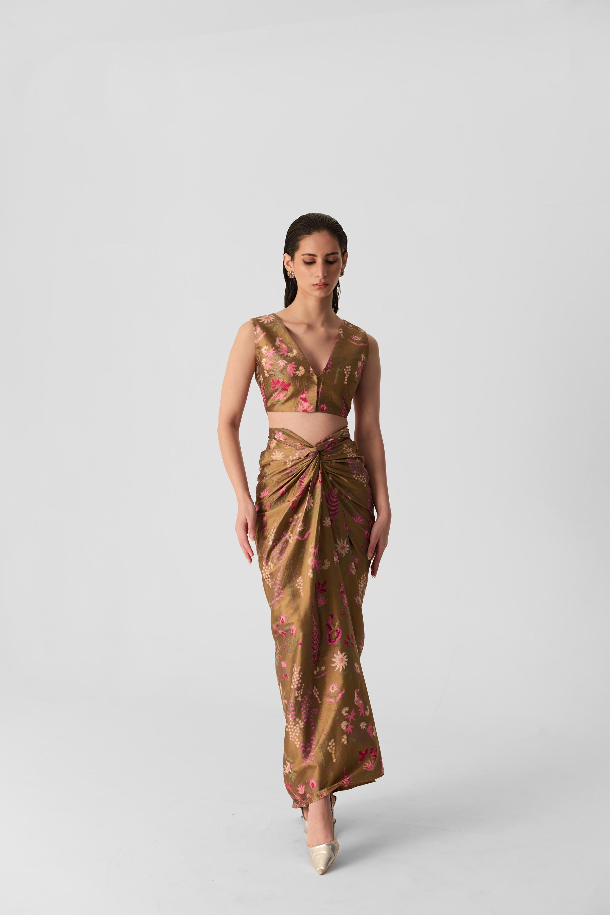 This elegant skirt set is made from premium pure silk, adorned with a beautiful Bahar pink print, crafted through traditional hand-block printing . The skirt features a modern front twisted knot, adding a contemporary touch, and is secured with a center-back zipper and hook-and-eye closure for a seamless fit. Paired with a matching V-neck blouse in the same print, the blouse is designed with a front hook-and-eye closure for a tailored and flattering fit.