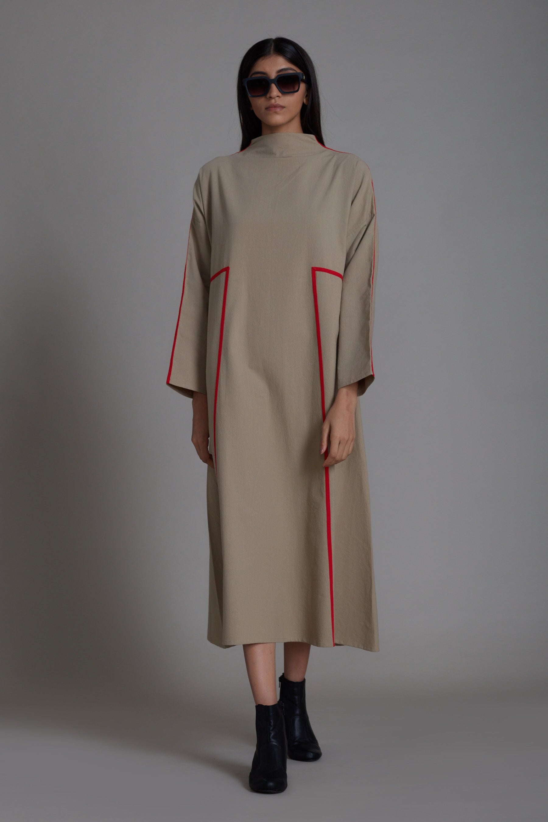 Ankle-length full sleeves dress with high neck, side pockets, and piping detail.