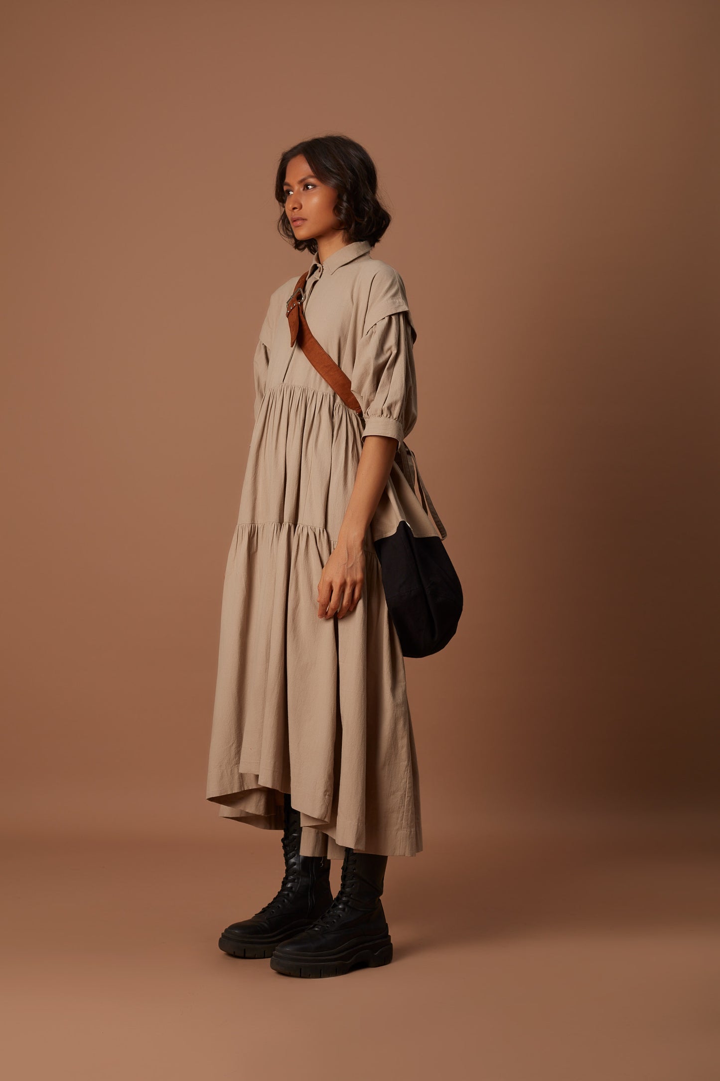 Ankle-length tiered shirt dress with extended balloon sleeves, front button opening and side pockets.