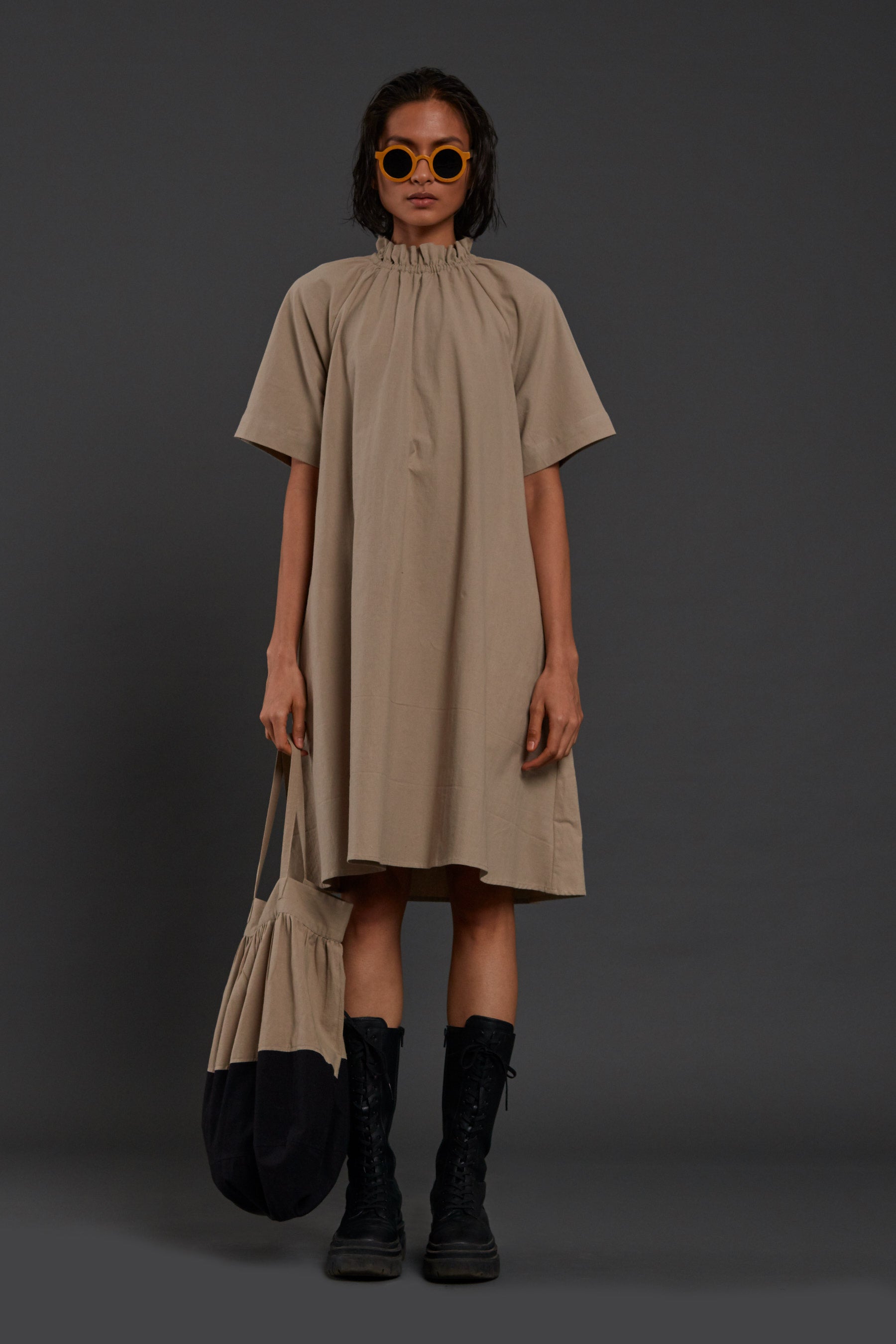 Midi length shift dress with elasticated neckline and raglan sleeves. Comes with side pockets.