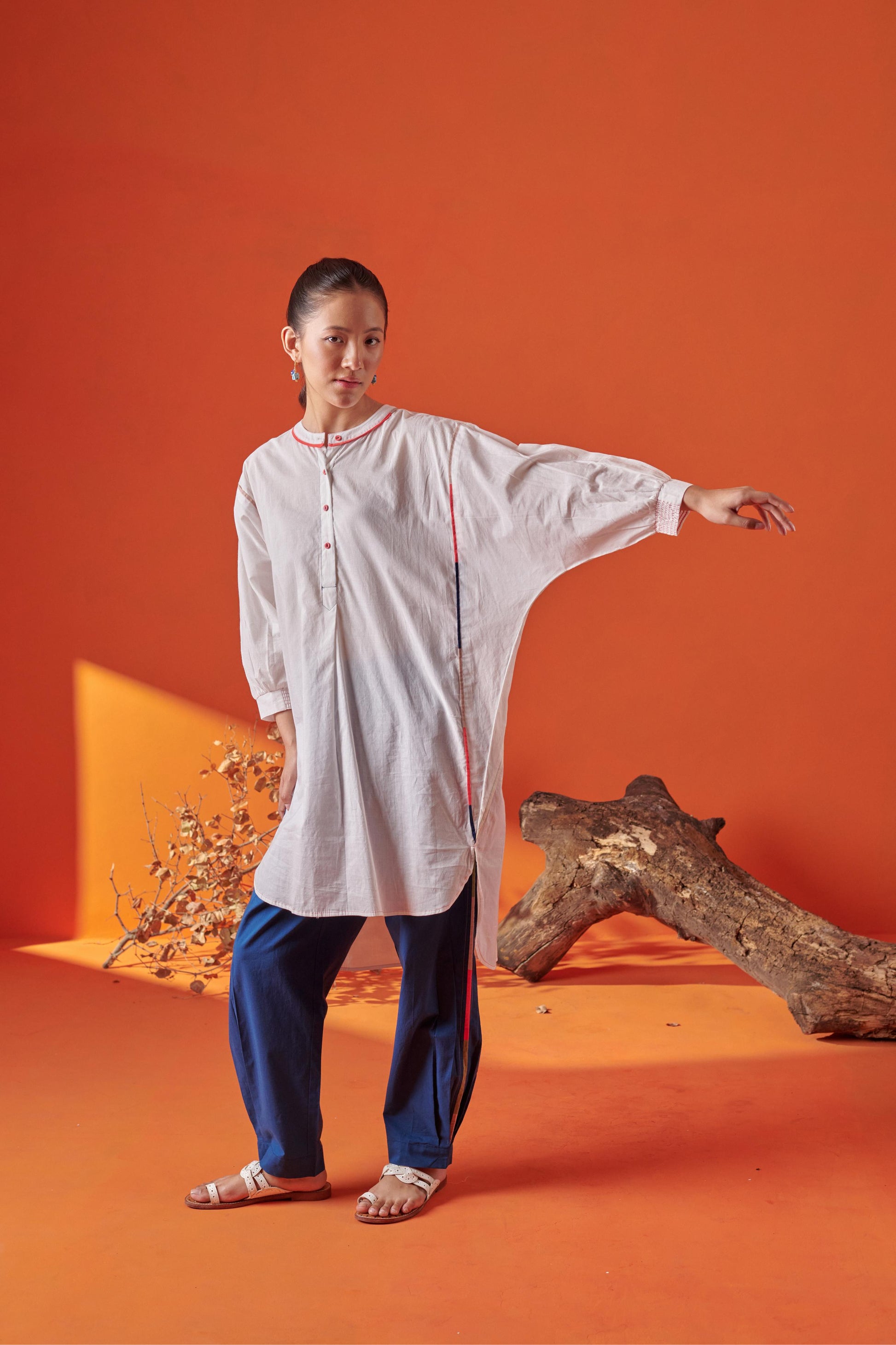 The Bella Tunic is a statement in ease and craft. Designed in an anti-fit silhouette that flatters across sizes, it features a unique asymmetrical cut—Thoughtfully accented along the panelled body and finished with a clean round collar, this breathable cotton tunic brings comfort and style together effortlessly.