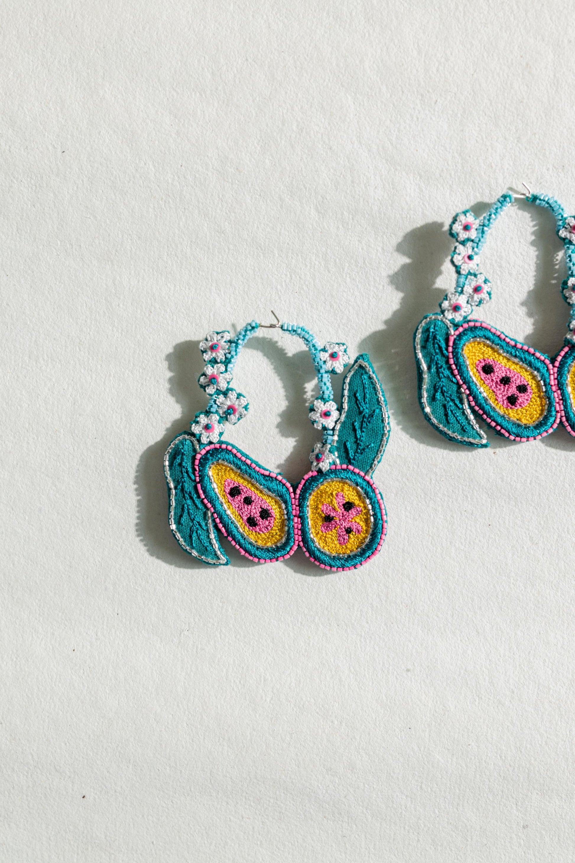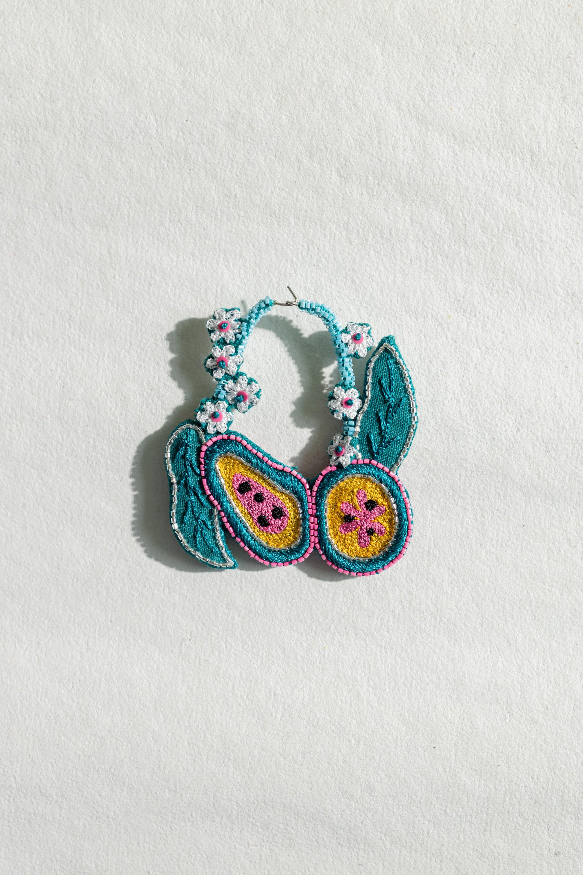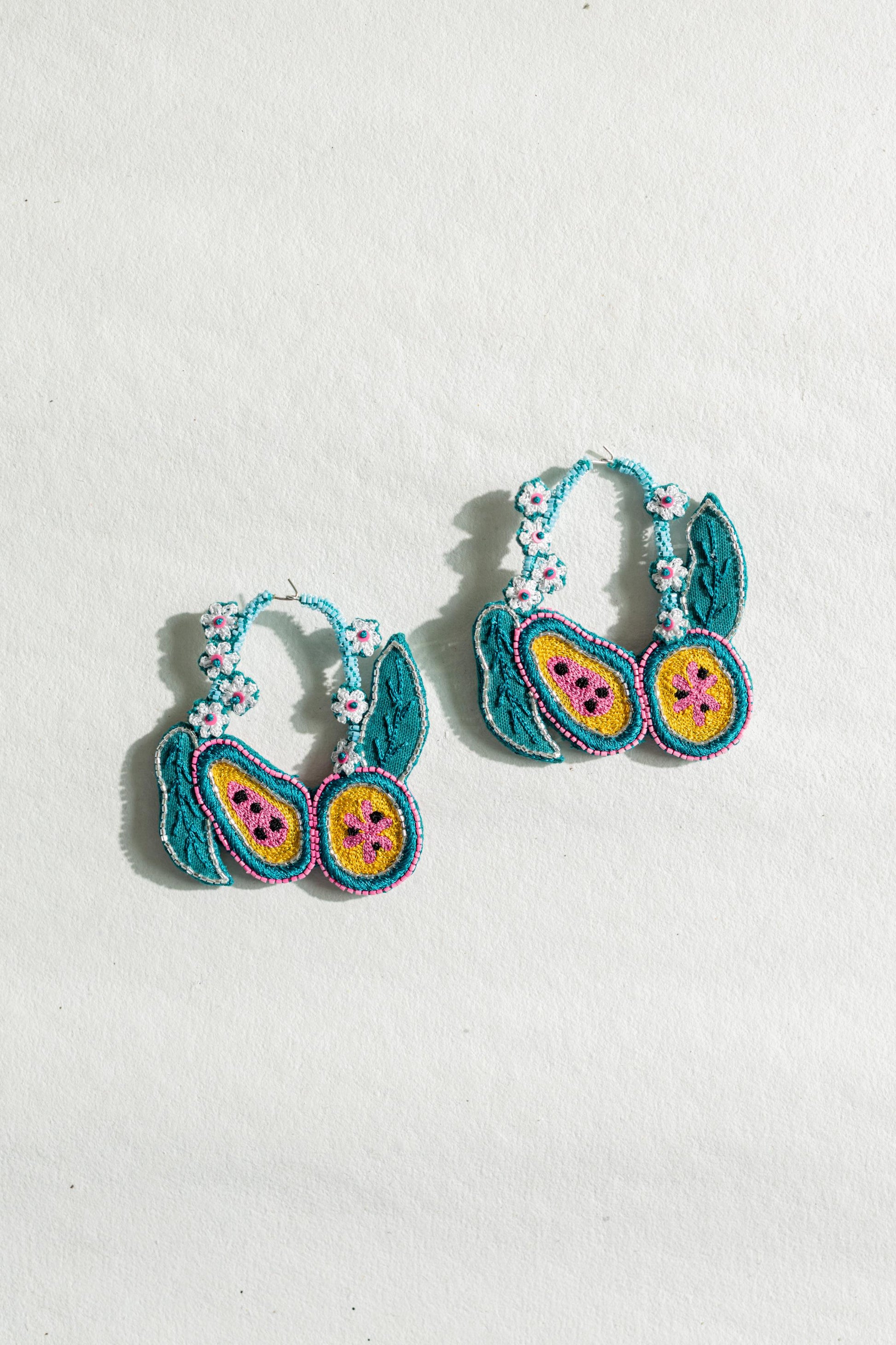 Ever wondered to wear a papaya earrings and that too in such an unique way? Then here you go with our BERMUDA hoop earrings that are detailed with our unique papaya and tiny flower motifs. Hoops are embroidered on both sides. Light weight and easy to carry. Provided with a hook on top.