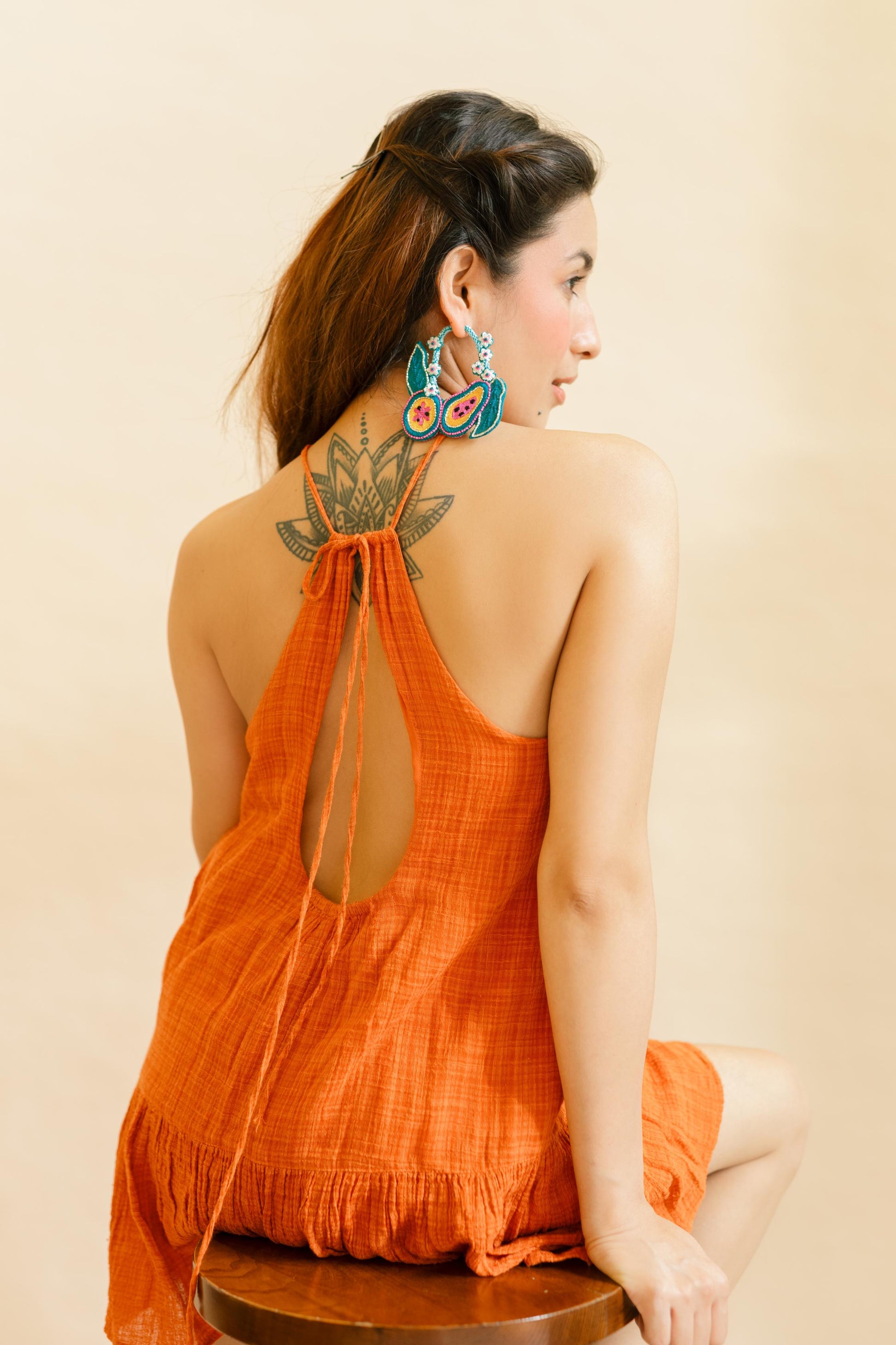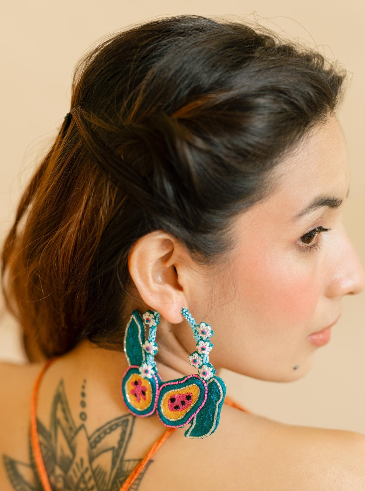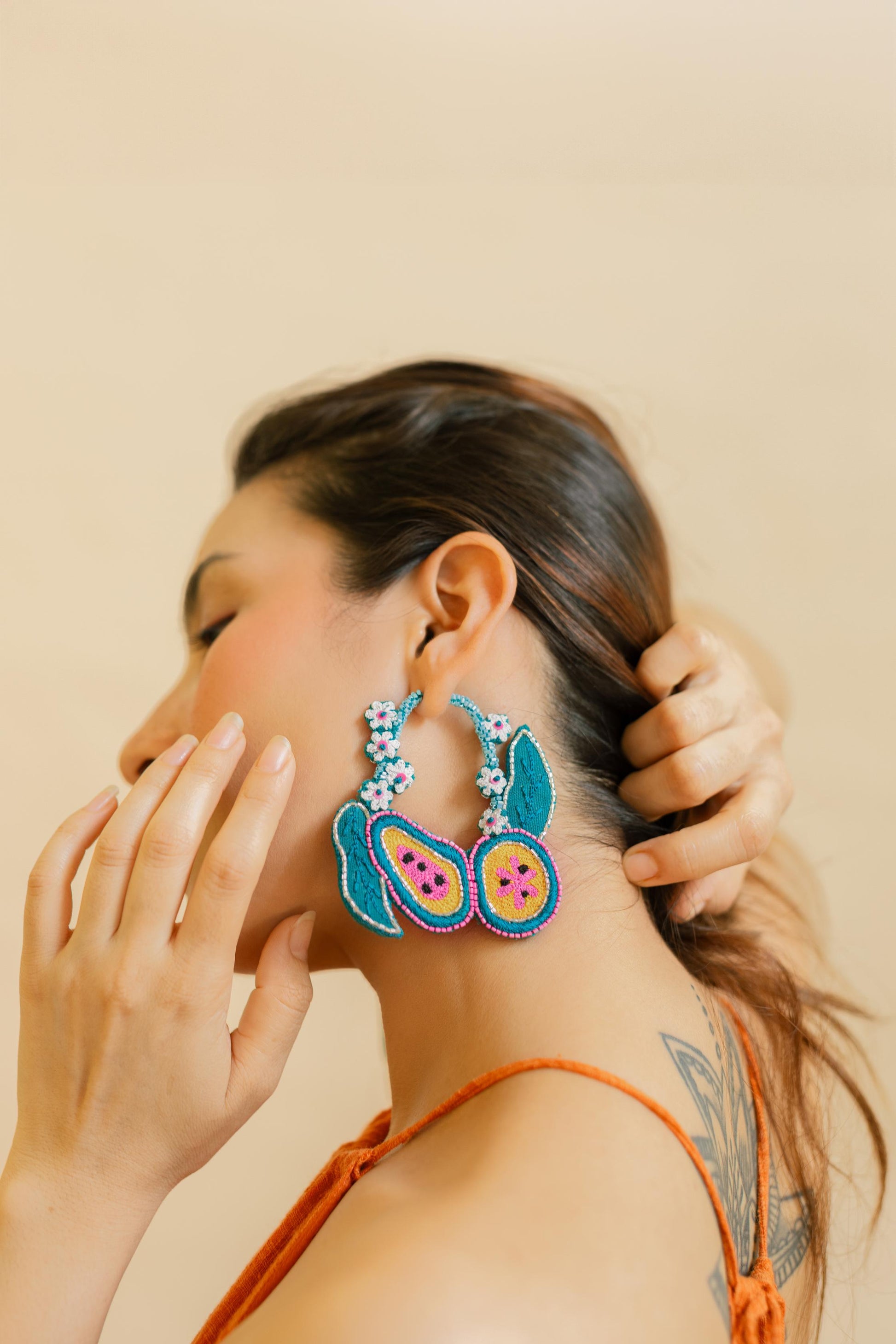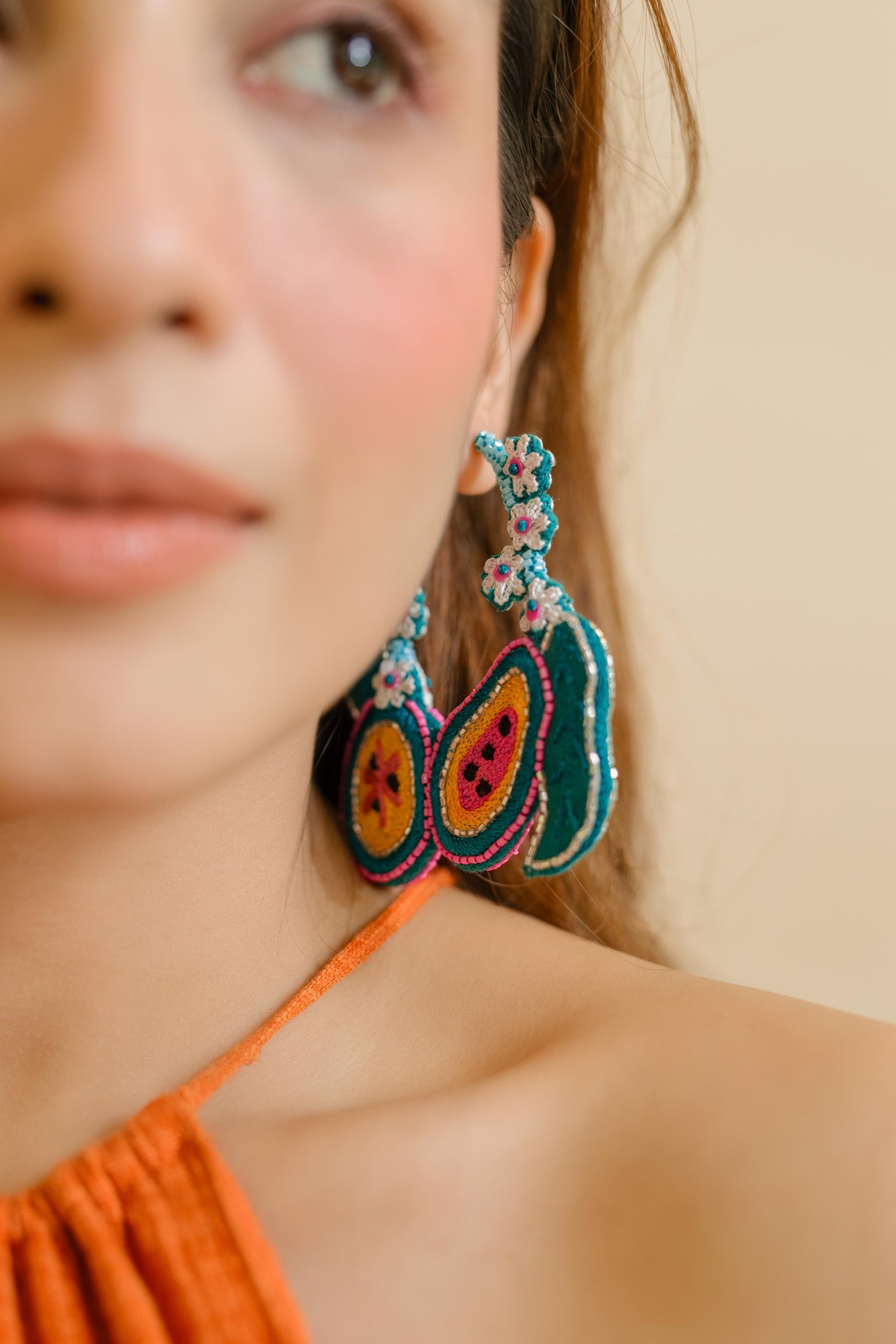 Ever wondered to wear a papaya earrings and that too in such an unique way? Then here you go with our BERMUDA hoop earrings that are detailed with our unique papaya and tiny flower motifs. Hoops are embroidered on both sides. Light weight and easy to carry. Provided with a hook on top.