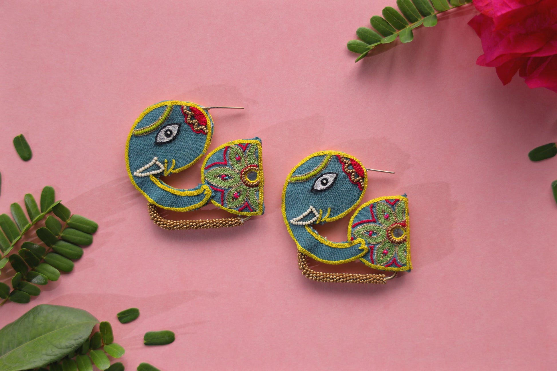 Handmade and hand embroidered earrings with our unique elephant design hoops. Embroidered with silk threads and beads. Earrings are embroidered on both sides. Light weight and easy to carry.
