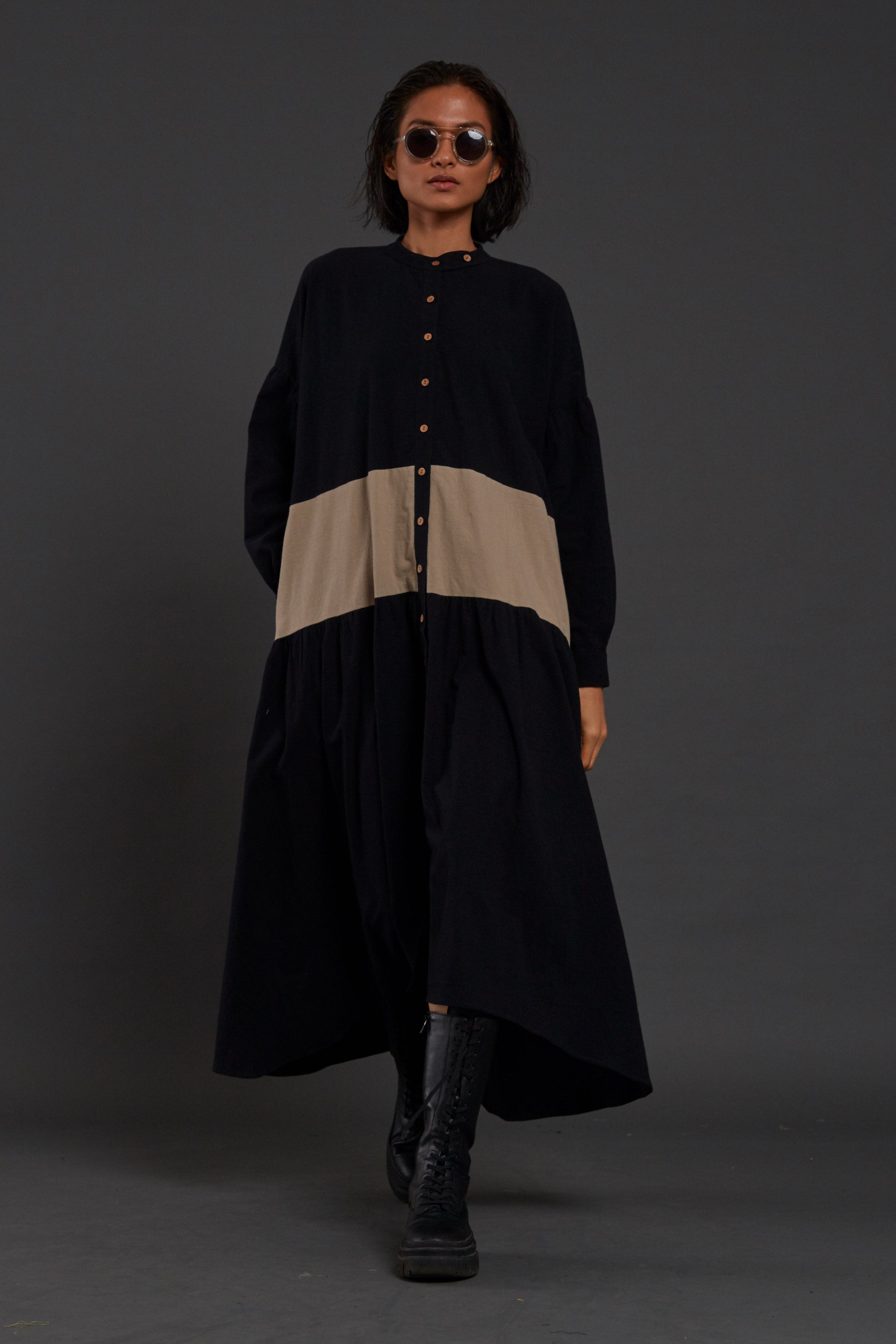 Ankle-length Colour Block shirt dress with front button opening, and side pockets.