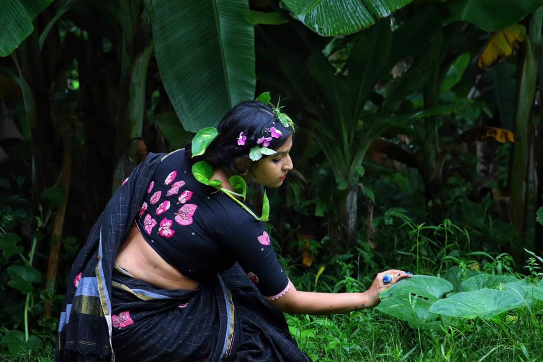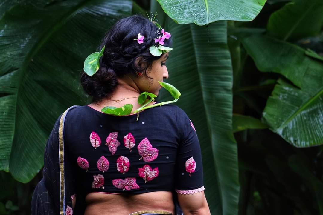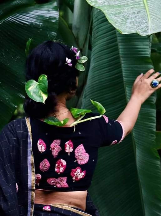 On handwoven black Jamdani, Bougainvillea petals are hand embroidered with little pearl details.