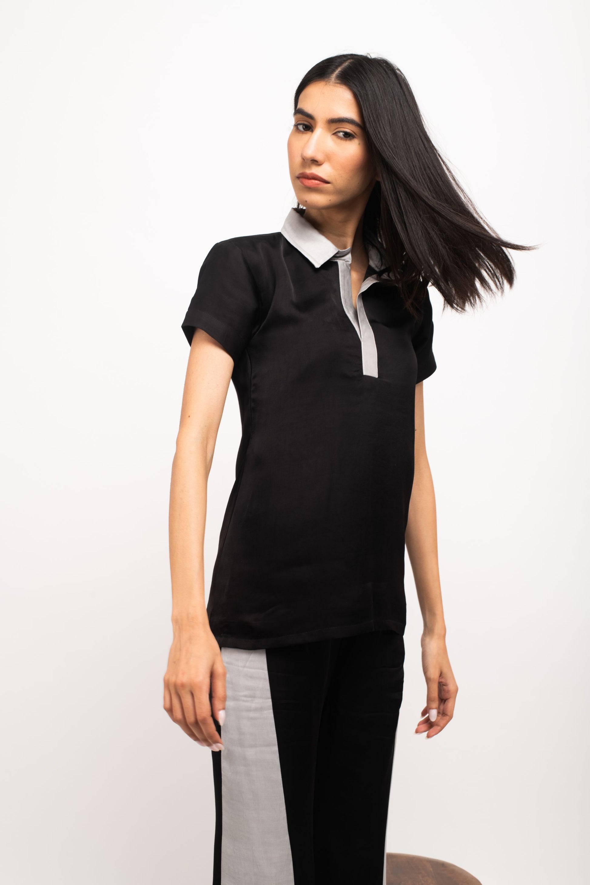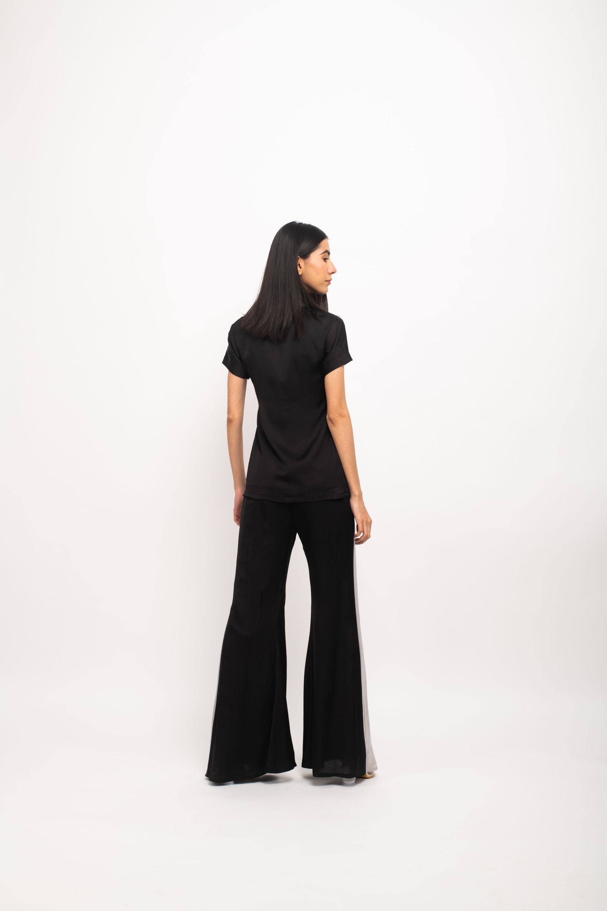 Black-Grey regular fit top with flared black pants with grey panels on either sides