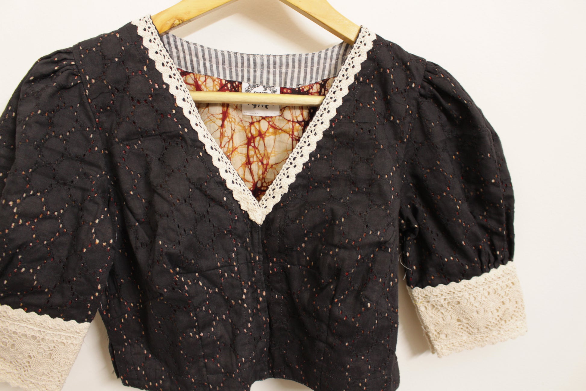 On Black Hakoba version of our quintessential Vintage Blouse with lace details on neck and sleeves. We have used Batik fabric as lining to the blouse.