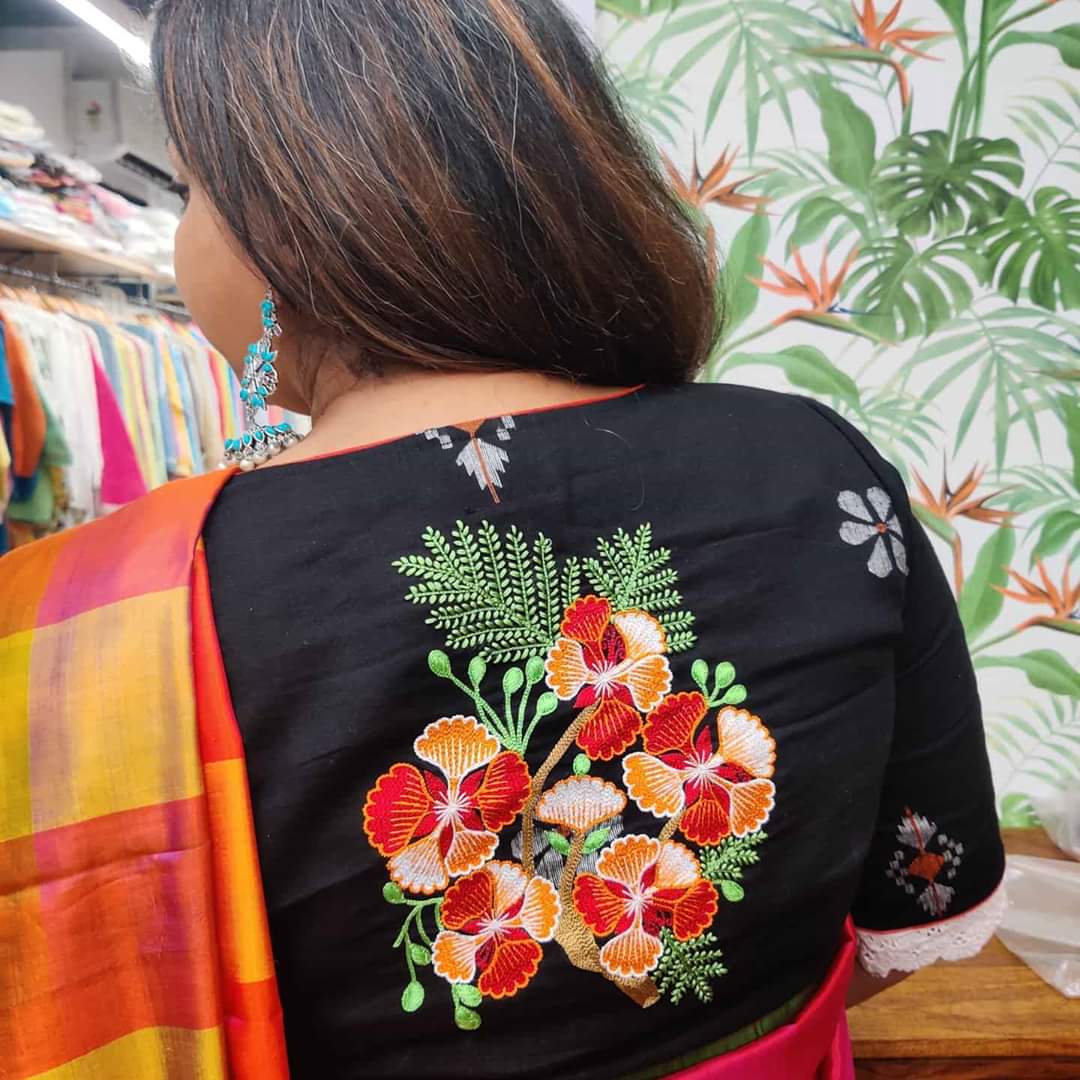On black jamdani, Gulmohar flowers are hand embroidered. A splash of summer and happy orange hues.