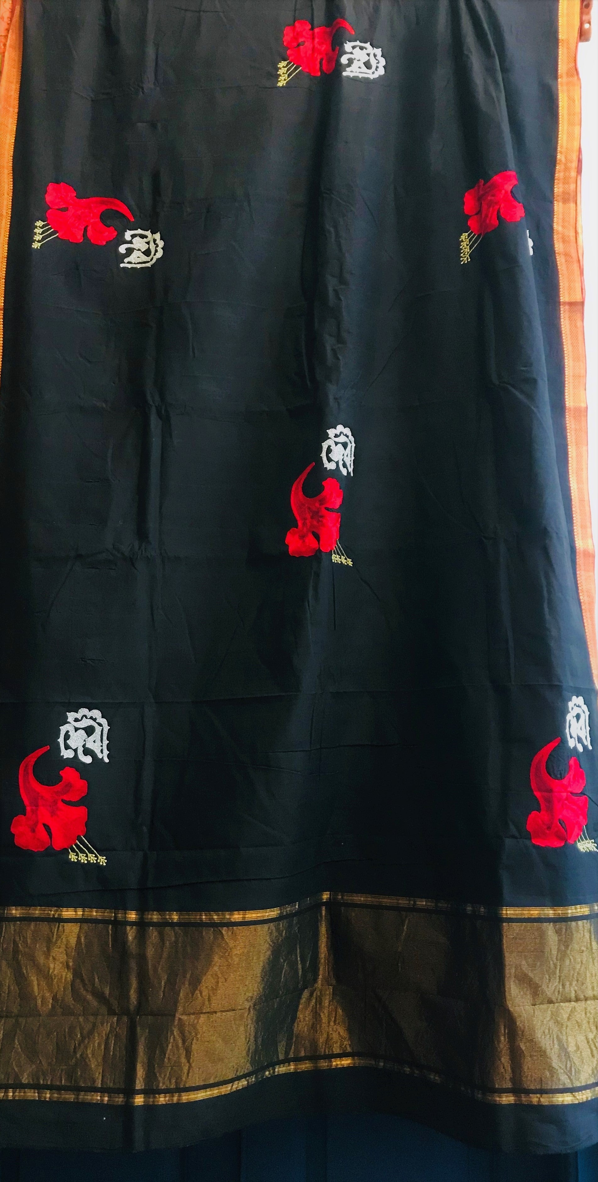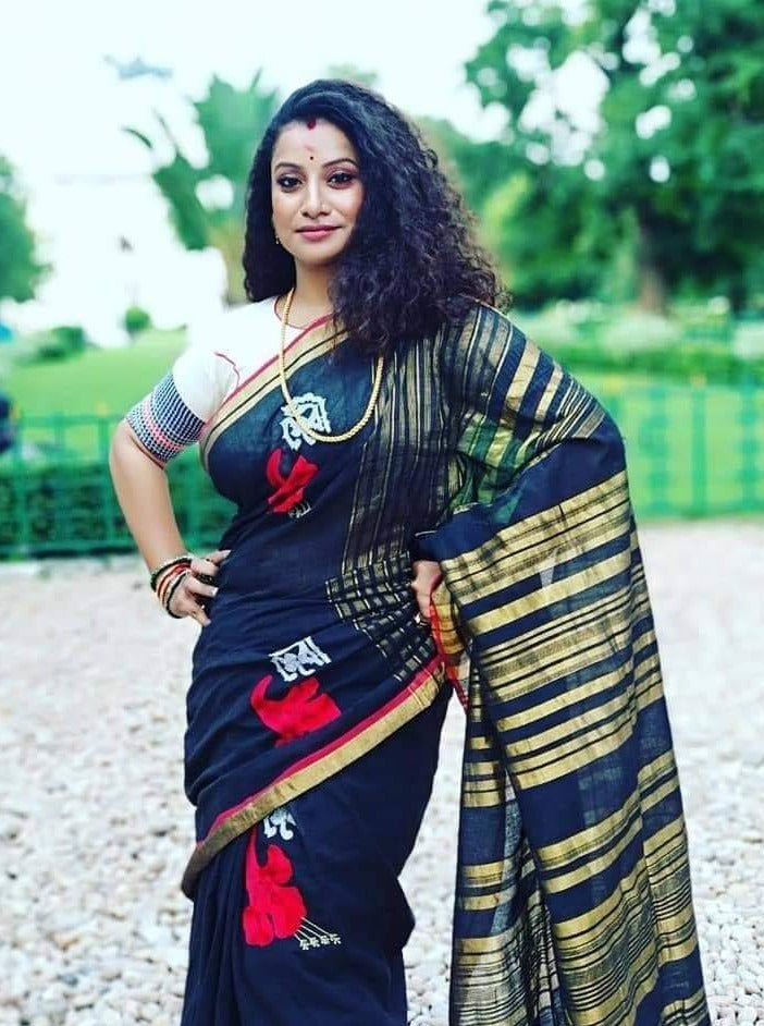 On black handwoven Mangalgiri saree, Debi poster (unused in the movie), illustrated by Satyajit Ray are hand embroidered.
