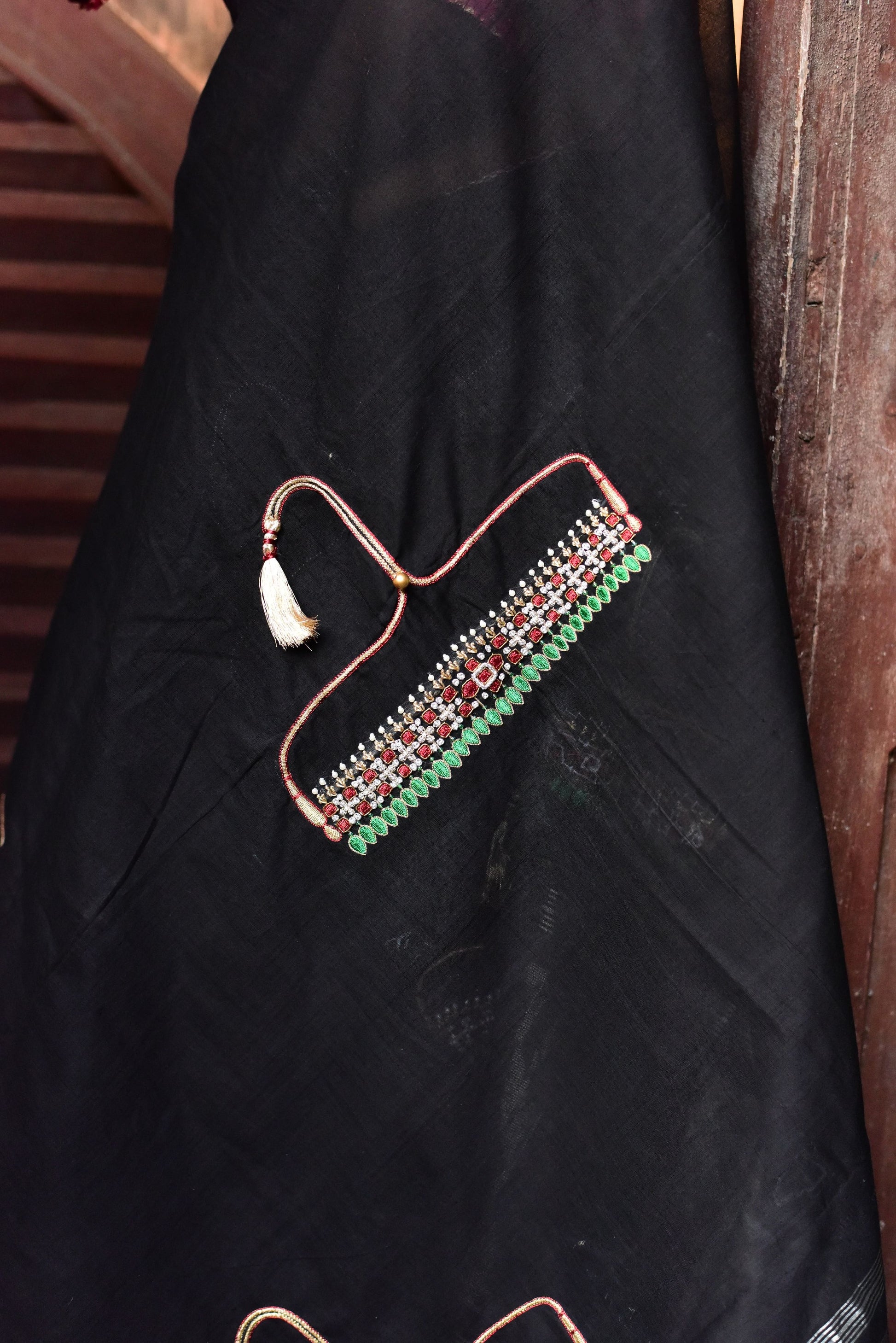 Handwoven black mangalgiri with silver border. Zardosi neckpieces hand embroidered on the upper part of the saree. Perfect for Nabami night
