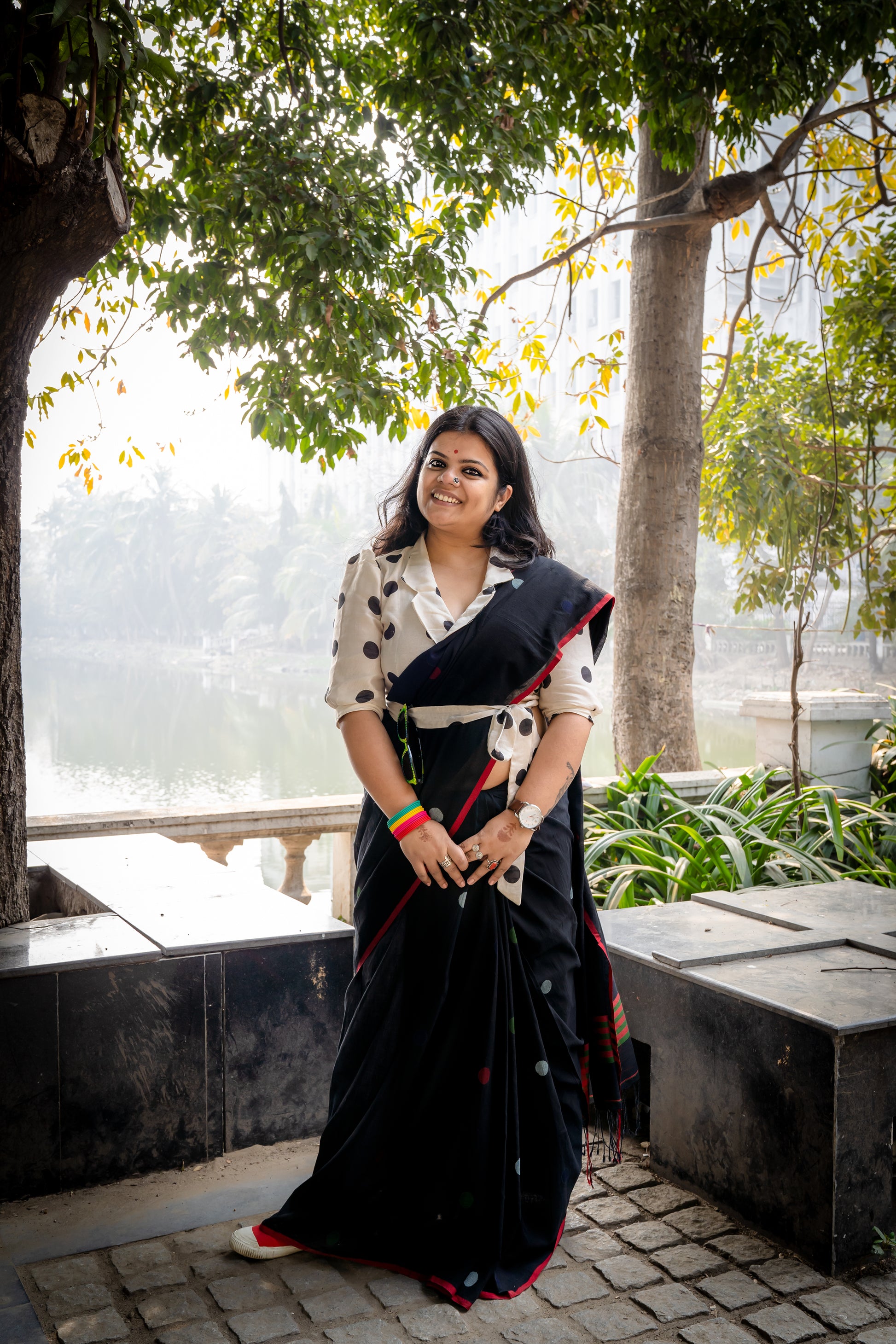 Feather soft, fine hand woven Jamdani with multi coloured polka dots woven all over. I call this saree "Pahar Sharee" because one can easily climb mountains in this one without feeling even once that they are draped in a six yard.
