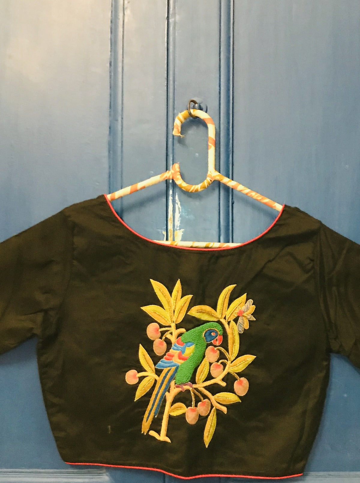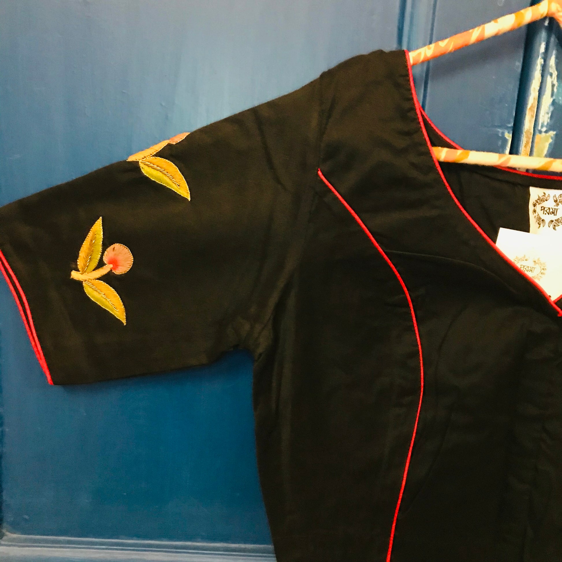 On Black cotton silk, parrots from vintage mosaic tiles are hand embroidered delicately. A stunning piece with embroidery details on hand.