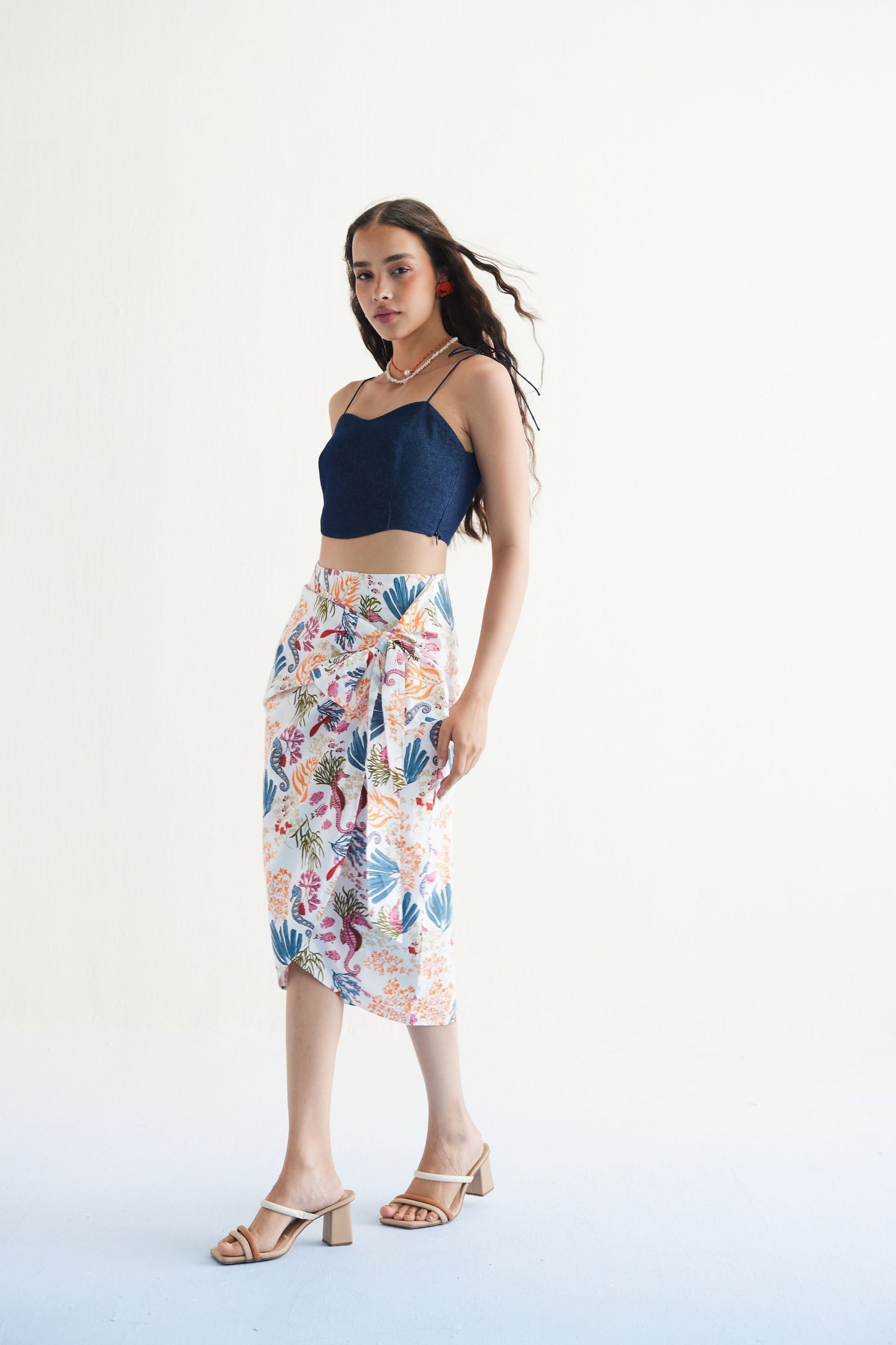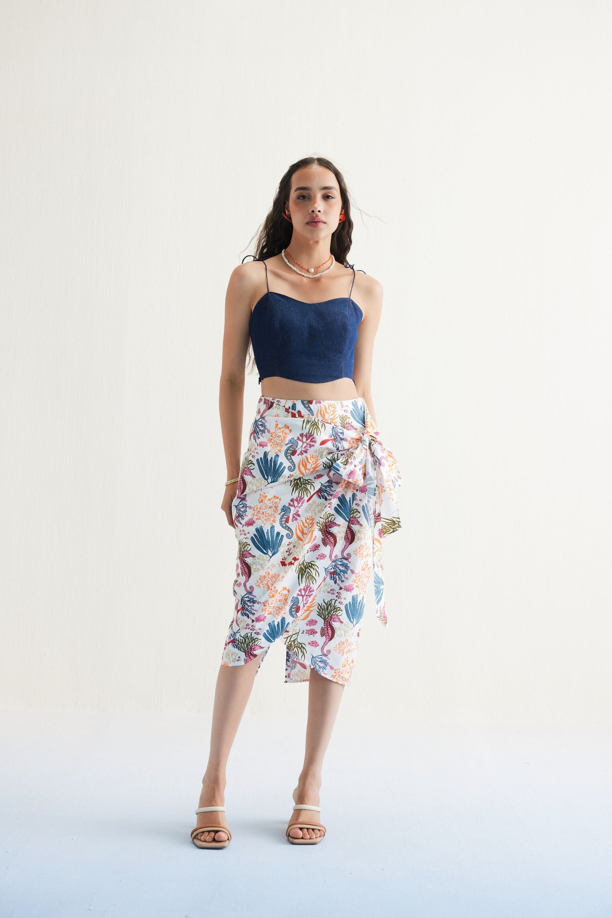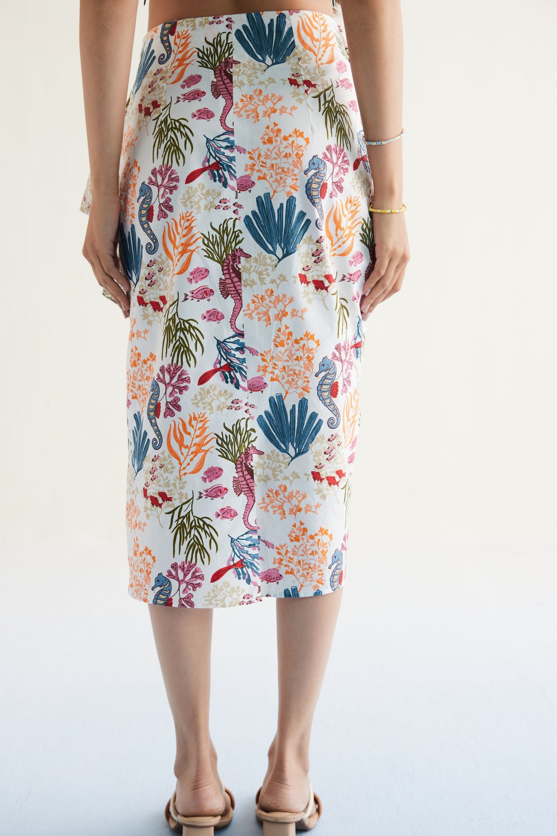Fitted, midi wrap skirt with tie at the hip crafted in organic cotton poplin fabric, screen printed with our signature ocean life inspired motif using azo-free dyes.
