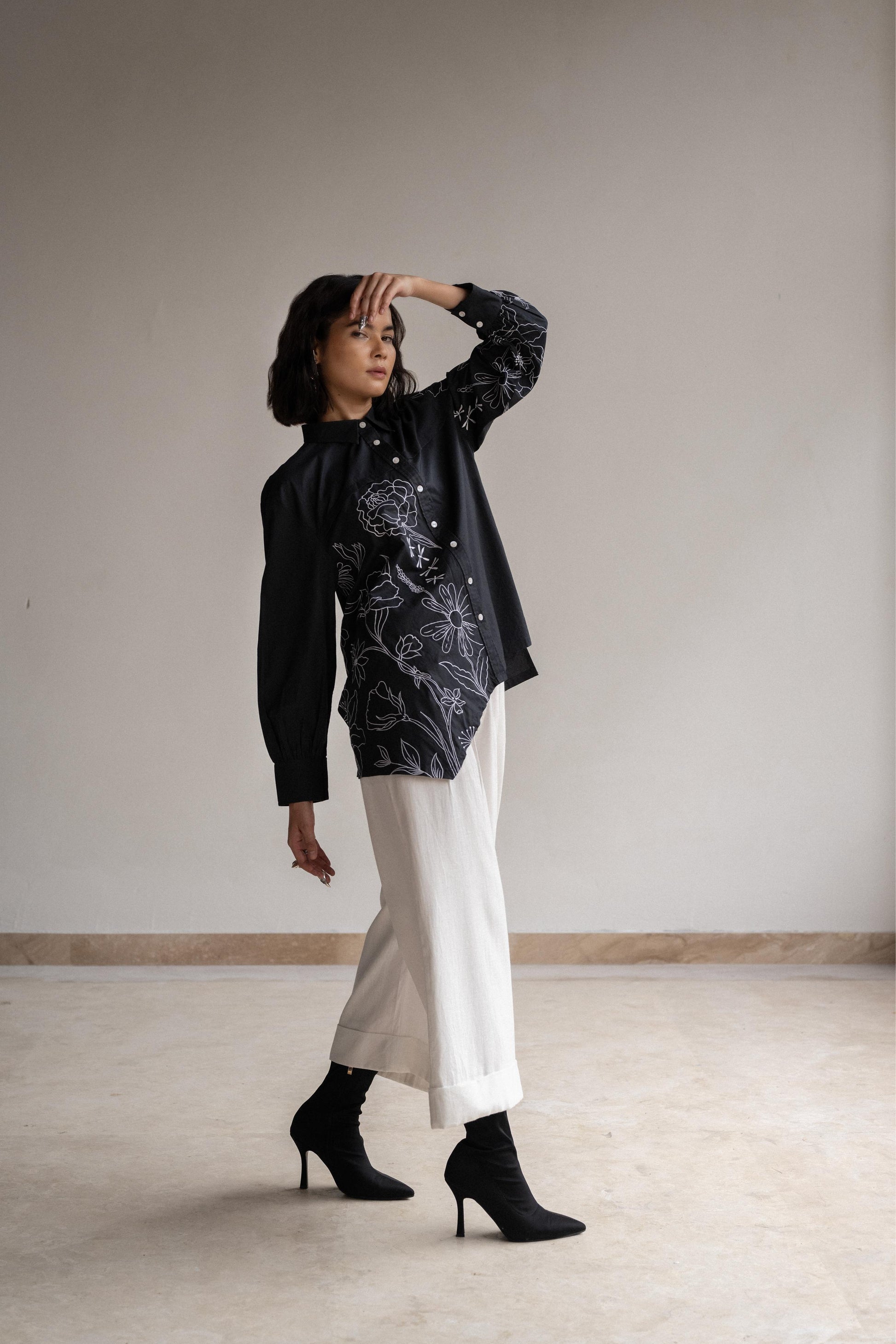 Asymmetrical oversized shirt- a fusion of contemporary style and nature inspired artistry. The Contrasting embroidery of white over black featuring the flora and fauna, emphasise the beauty of harmony in nature. Comes in Contrast white buttons, front horizontal placket and gathers around sleeves cuff.