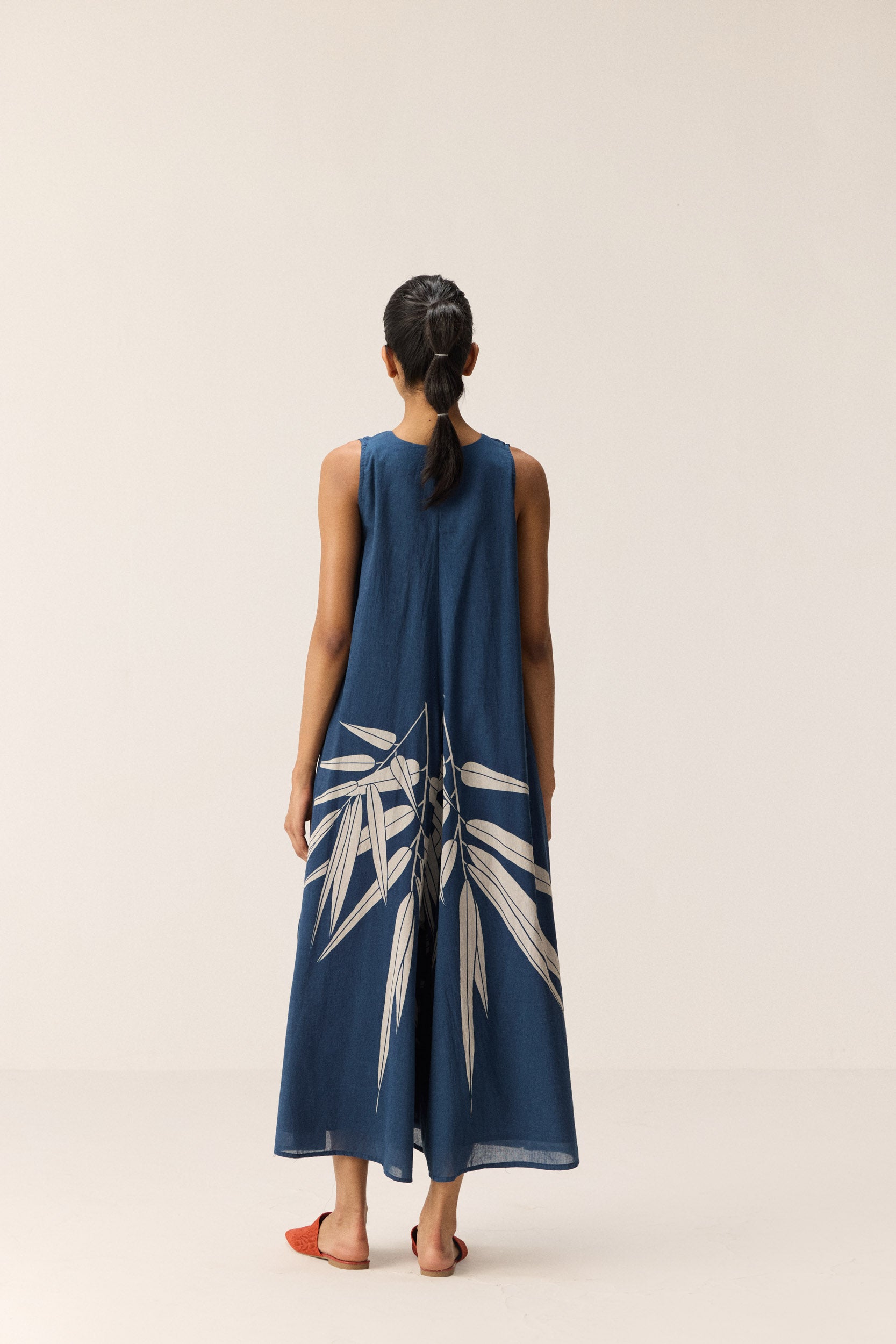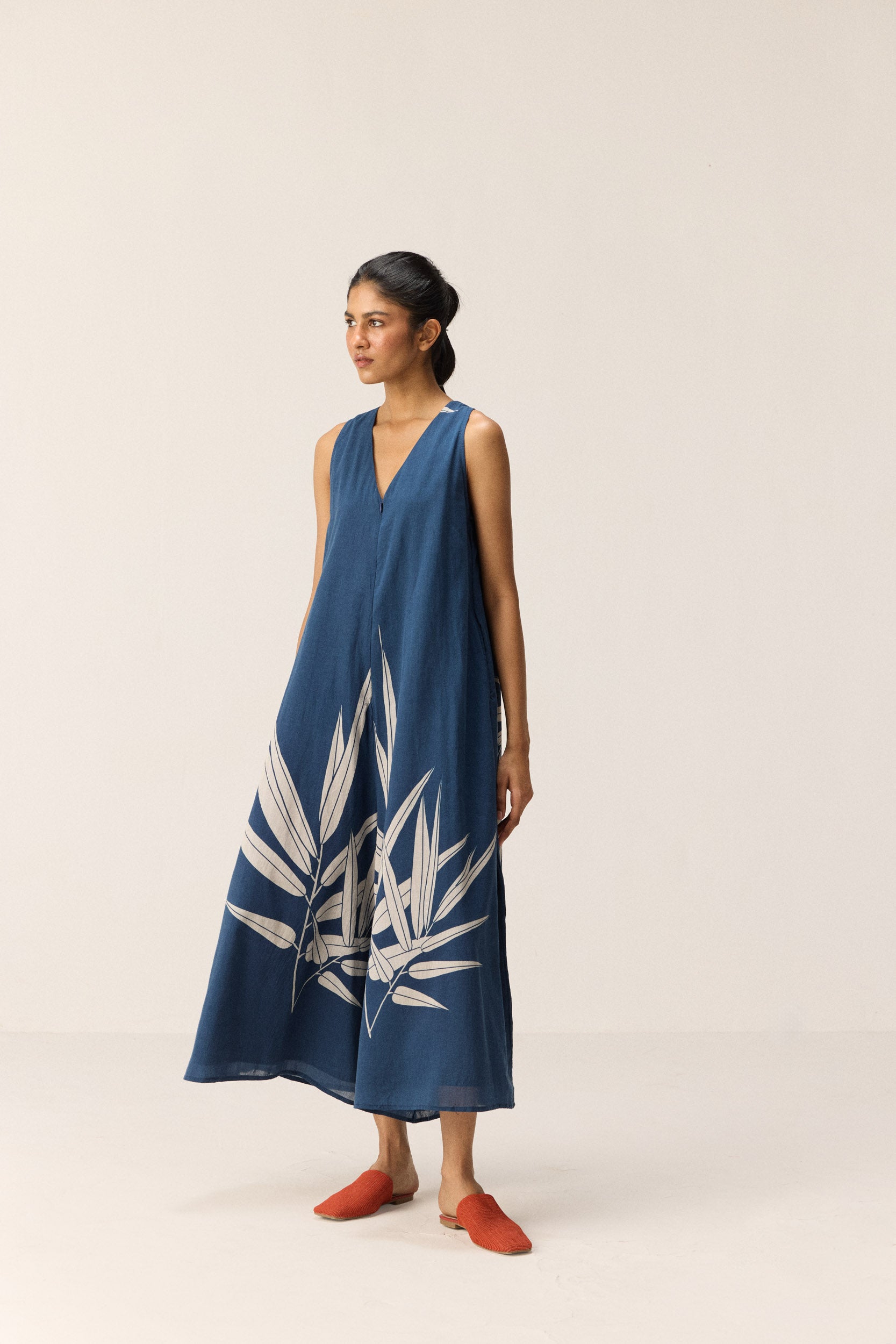 A classic Khara Kapas silhouette — this sleeveless blue jumpsuit in airy cotton mul features a striking white fern print on the front and a zipper for opening. It is suitable for all body types and is timeless.