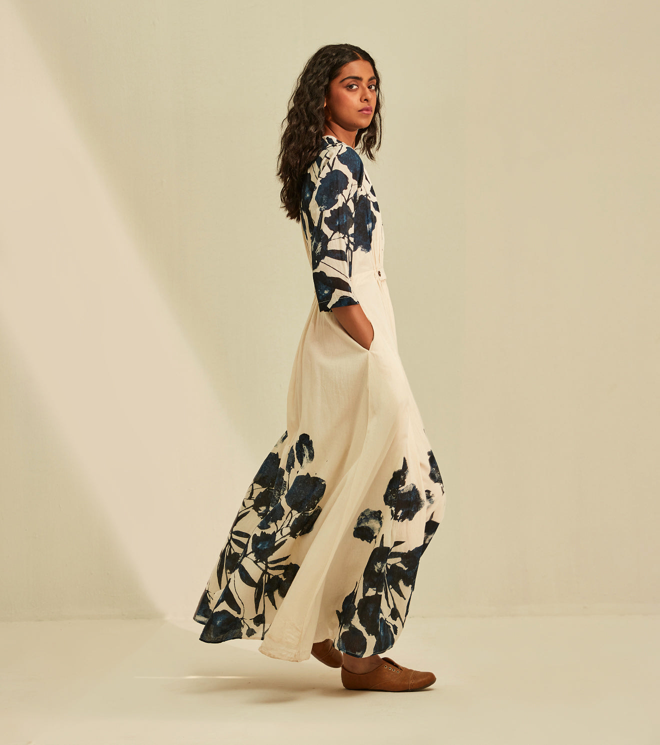 Step into summer grace with our maxi dress, in off white adorned with signature floral print designed to flow effortlessly with your every move. Crafted in soft cotton mul. Handcrafted in India. Side seam pockets. Fully lined.