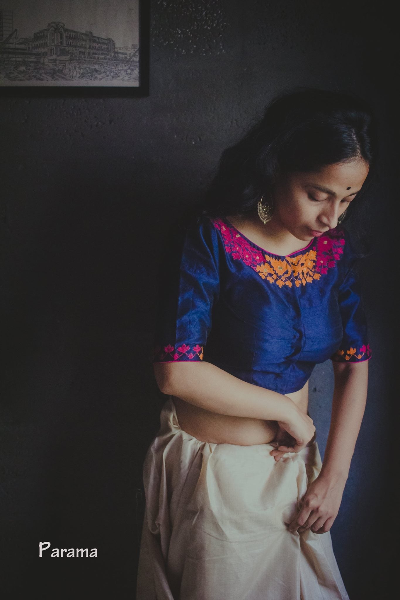 On Royal blue raw silk,Jamdani pattern motifs embroidered inspired from Kaberi Basu's sharee in Ray's Aranyer Dinratri.