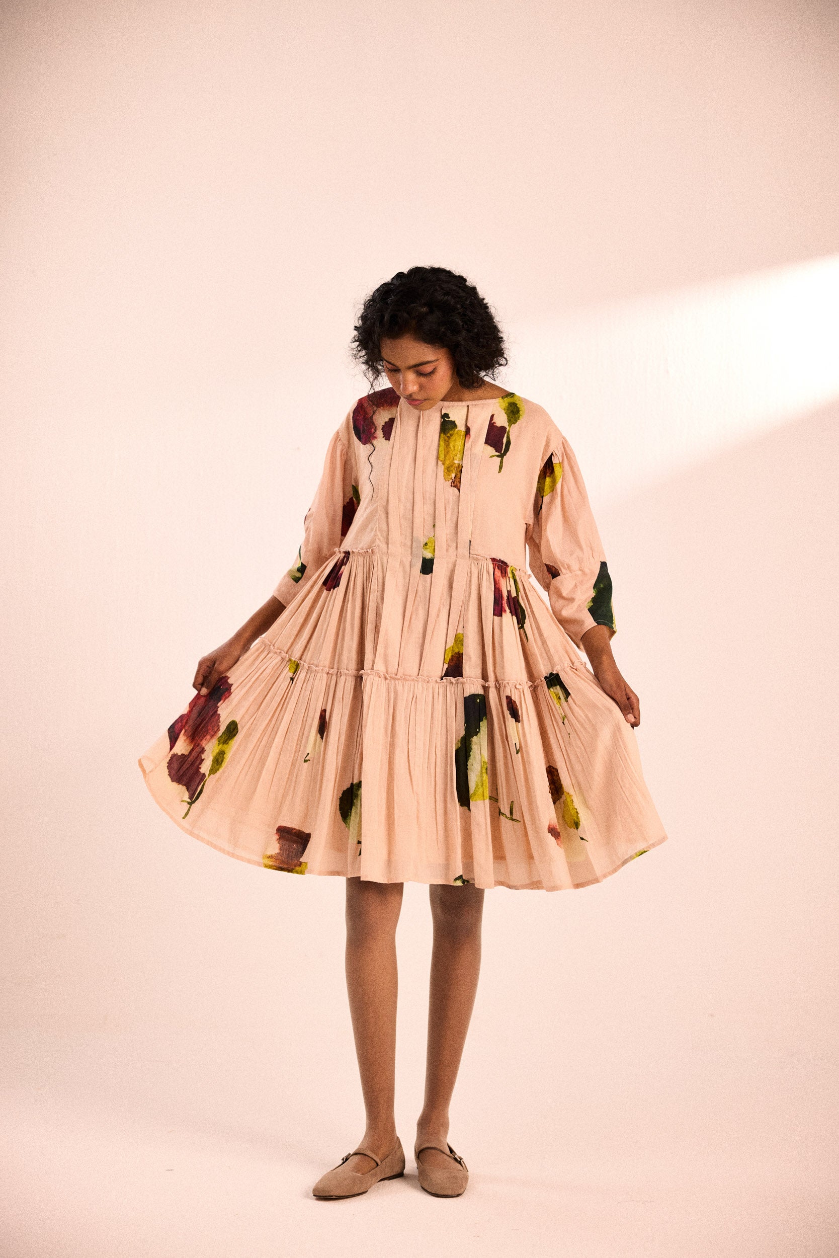 A relaxed, tiered dress with pintuck detailing on the bodice, three-quarter sleeves, and a fluid silhouette. Crafted in cotton mul, the abstract floral print adds a touch of artistry to its soft blush hue.