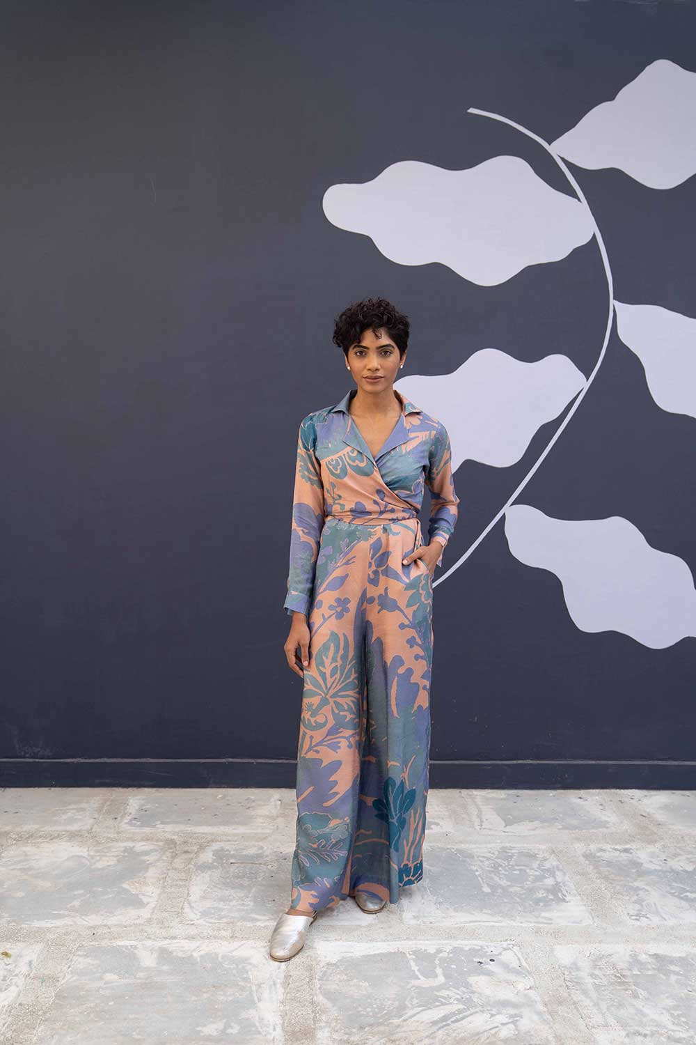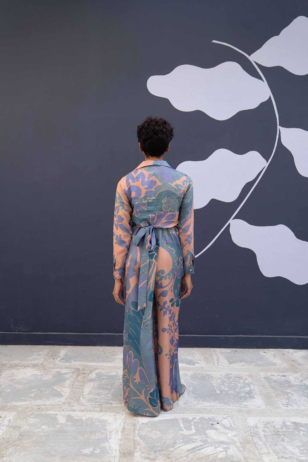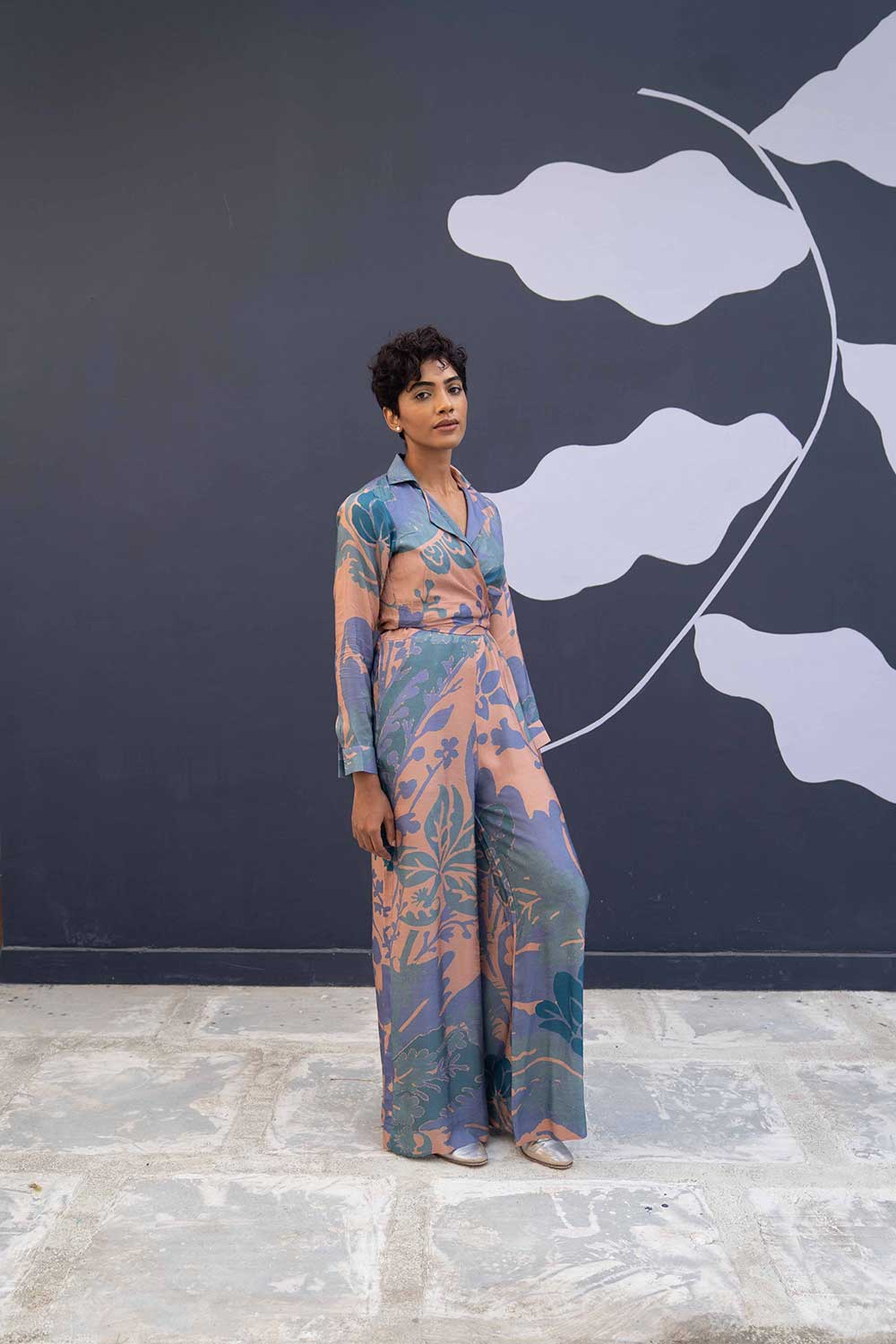The jumpsuit is a two piece set in dora silk comprises of a tie up shirt and a classic spagetti jumpsuit.