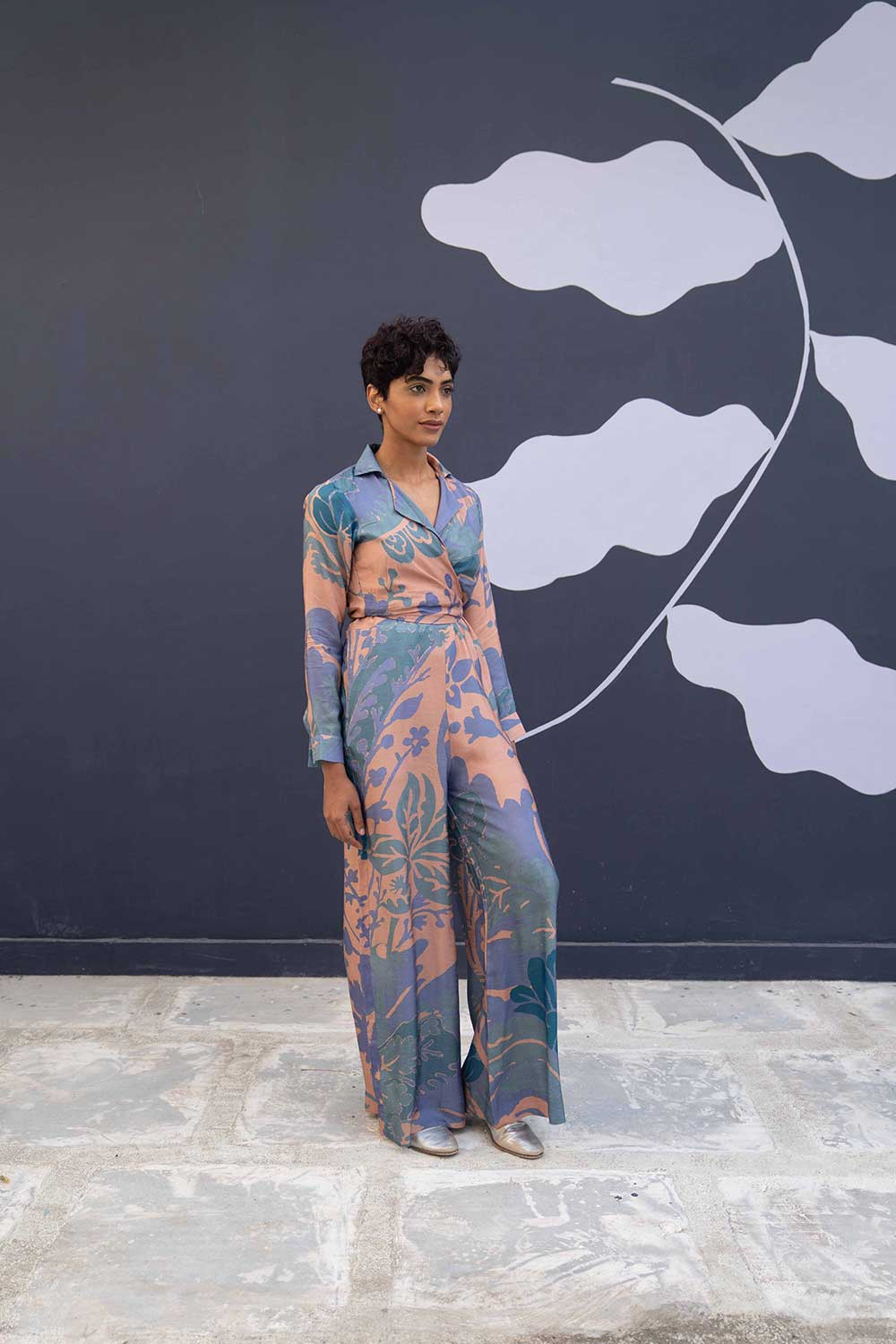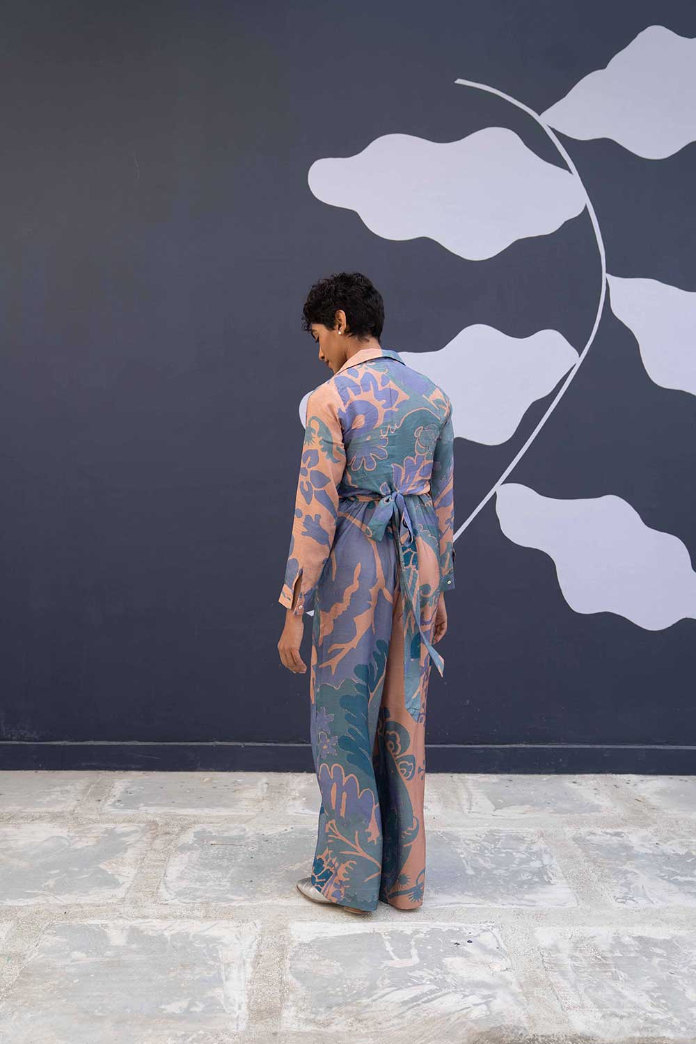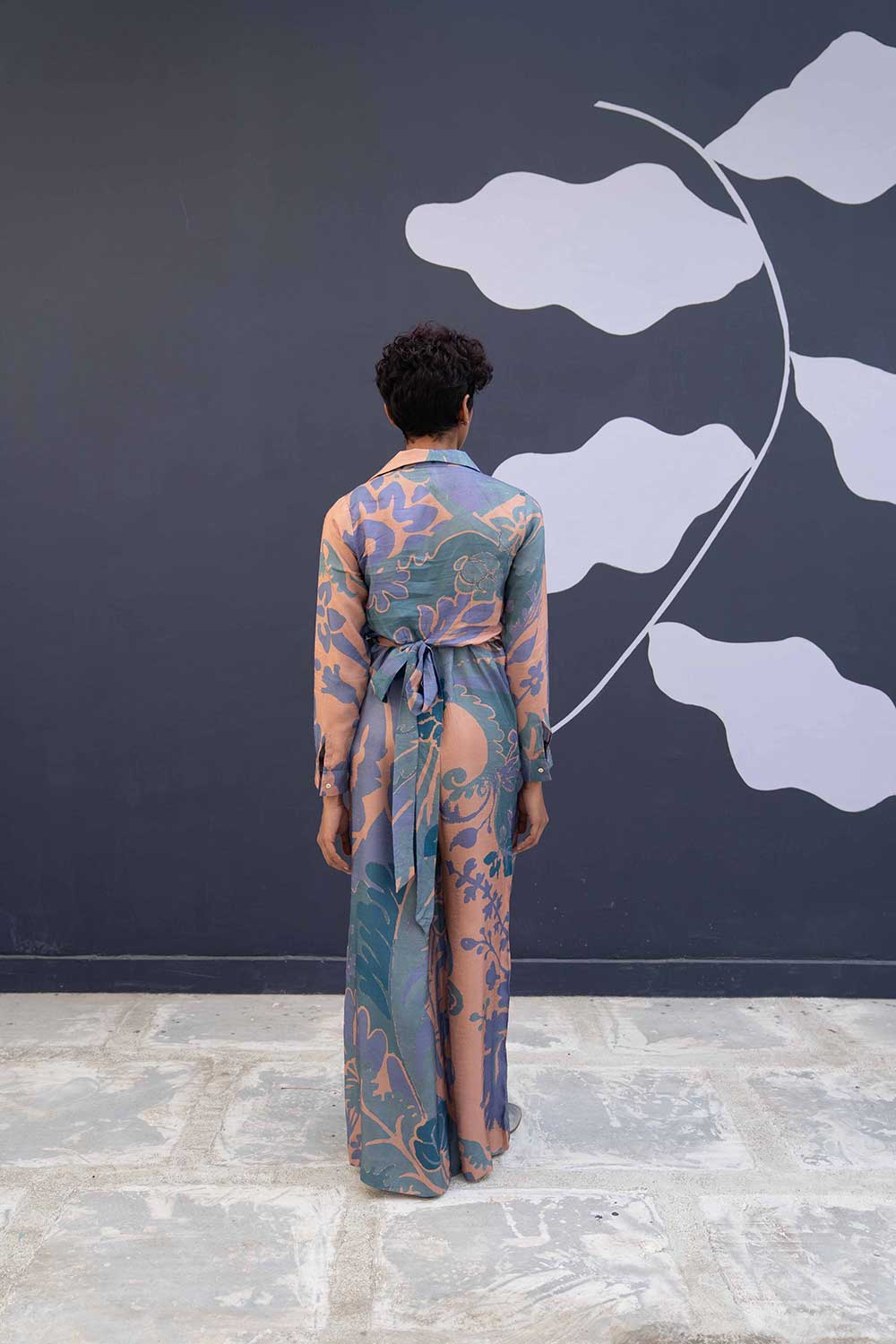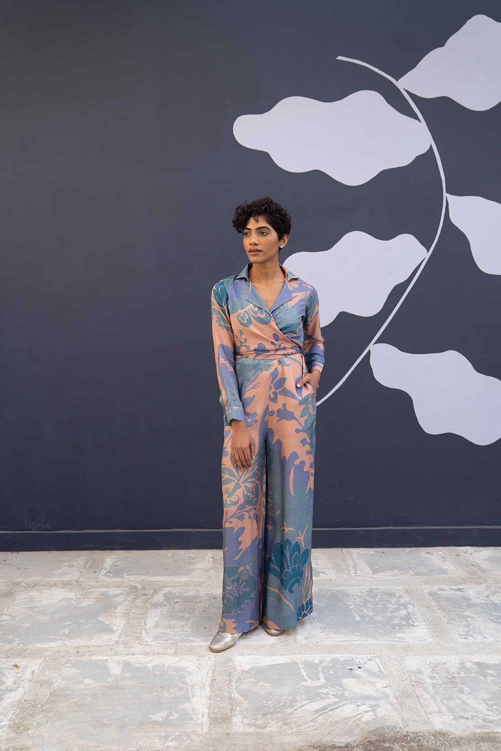 The jumpsuit is a two piece set in dora silk comprises of a tie up shirt and a classic spagetti jumpsuit.