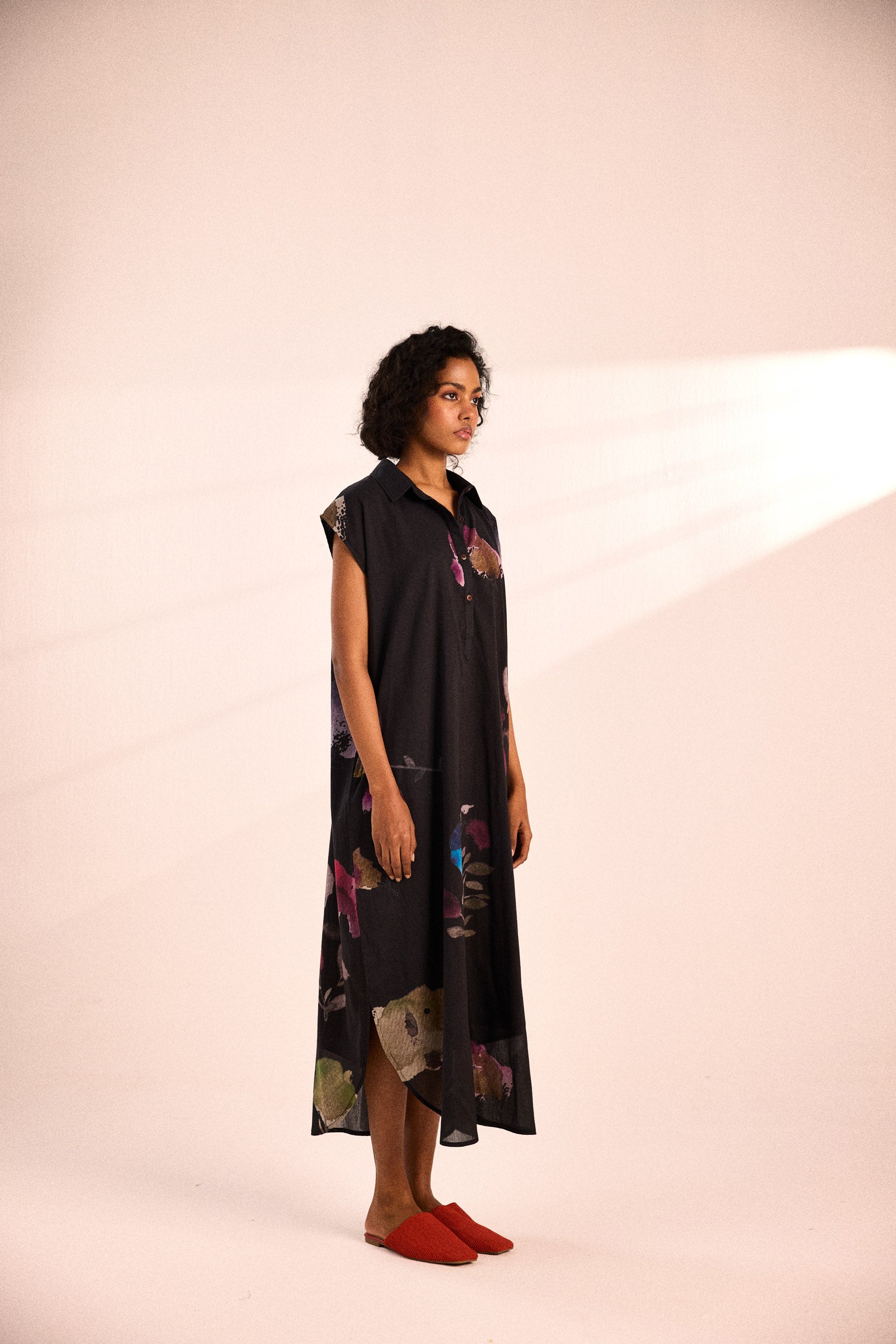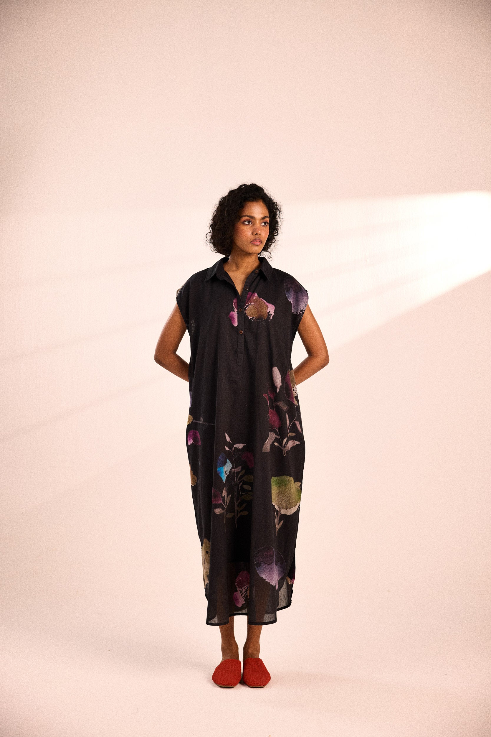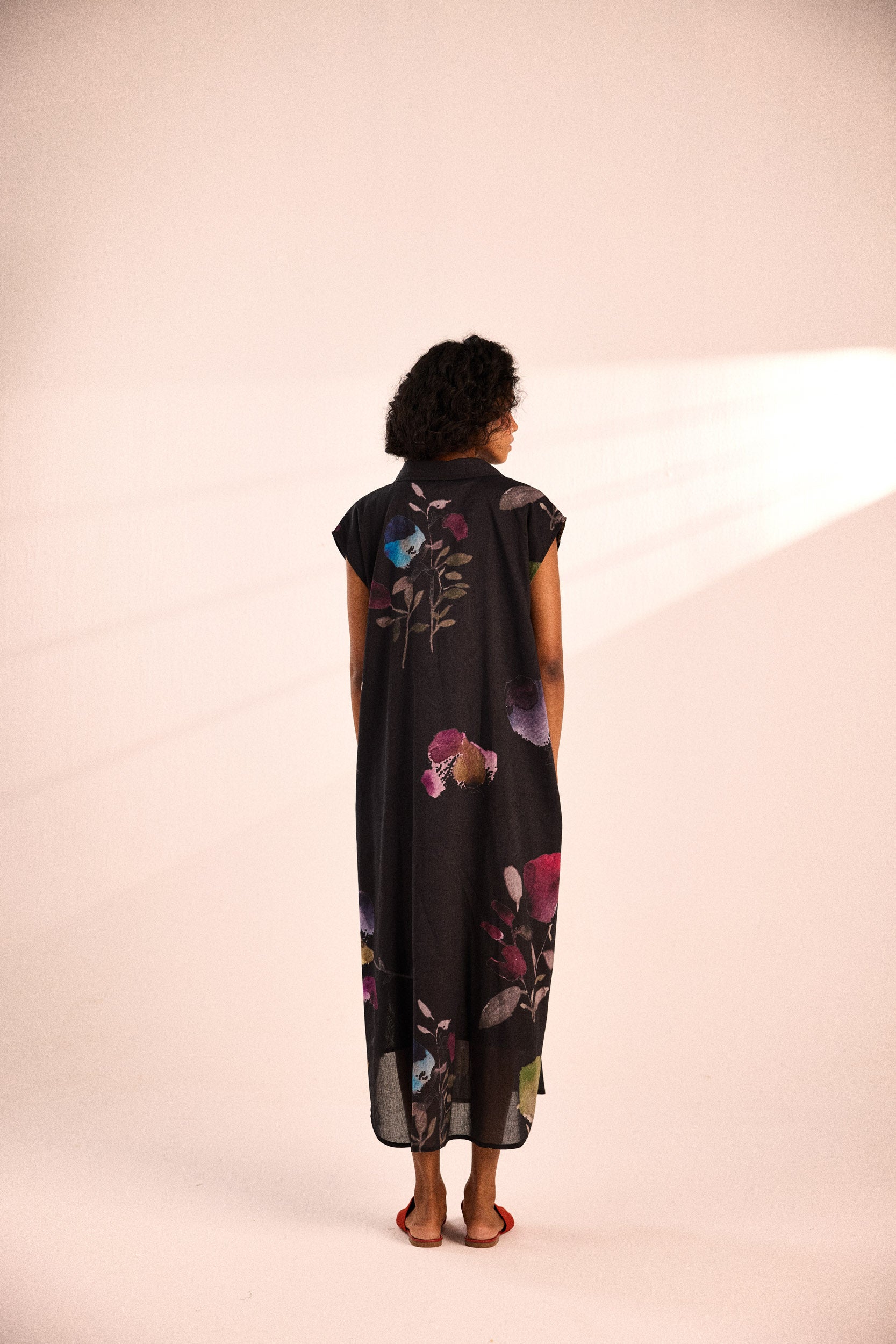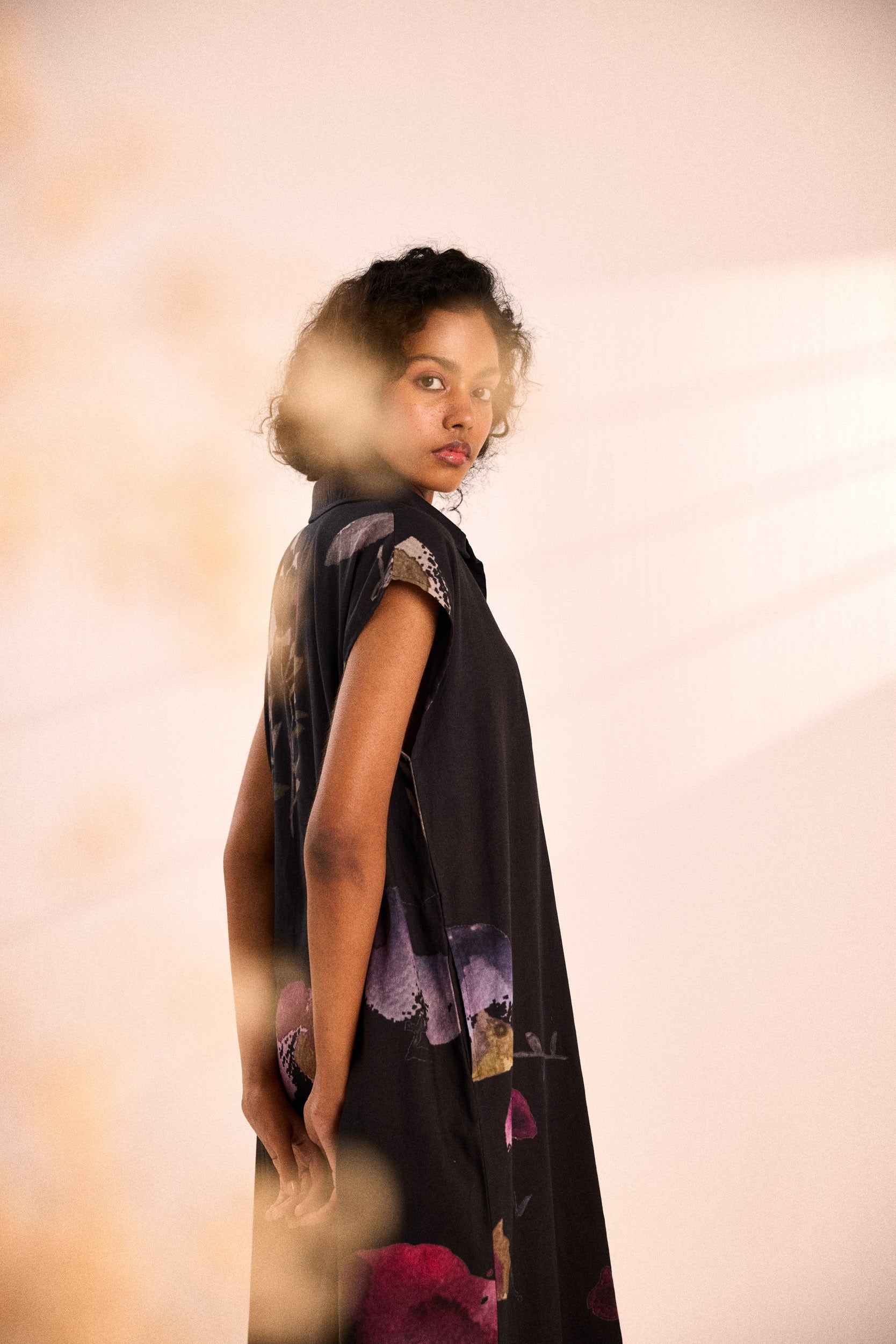 A relaxed cap-sleeved midi dress in mul cotton, adorned with painterly florals. The structured collar and buttoned placket add definition, while the flowing silhouette ensures ease.