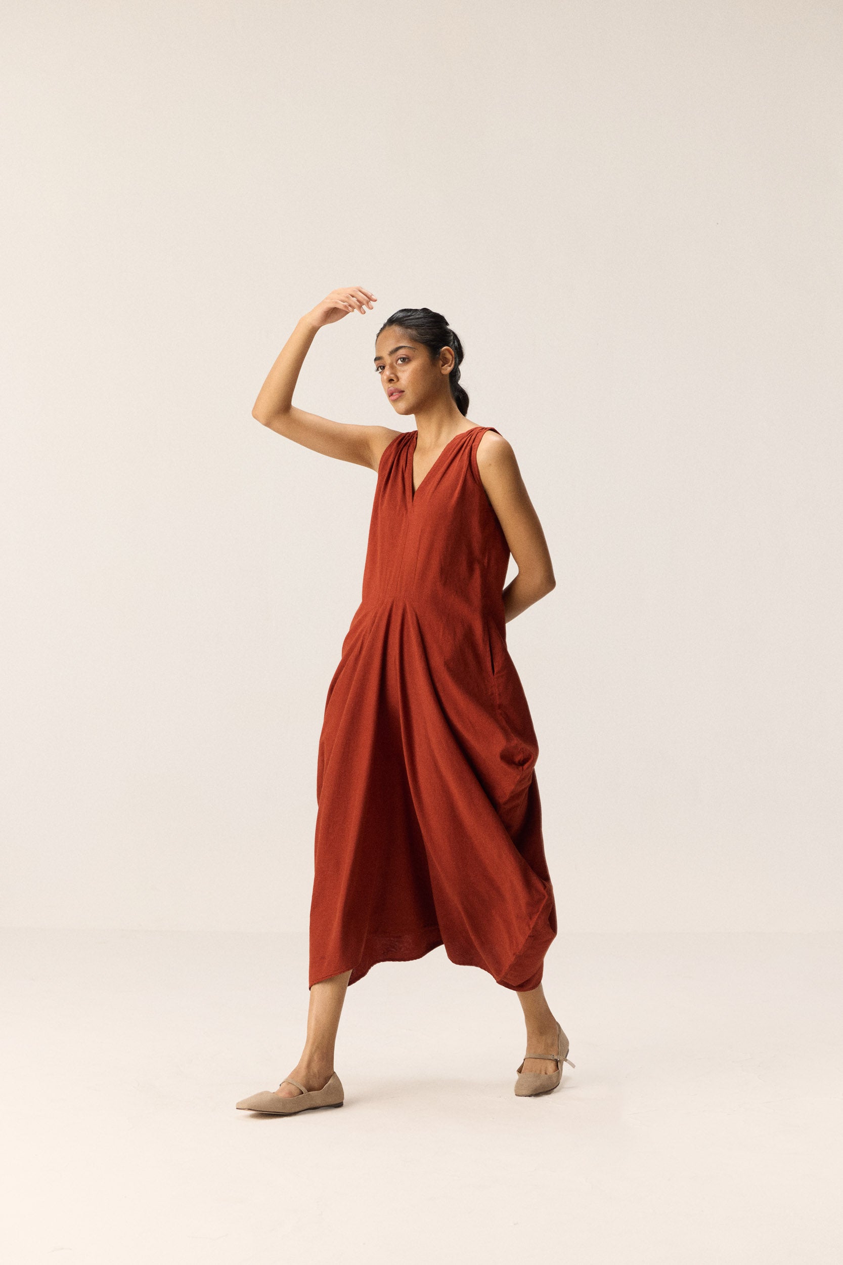 Crafted in soft, breathable cotton mul, this cowl dress drapes effortlessly in a rich brick red hue. Lightweight yet structured, it moves with ease and brings quiet sophistication to everyday dressing.
