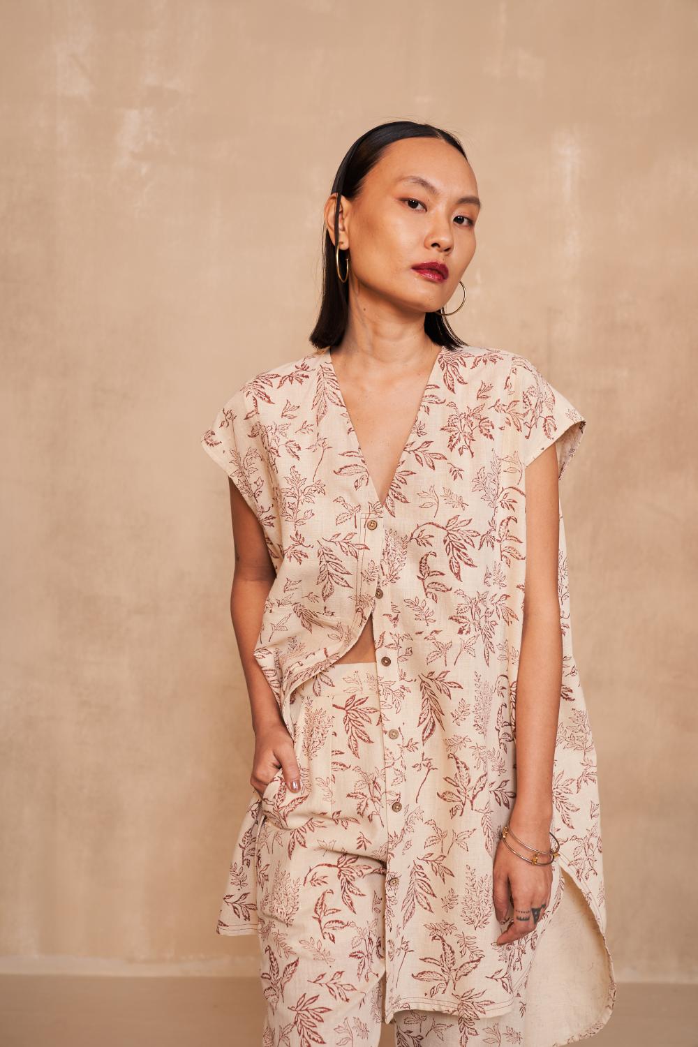 Relaxed fit, sleeveless, long kurta shirt buttoned in the front crafted in handwoven Kala cotton fabric, hand block printed with our signature New Beginnings motif using azo-free dyes. Timeless looks like this shirt are a must for conscious closets. Dress it up with jewelry and heels for when you go out, or keep it super simple for casual occasions.