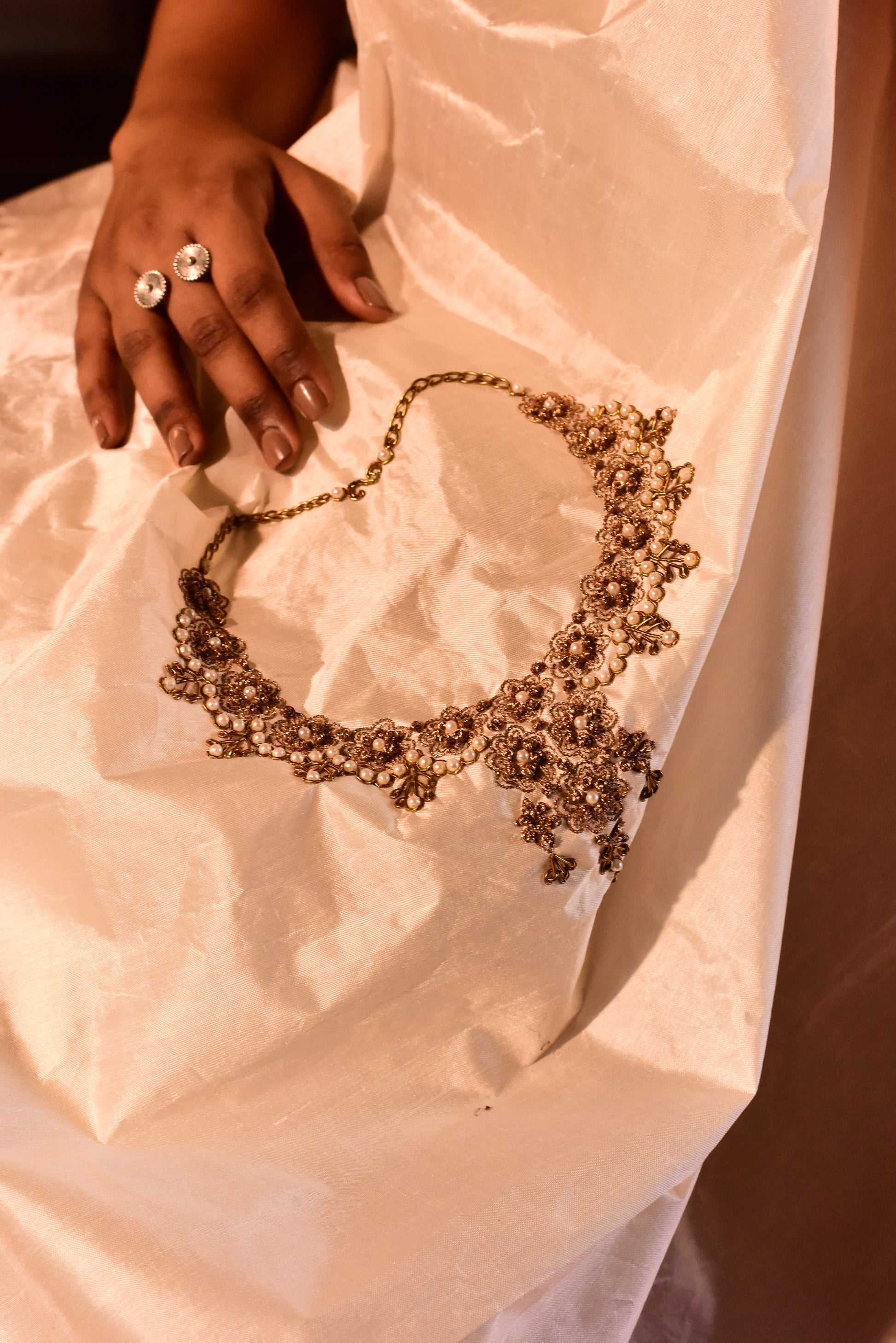 Hand woven Mulberry silk from Murshidabad with hand embroidered vintage (traditional Bengal jewelry). The Gawrod saree is quintessential Bengal saree for festivities and auspicious occasions. Much before Devdas or Kahani popularised this, this was synonymous to "Thakur Bawron" sharee which women would wear during Sindur Khela.